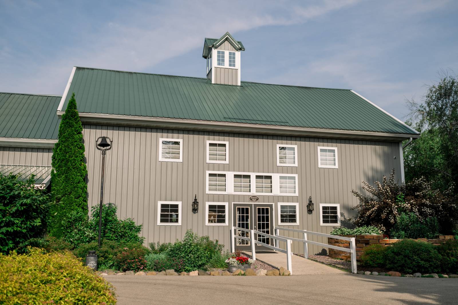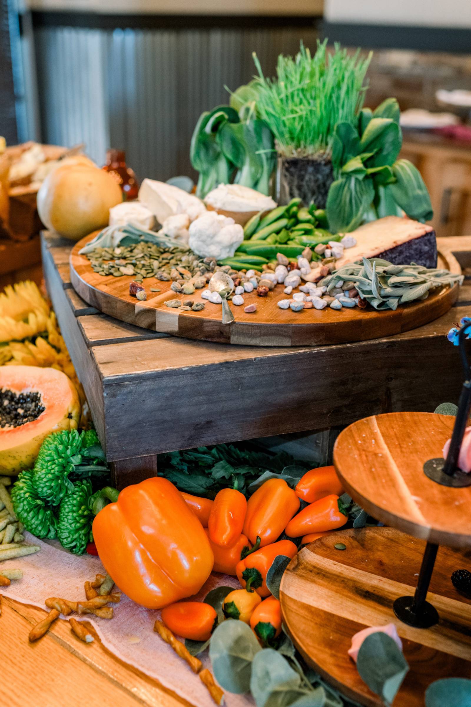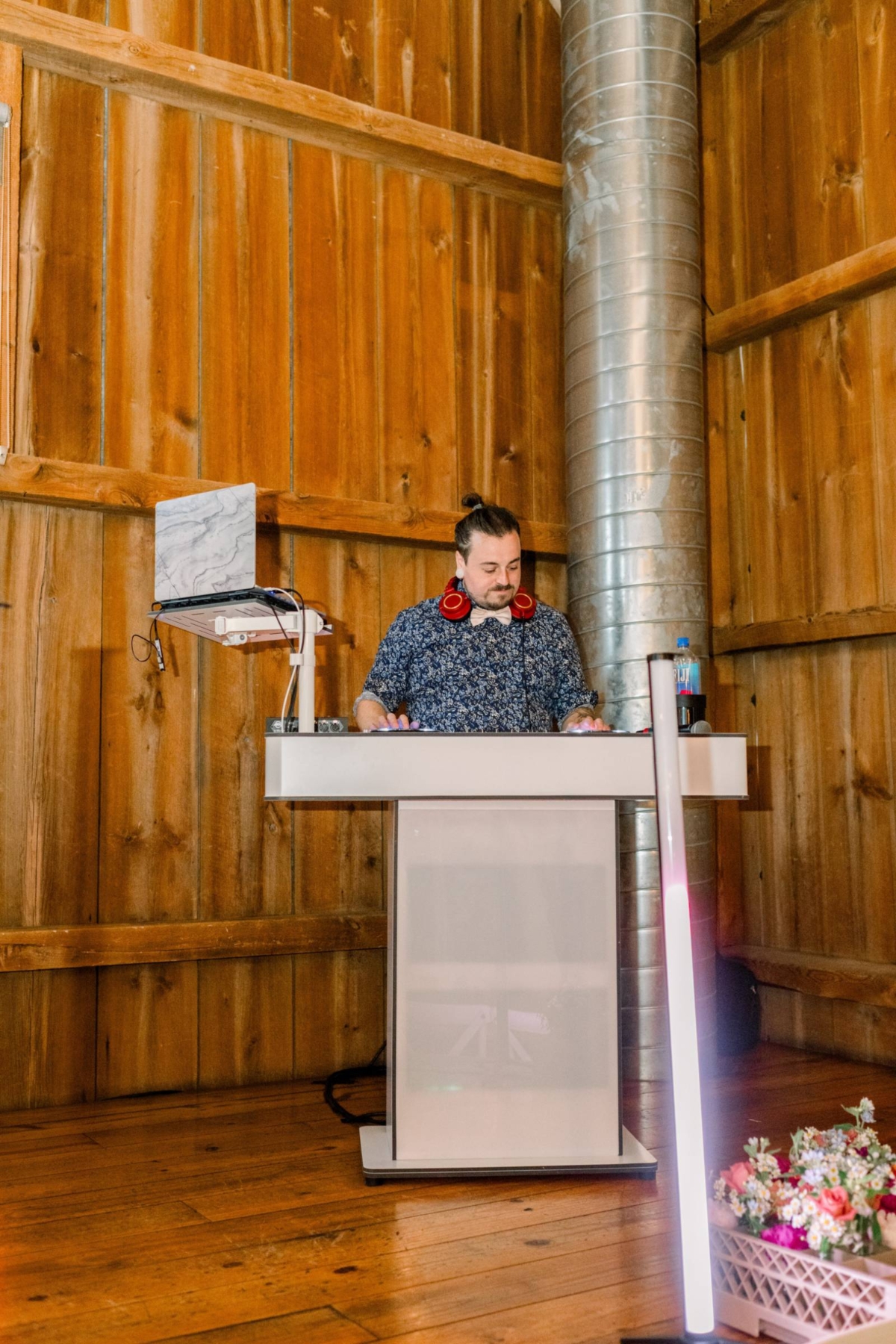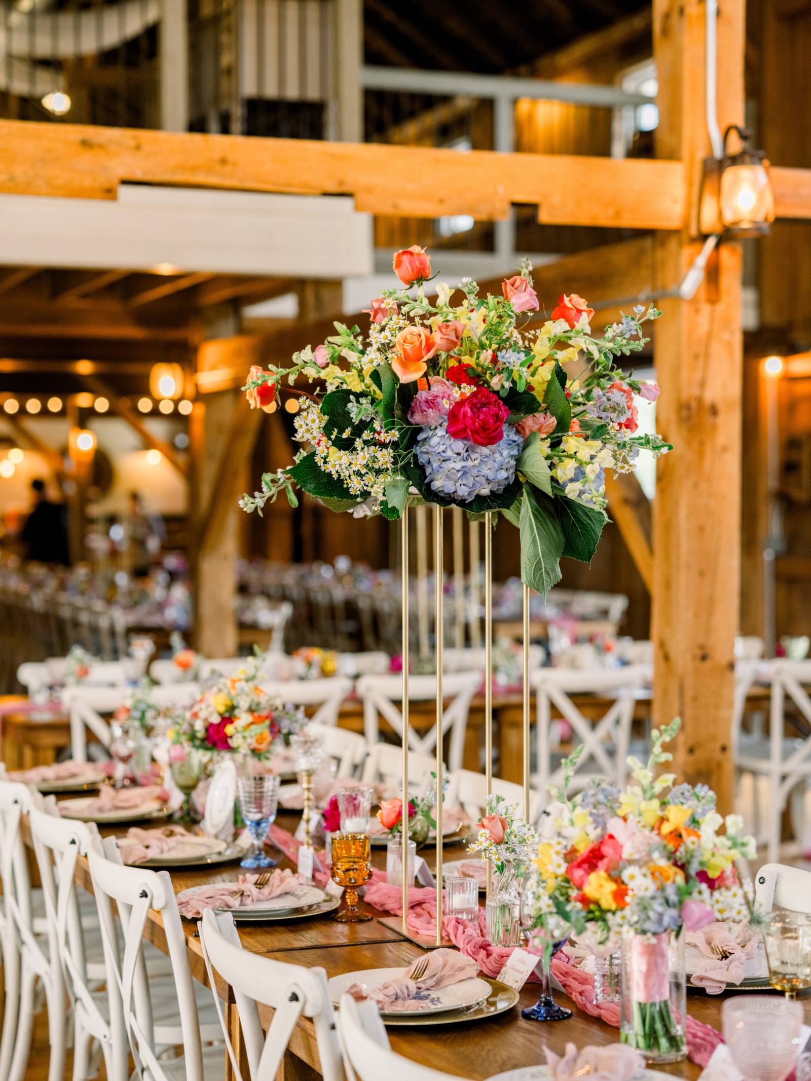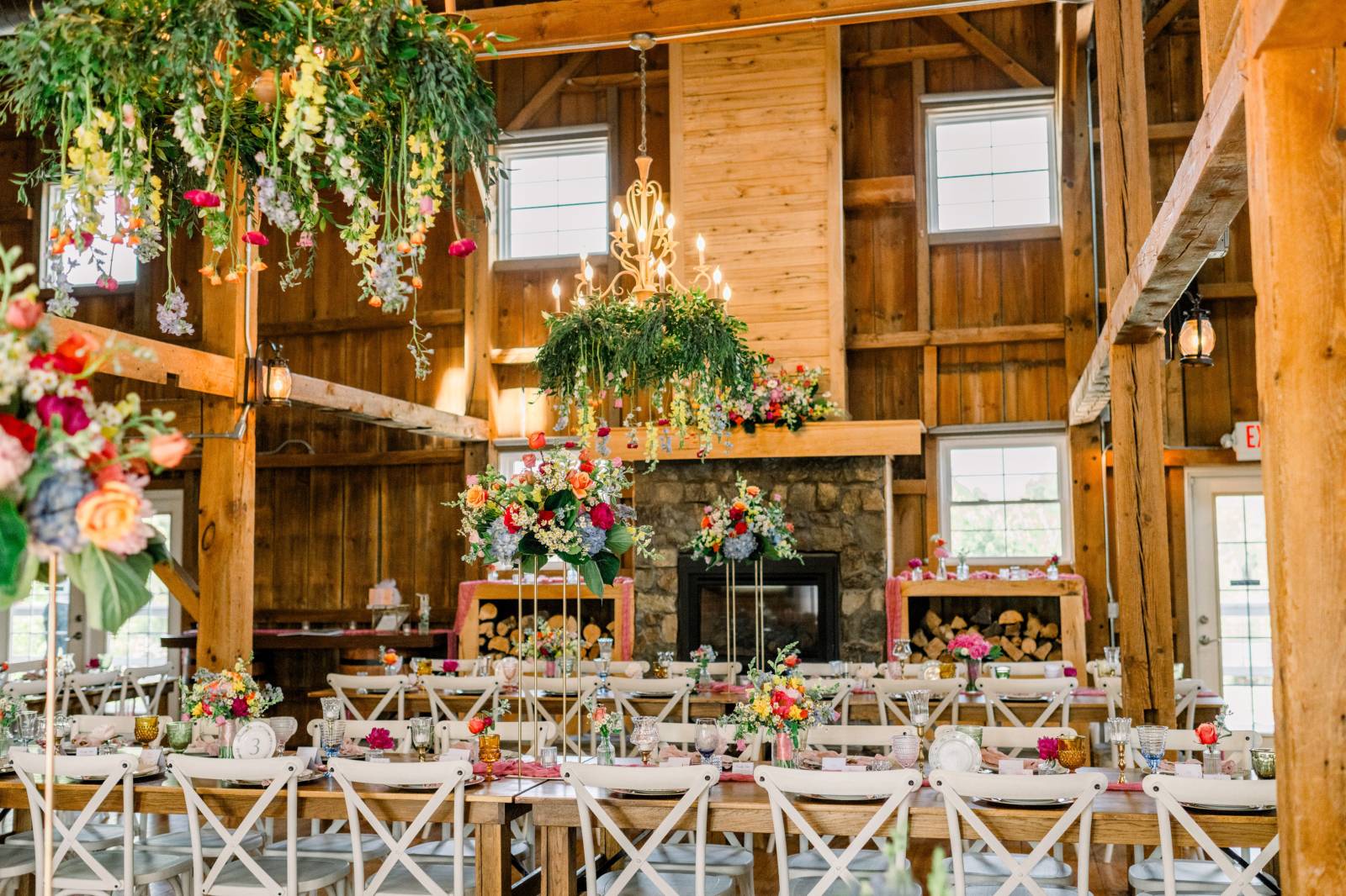 Melody Rose Designs continued the decor with floral arrangements ranging from bud vases to towering floral centerpieces. The barn’s chandeliers also dripped with greenery and long-stemmed flowers, creating a whimsical hanging installation.