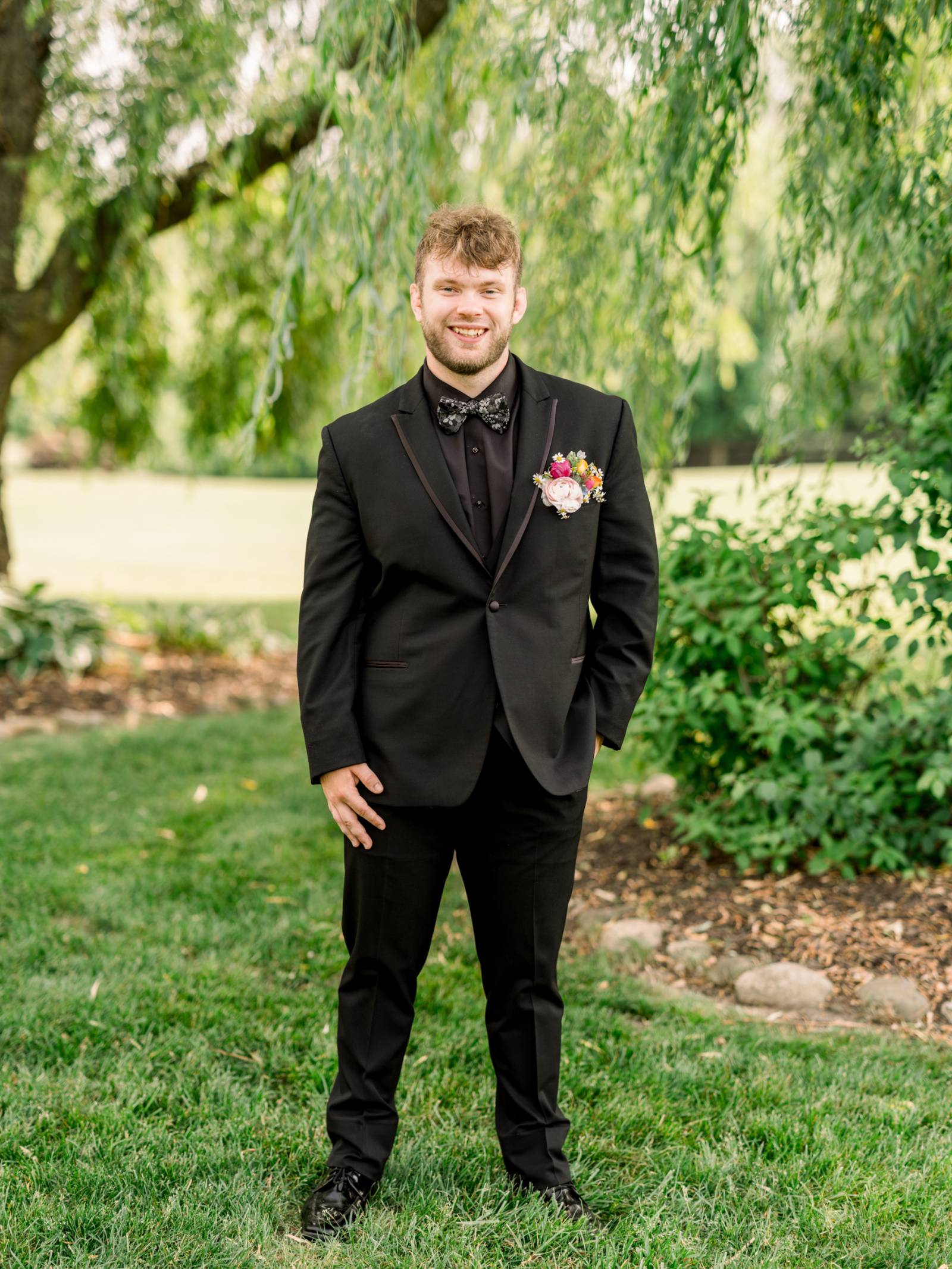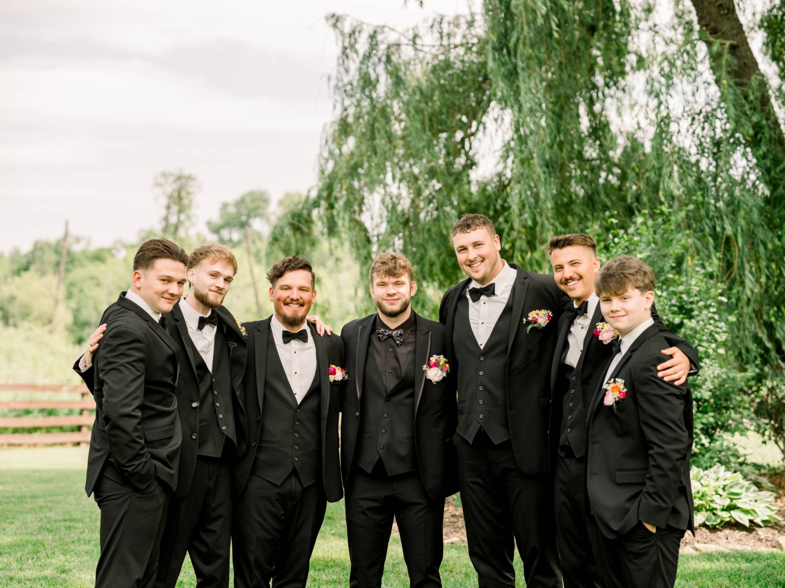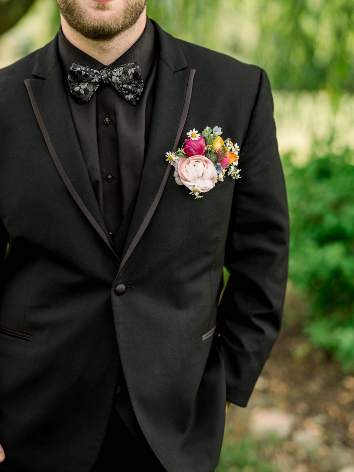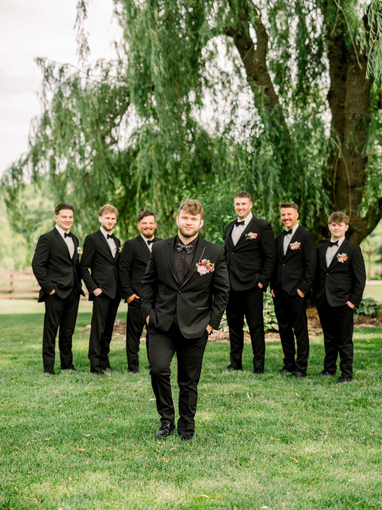 Cam and his groomsmen wore black suits from DuBois Formalwear. His groomsmen and ushers wore black vests, white undershirts, black shoes, and black bow ties. Cam coordinated in a black suit with a satin lapel lining, a black undershirt, and a patterned bow tie.