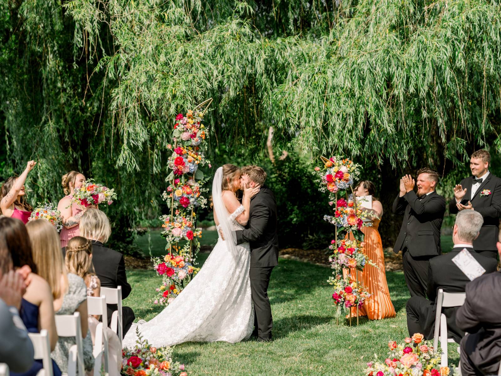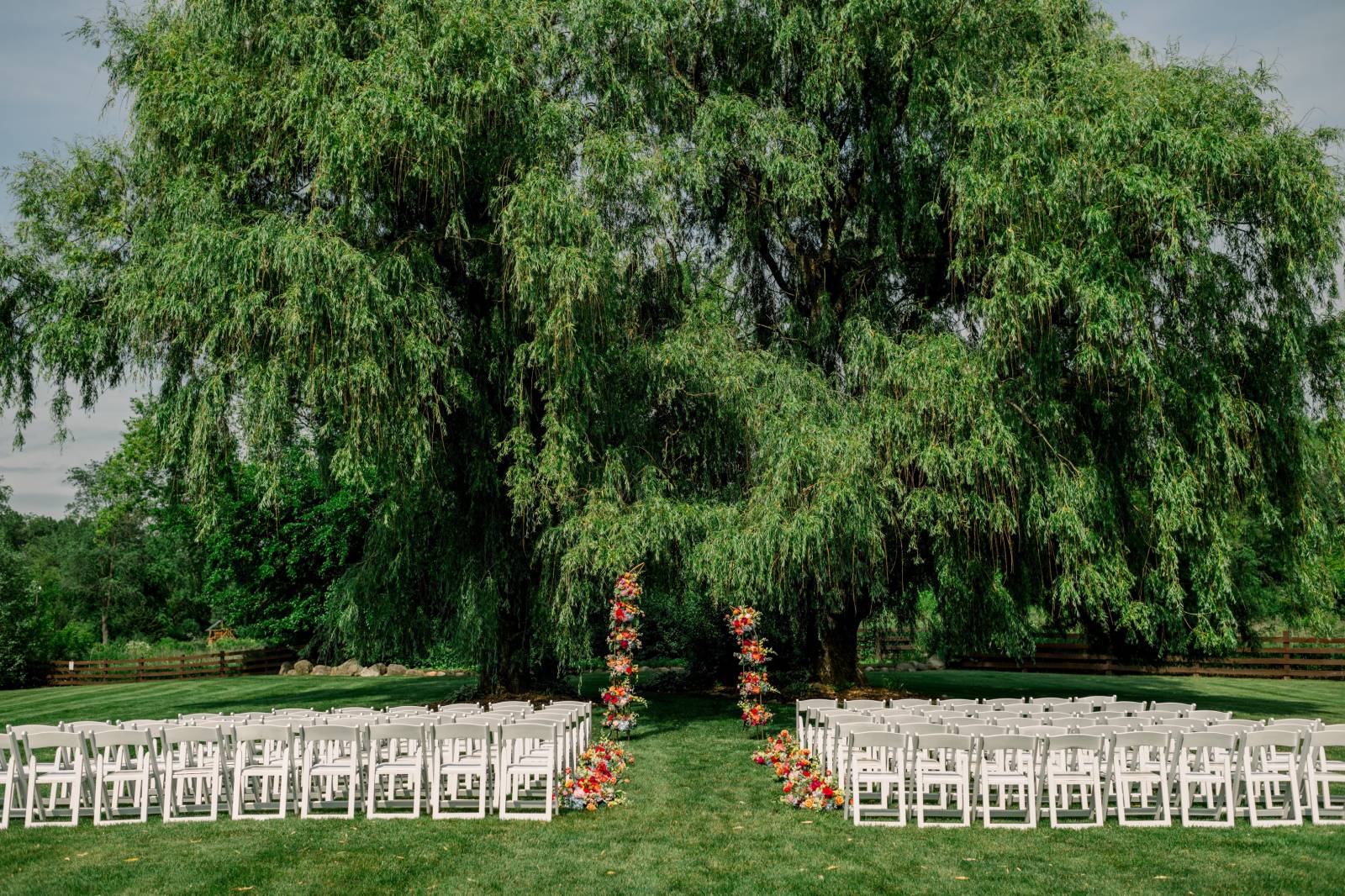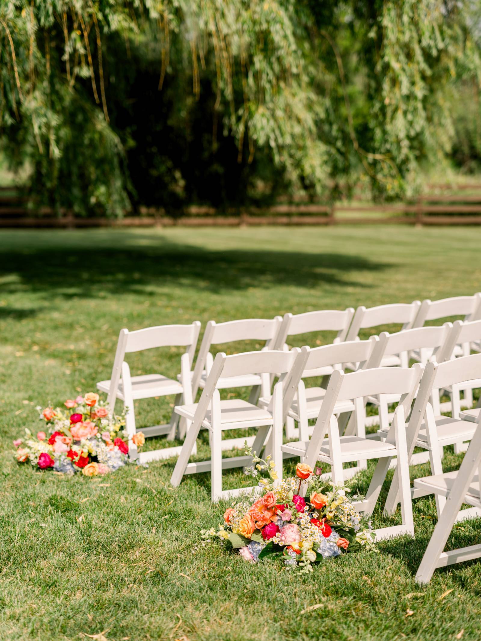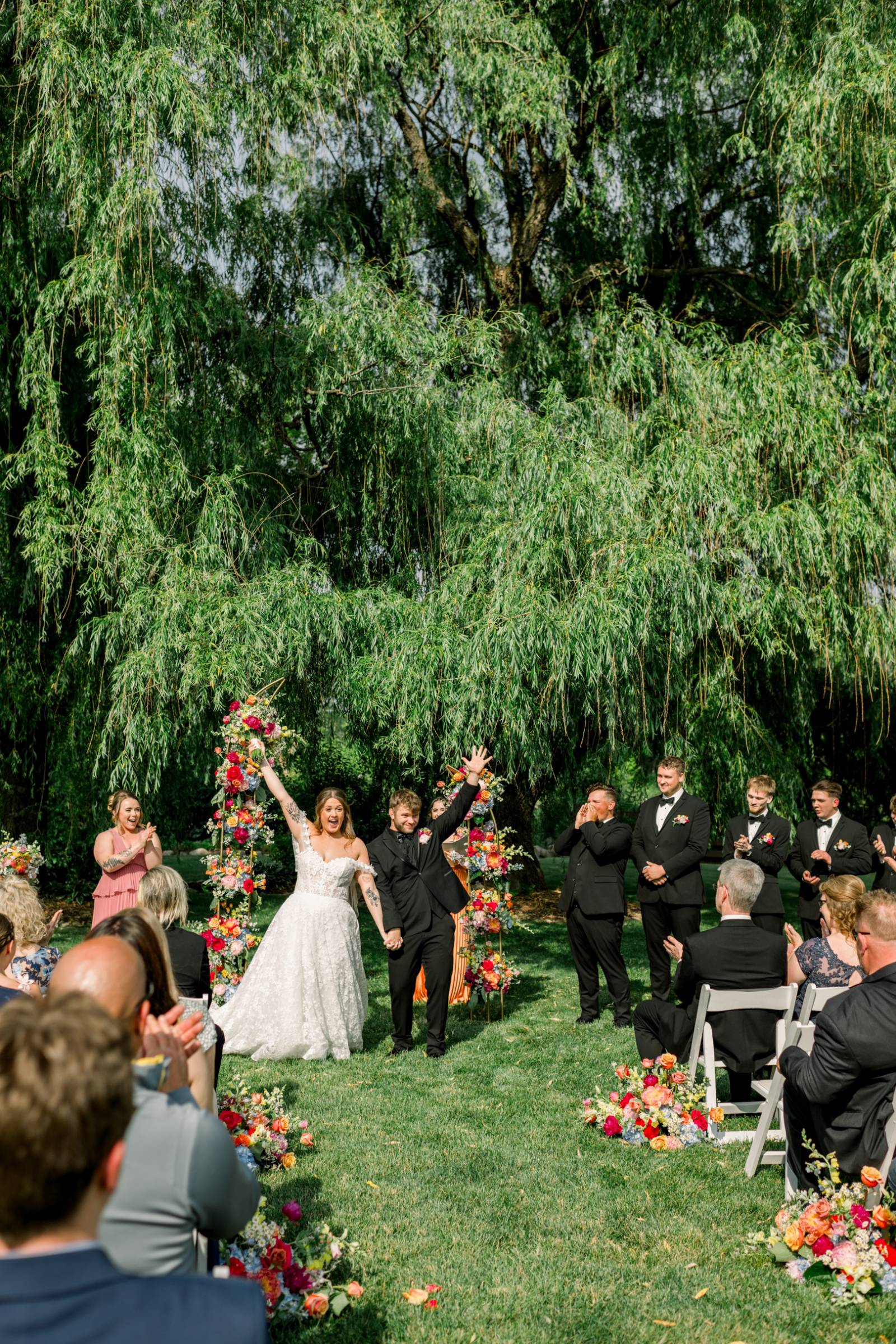 The ceremony, set beneath a pair of weeping willow trees, also featured an abstract, broken floral arch backdrop, white wooden chairs, and florals lining the aisle. Exchanging vows was Jenna’s most cherished moment of the day, and, while she couldn’t help but cry the whole time, the tears were purely heartfelt and joyful.