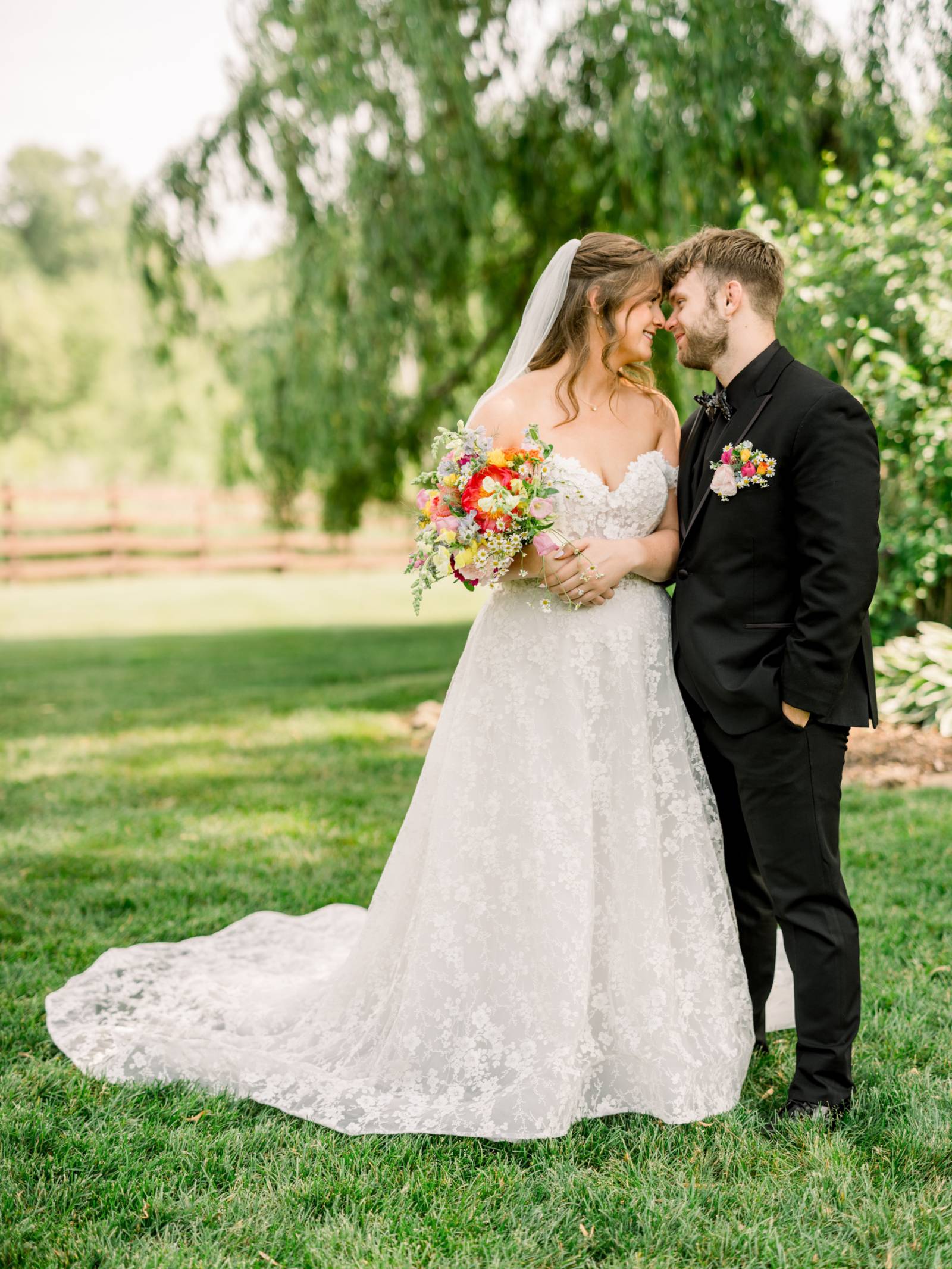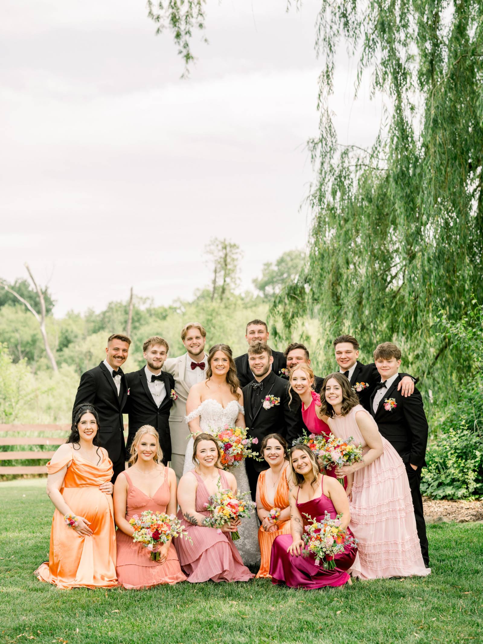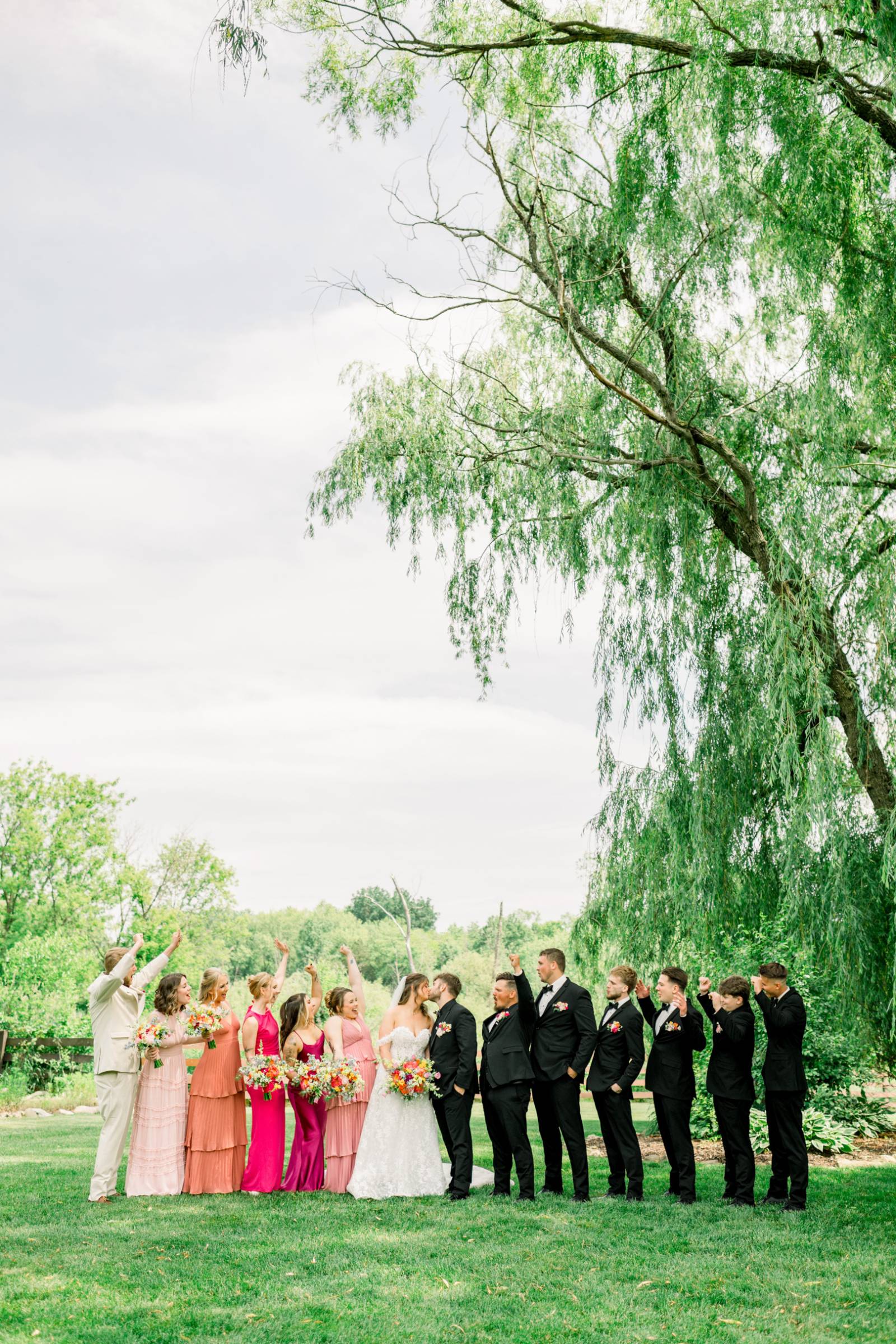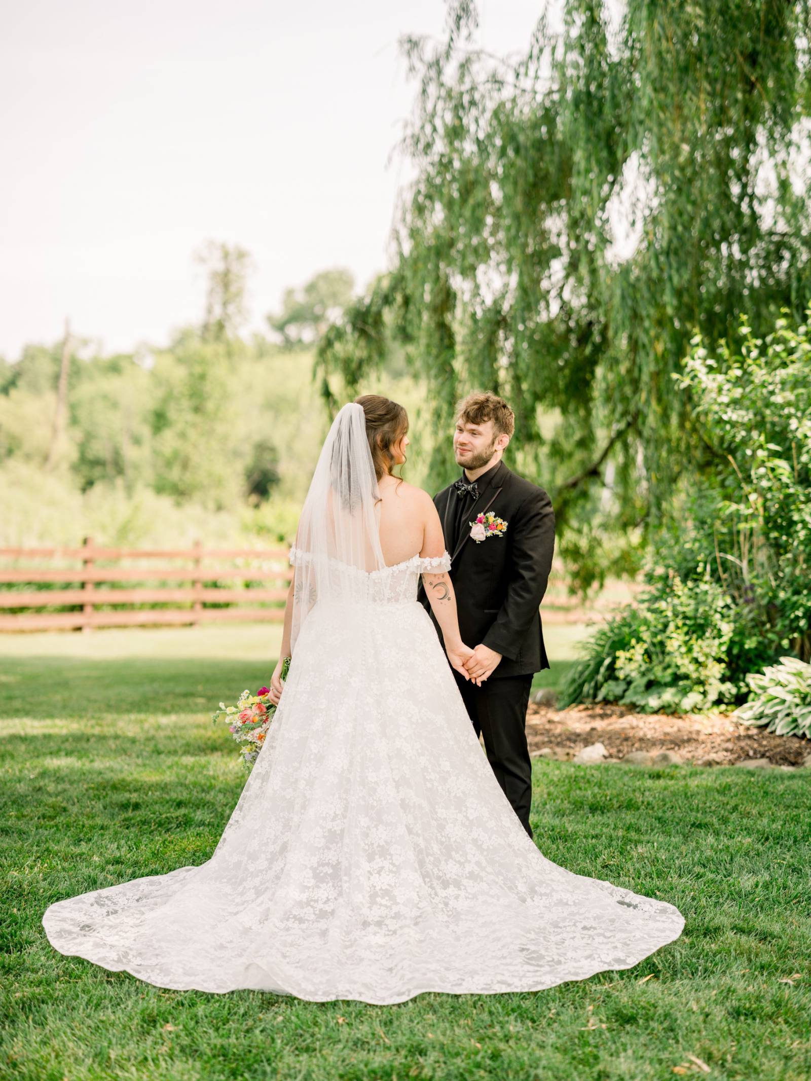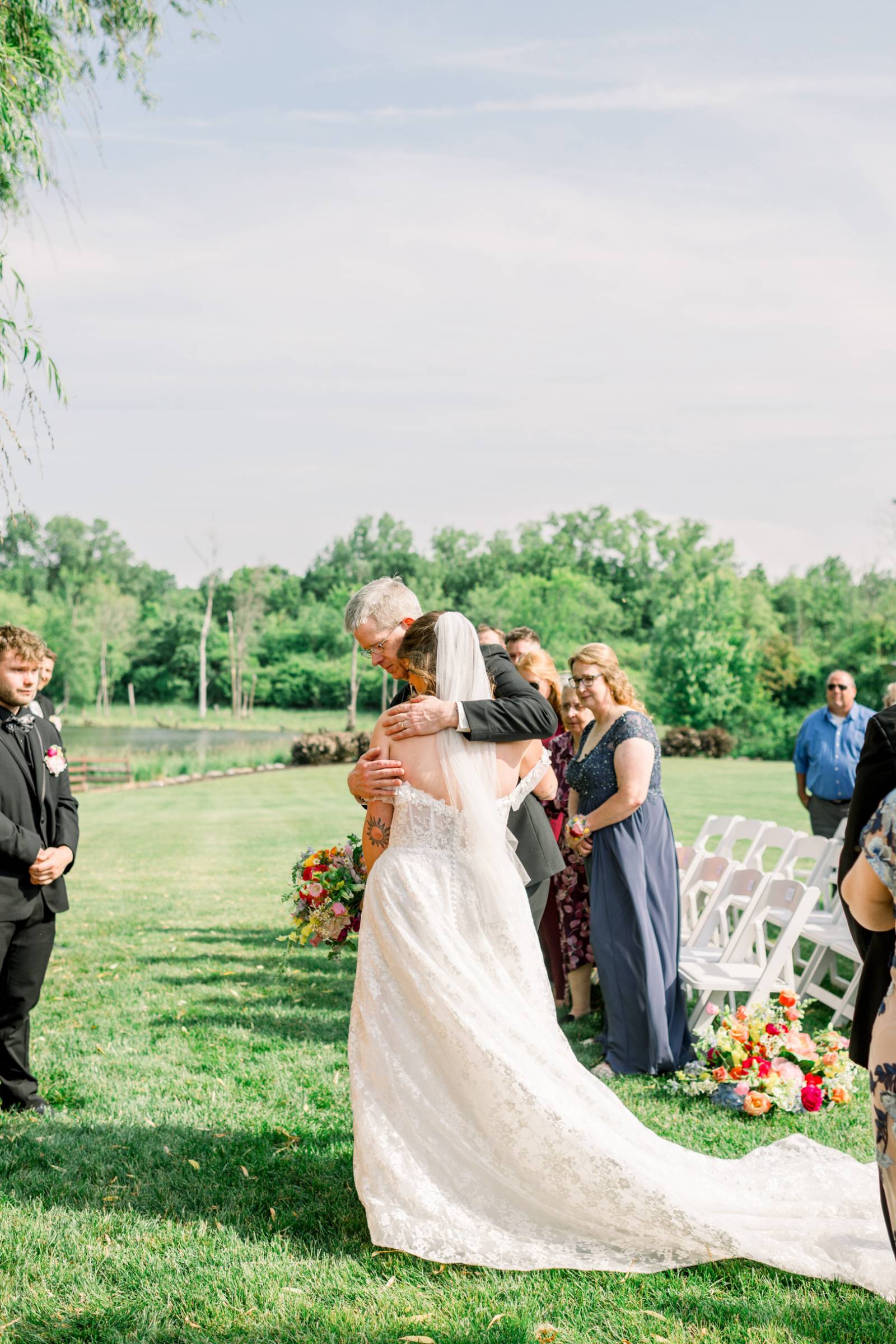 The ceremony, set beneath a pair of weeping willow trees, also featured an abstract, broken floral arch backdrop, white wooden chairs, and florals lining the aisle. Exchanging vows was Jenna’s most cherished moment of the day, and, while she couldn’t help but cry the whole time, the tears were purely heartfelt and joyful.