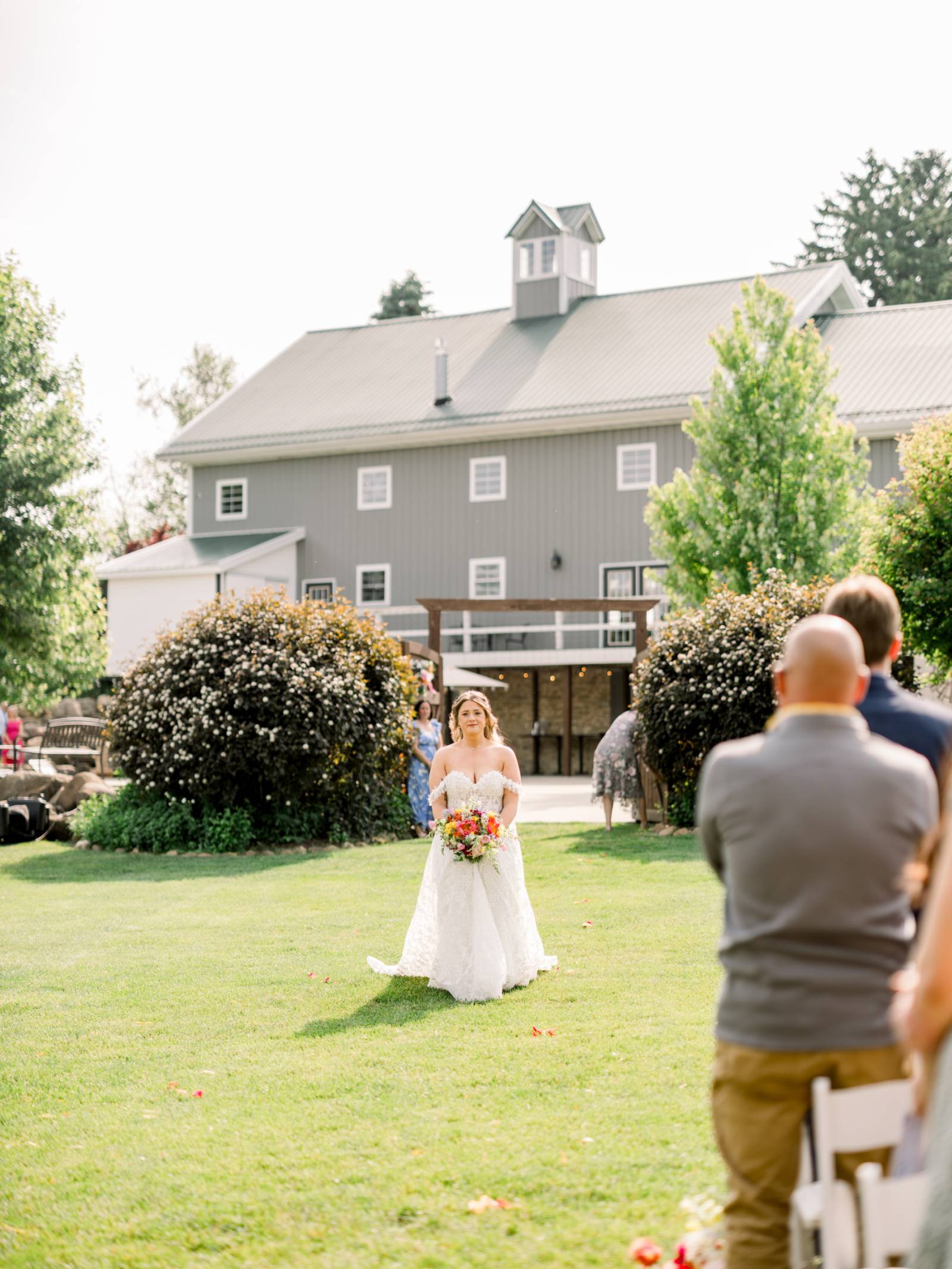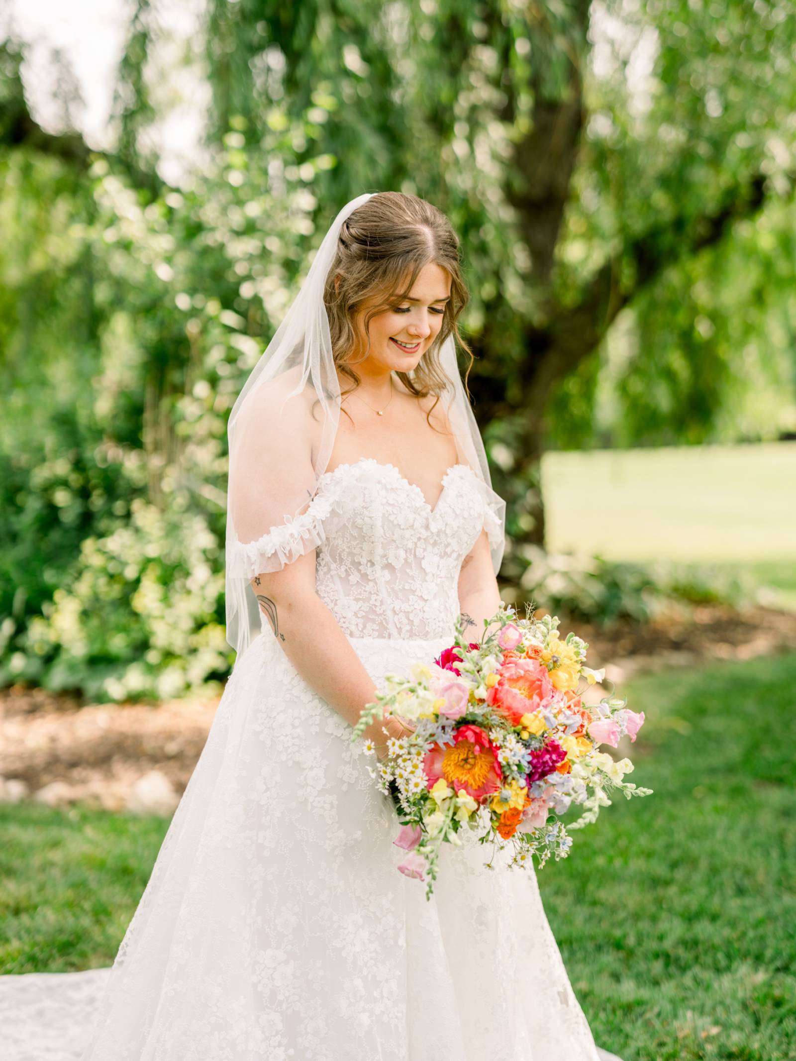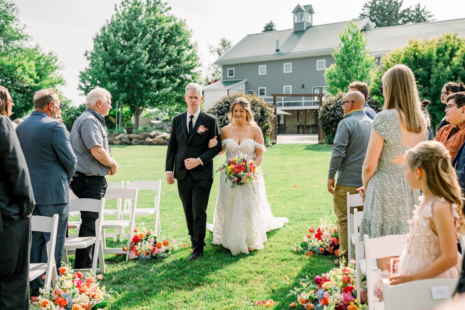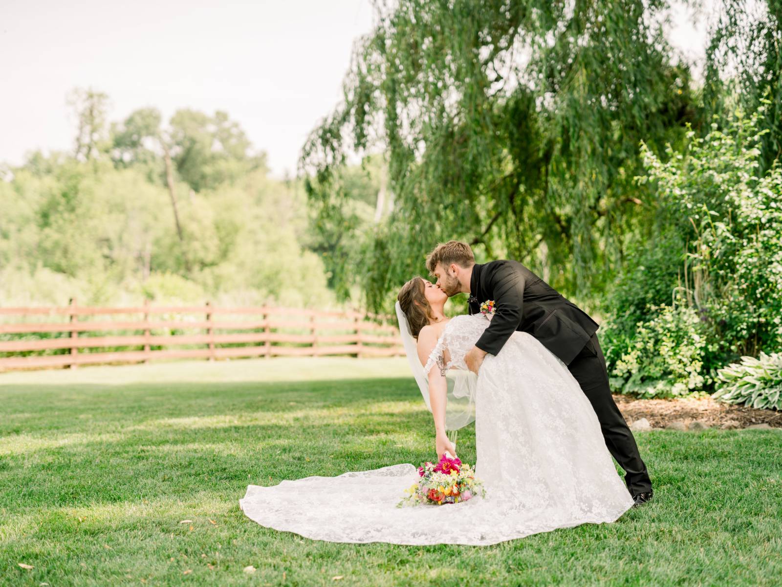 The ceremony, set beneath a pair of weeping willow trees, also featured an abstract, broken floral arch backdrop, white wooden chairs, and florals lining the aisle. Exchanging vows was Jenna’s most cherished moment of the day, and, while she couldn’t help but cry the whole time, the tears were purely heartfelt and joyful.