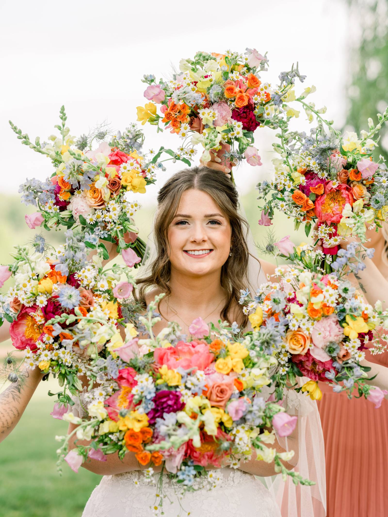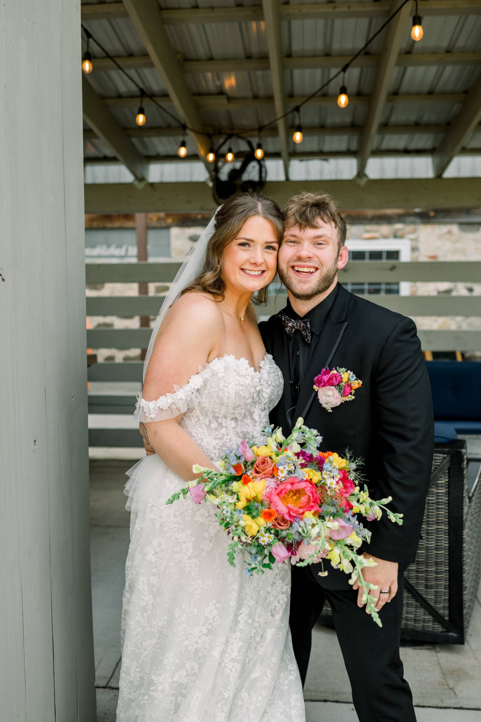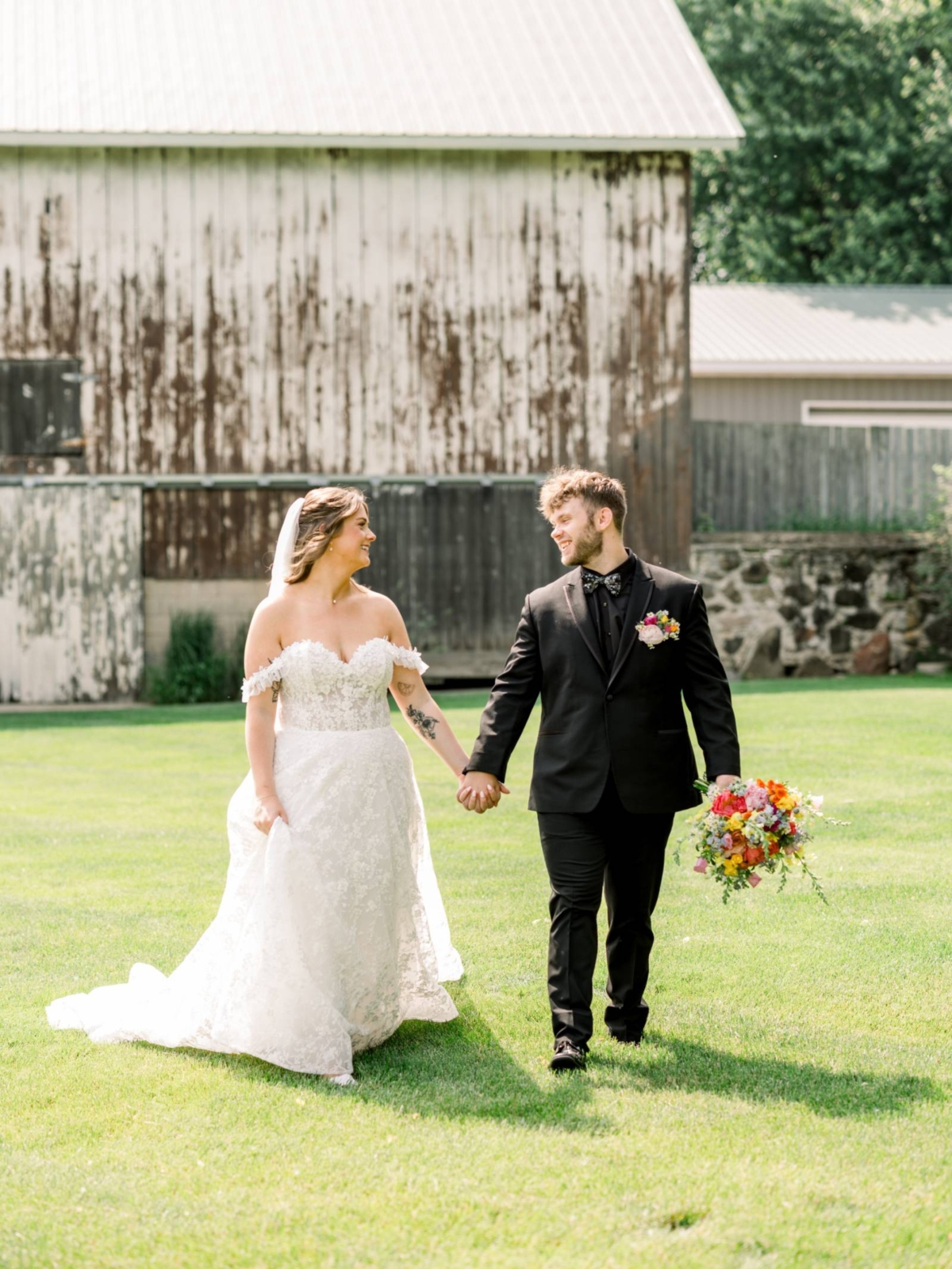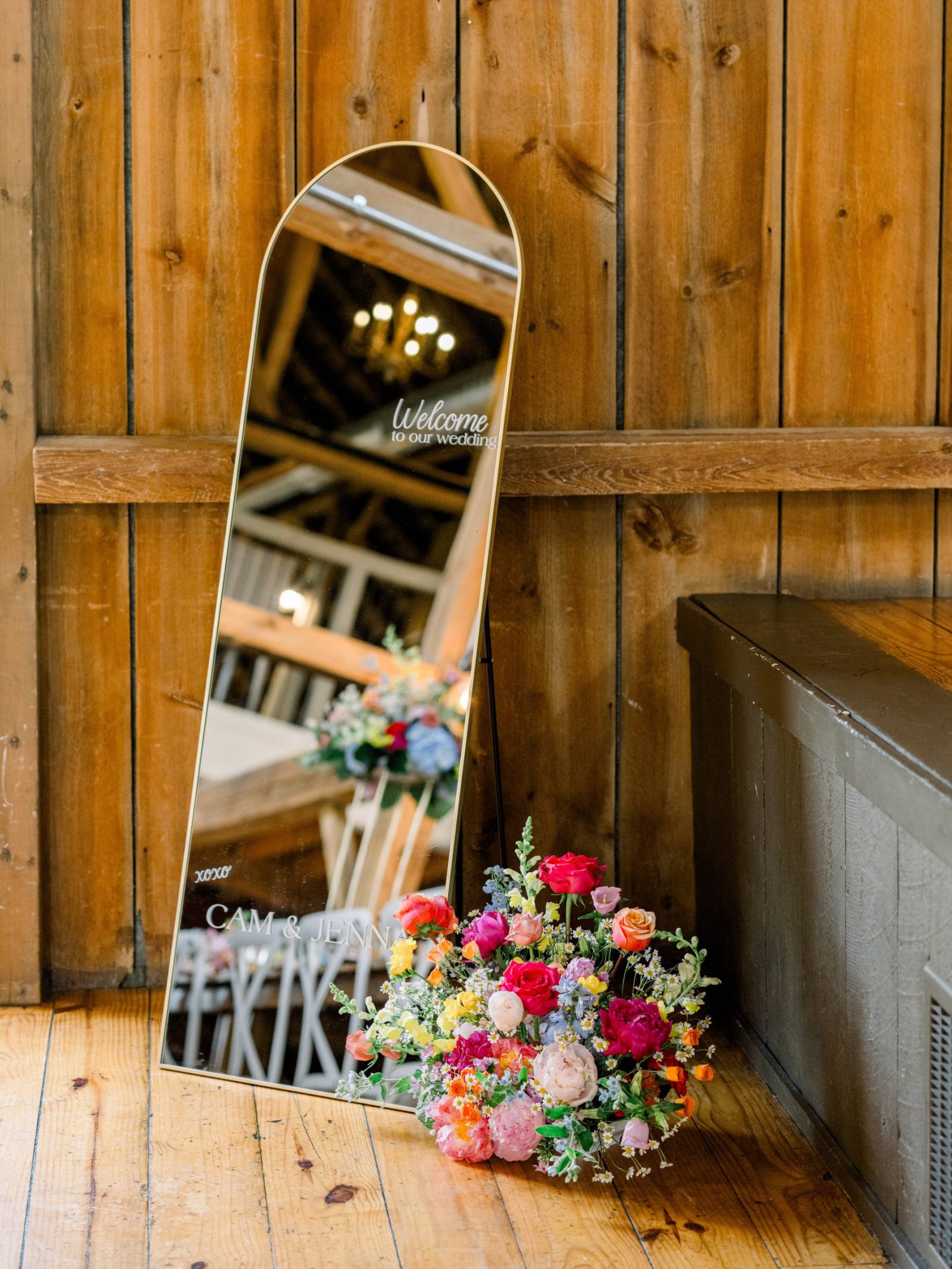 Florals and floral installations elevated every corner of Harvest Moon Pond, a stunning local barn venue with beautiful indoor and outdoor settings. At their outdoor ceremony, Jenna and her bridesmaids carried bright, cheerful bouquets including a wide array of colors and blooms. Cam and his groomsmen also wore pocket florals for a fresh pop of color to their black-tie attire.