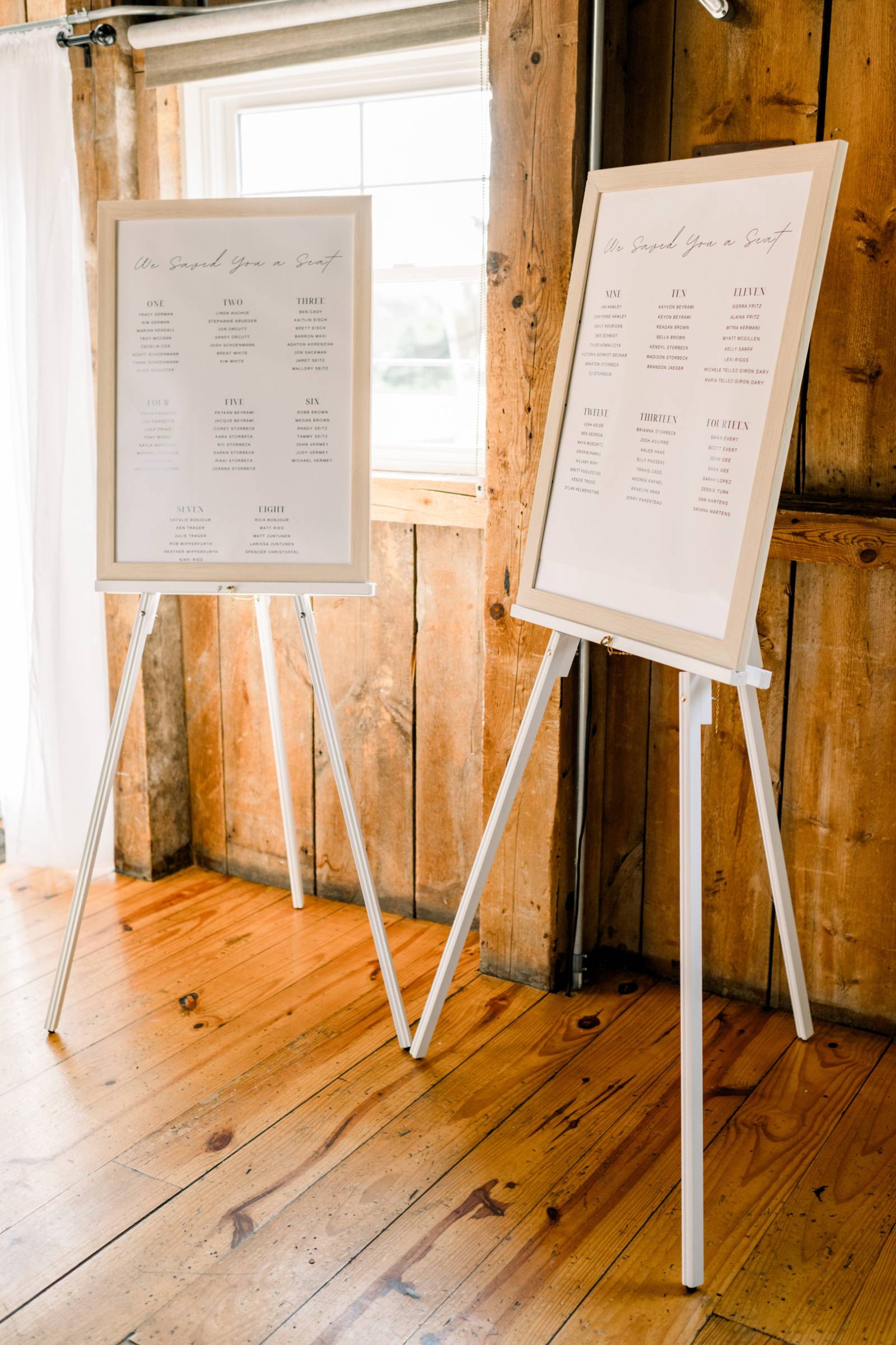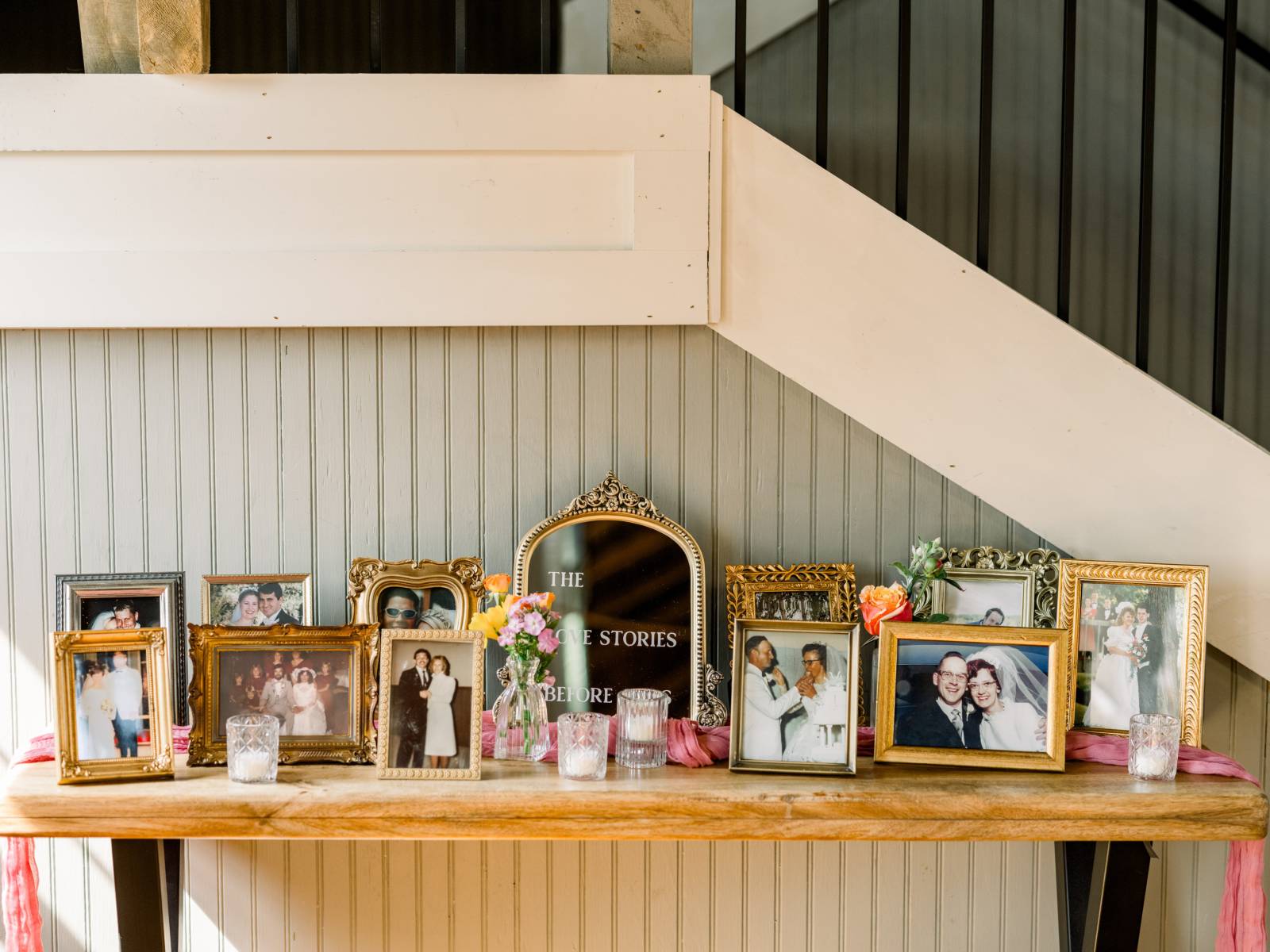 Inside the barn, the tables were set for the reception. Guests were greeted with a welcome sign beside a sentimental "Love Stories Before Ours" table, which included framed photos from Jenna and Cam's relatives' wedding days.