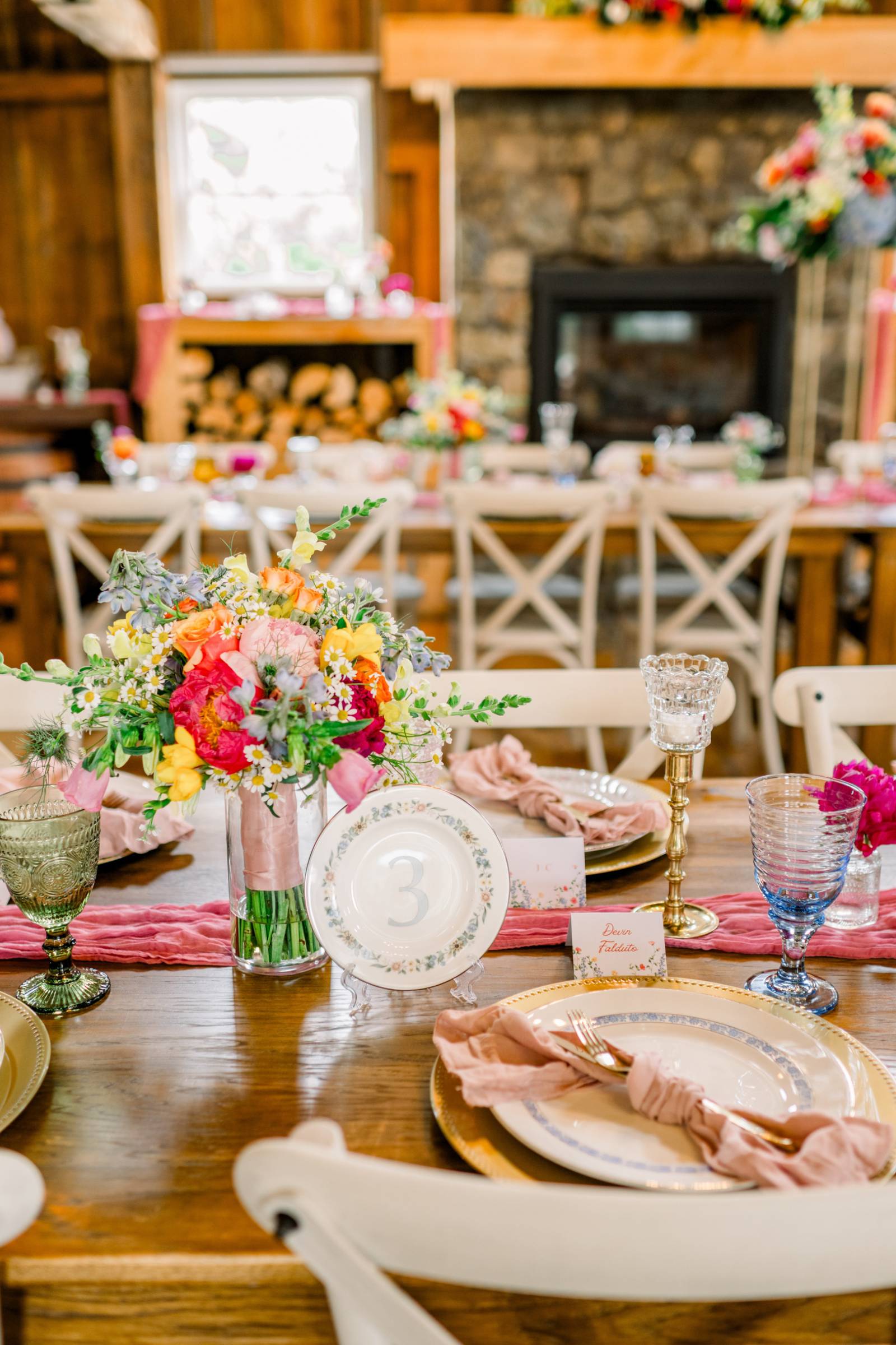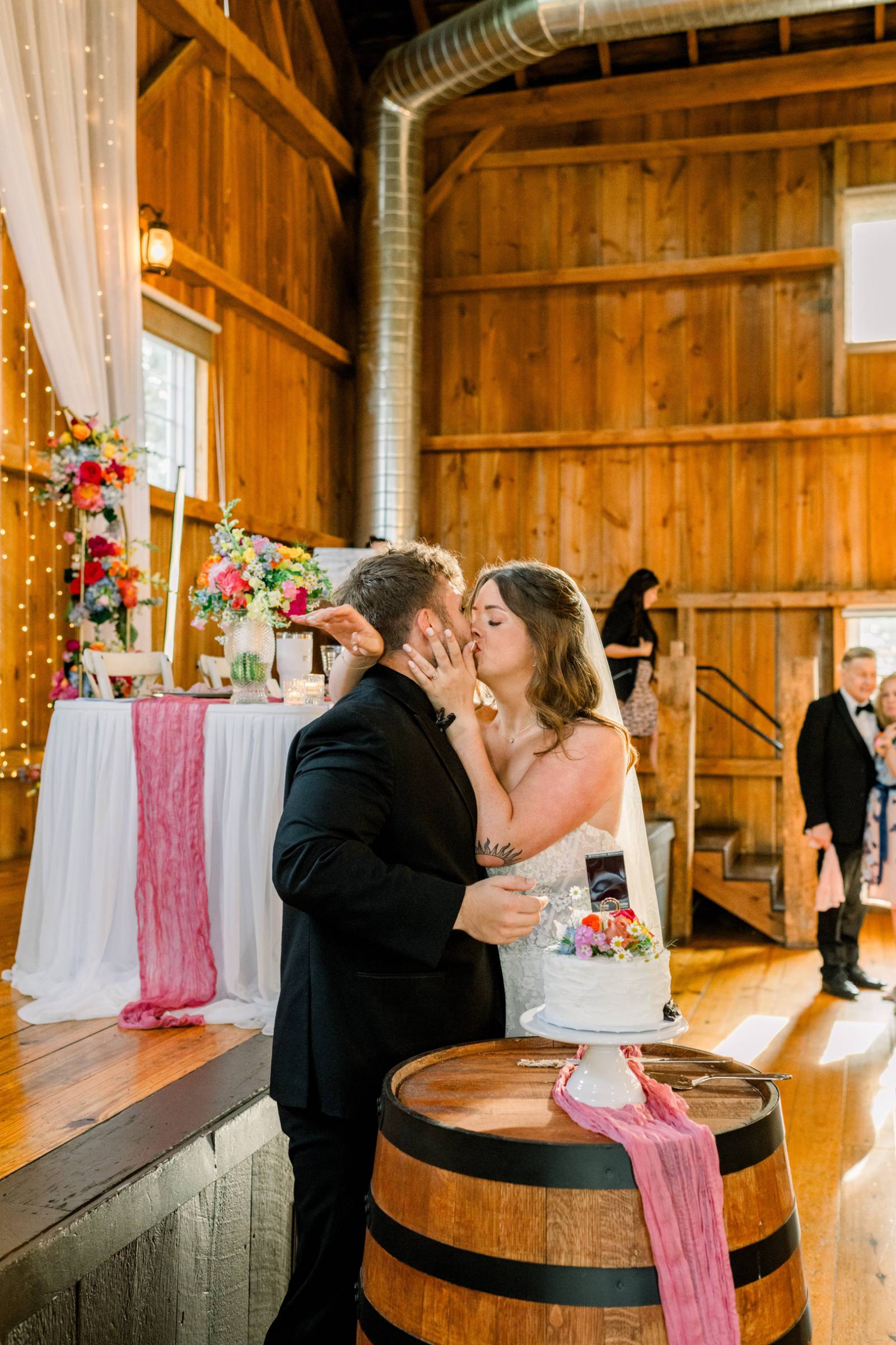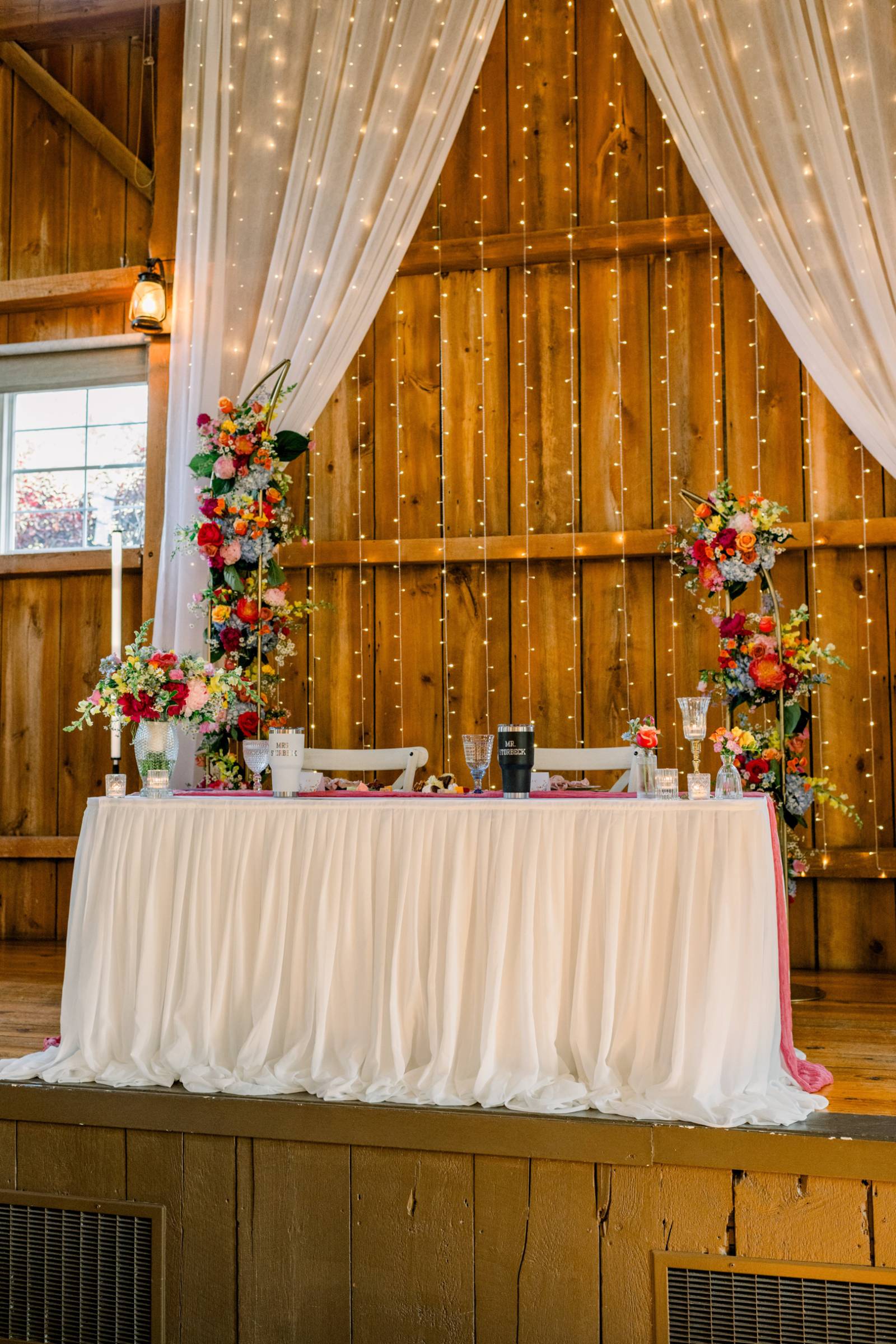 The tablescapes were light and airy, using the warm wooden tables as a base for gold chargers, vintage plates, crystal glassware, and pink table runners. Jenna and Cam had a sweetheart table on the barn stage, backlit by curtains and string lights.