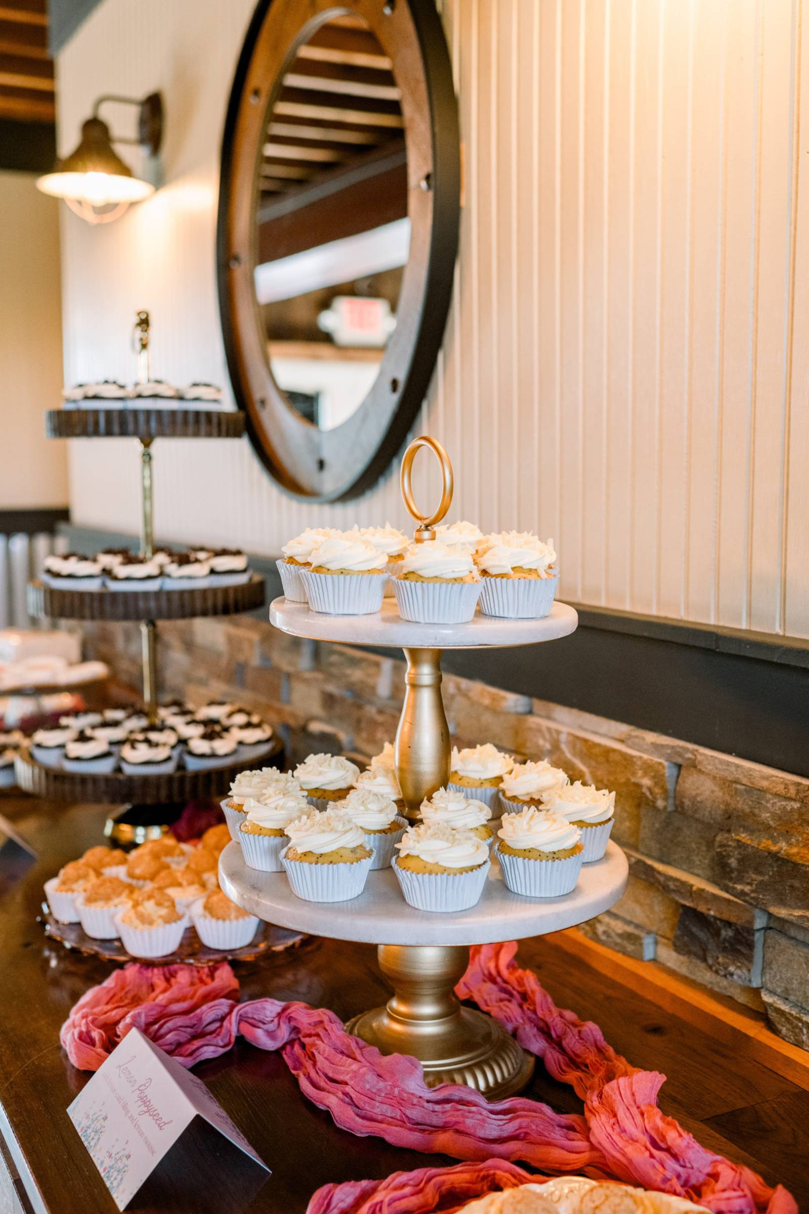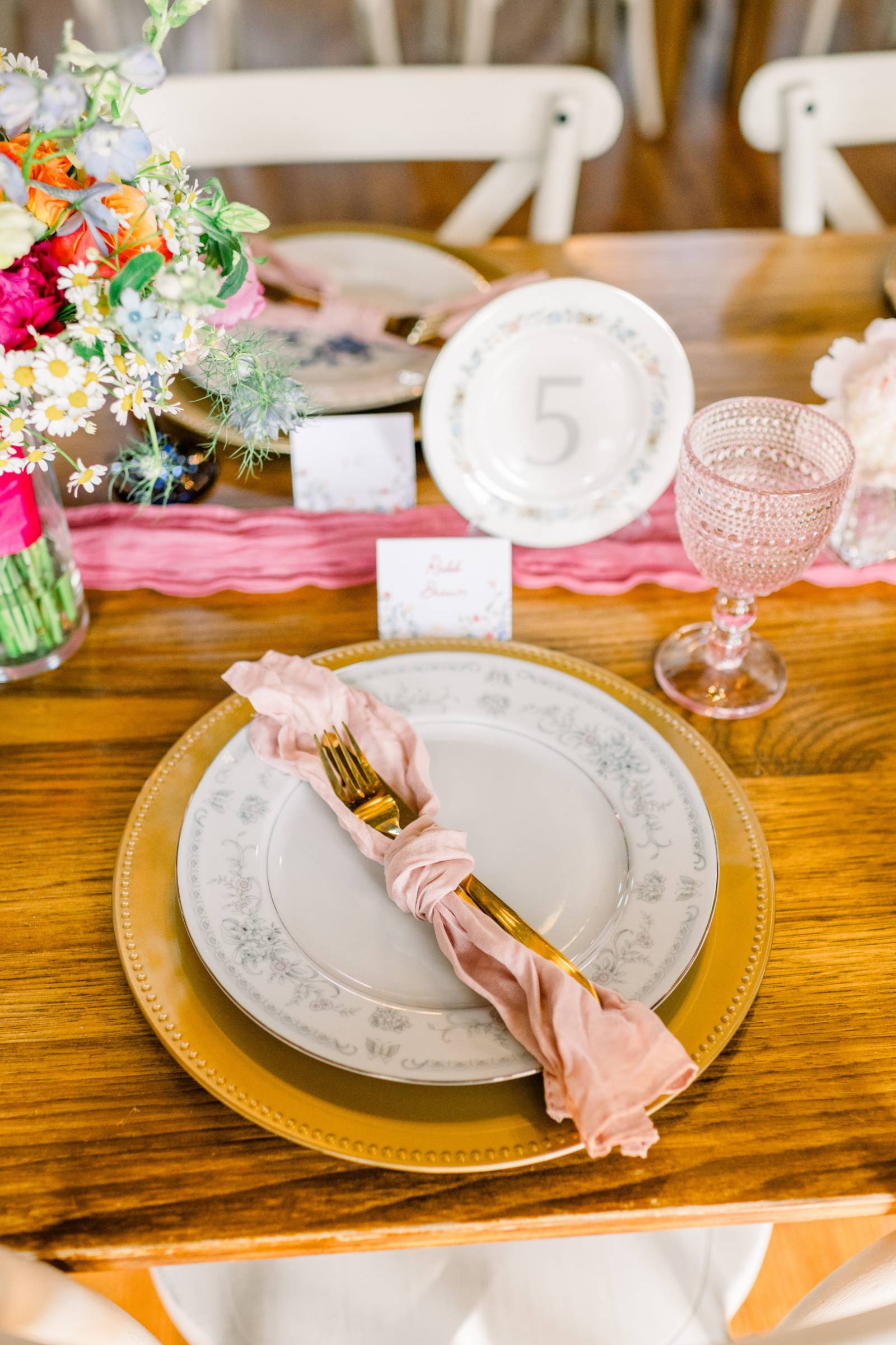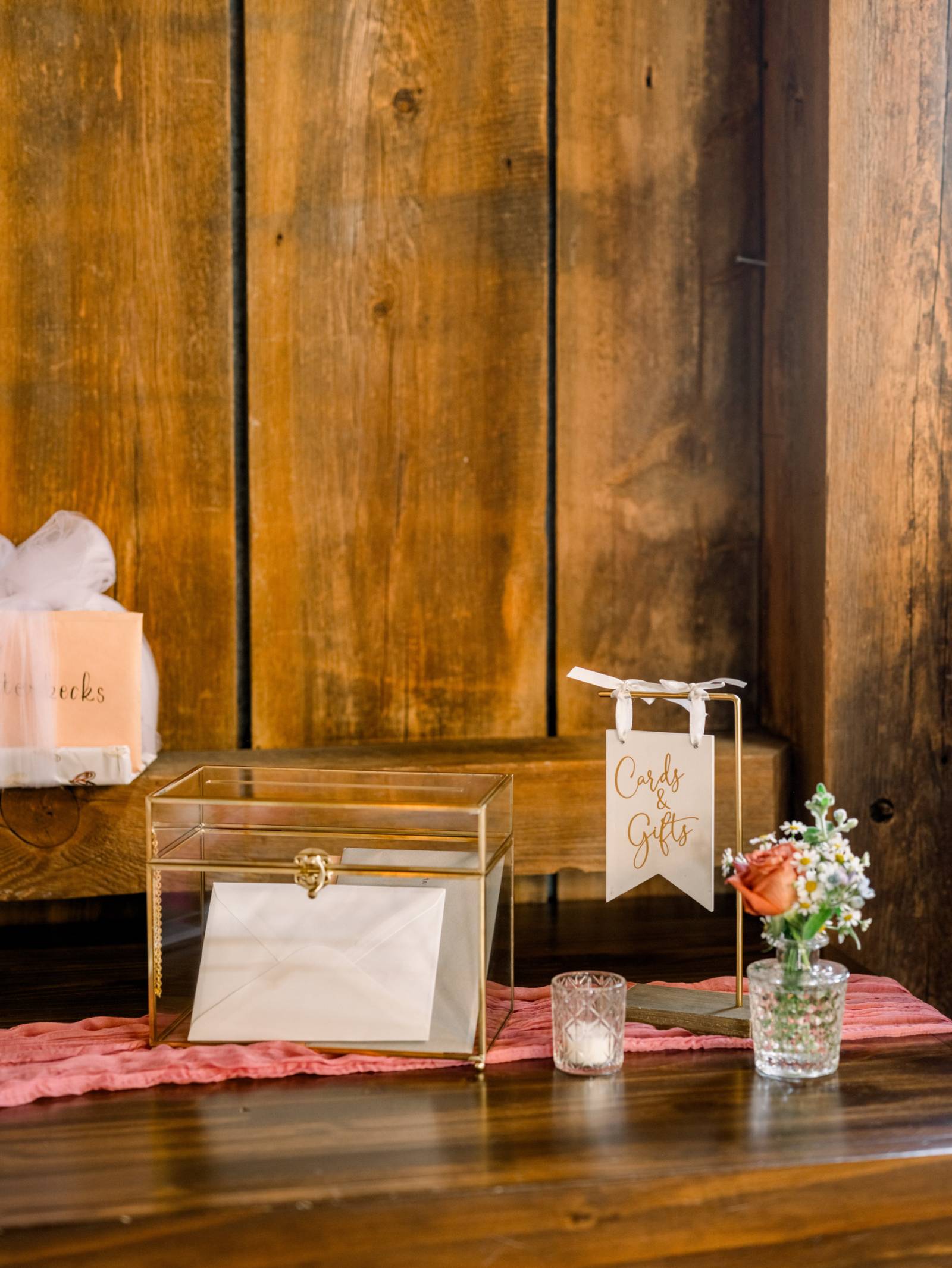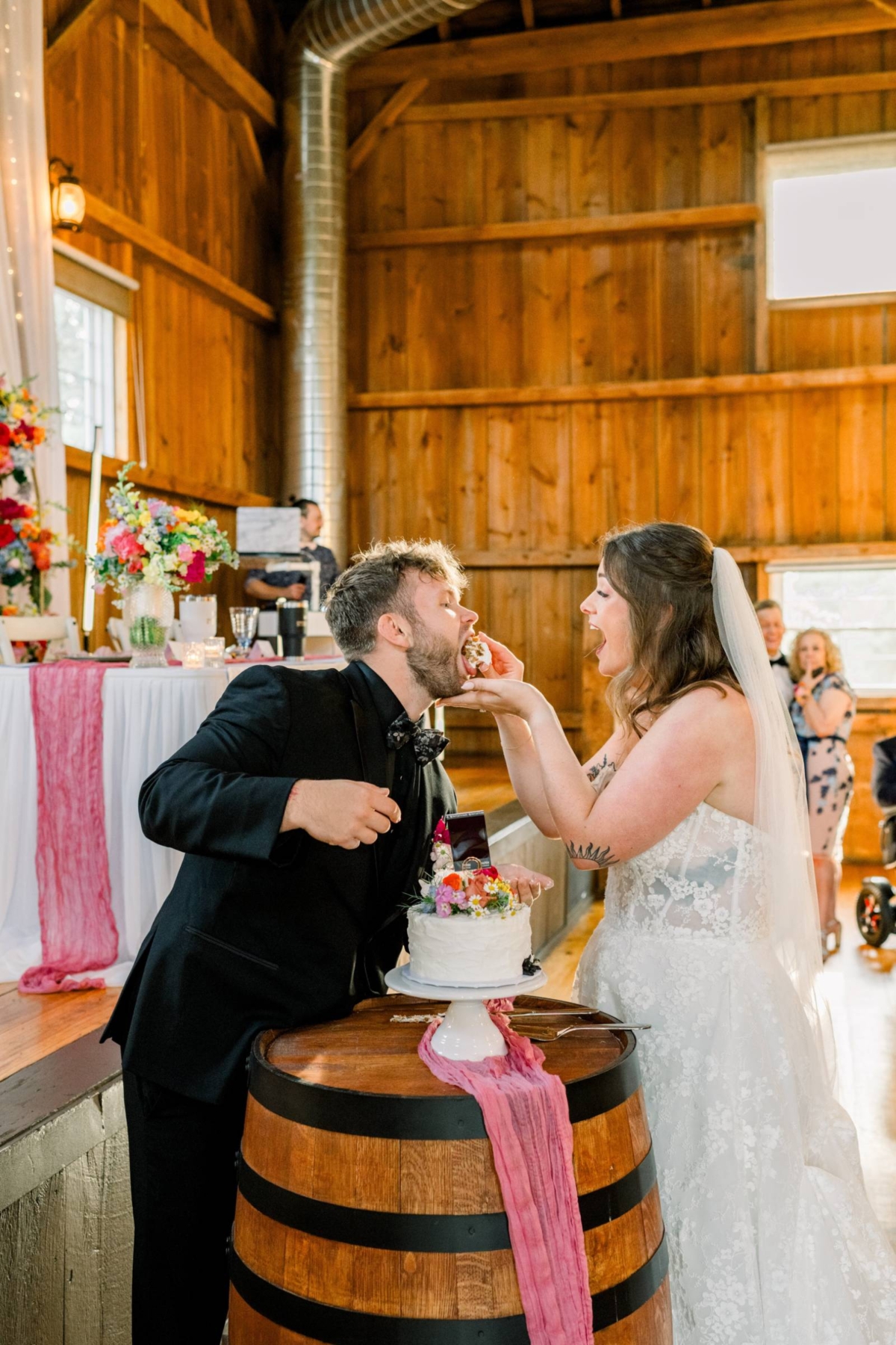 The tablescapes were light and airy, using the warm wooden tables as a base for gold chargers, vintage plates, crystal glassware, and pink table runners. Jenna and Cam had a sweetheart table on the barn stage, backlit by curtains and string lights.