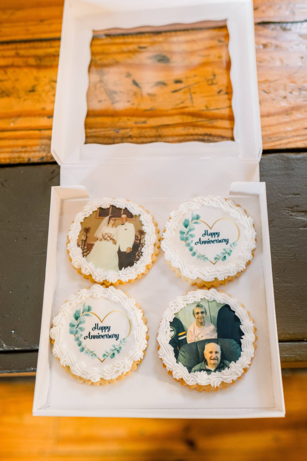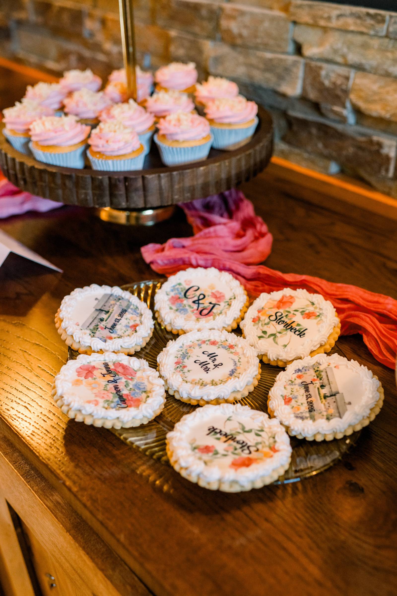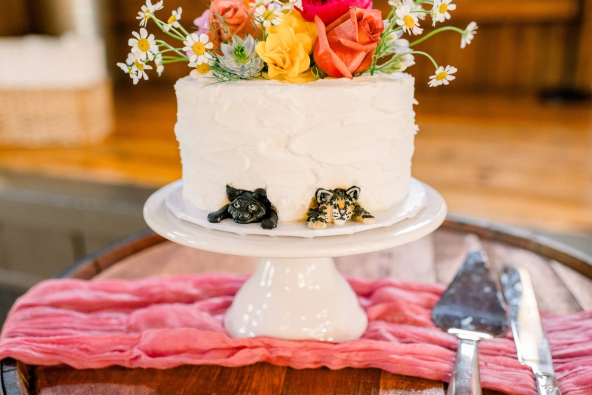 The couple’s pets were also honored on their single-tier white cake from Craig’s Cake Shop, playfully decorated on the side. Other desserts from Craig’s Cake Shop included cupcakes and cream puffs, while Sunny Celebrations printed custom sugar cookies to honor the couple and the venue.