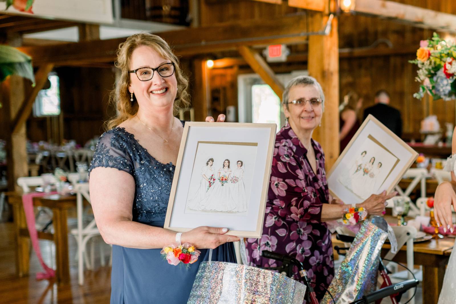 Jenna and Cam married on Jenna’s grandparents’ wedding anniversary. As a heartfelt detail, Melody Rose Designs recreated Jenna’s grandma’s wedding bouquet, which became the centerpiece for her table. It was important to honor her grandma and make the day special for her, as her grandfather had passed a few months before. Jenna also gifted her mother and grandmother a custom painting that combined the three of them on their respective wedding days into one image.