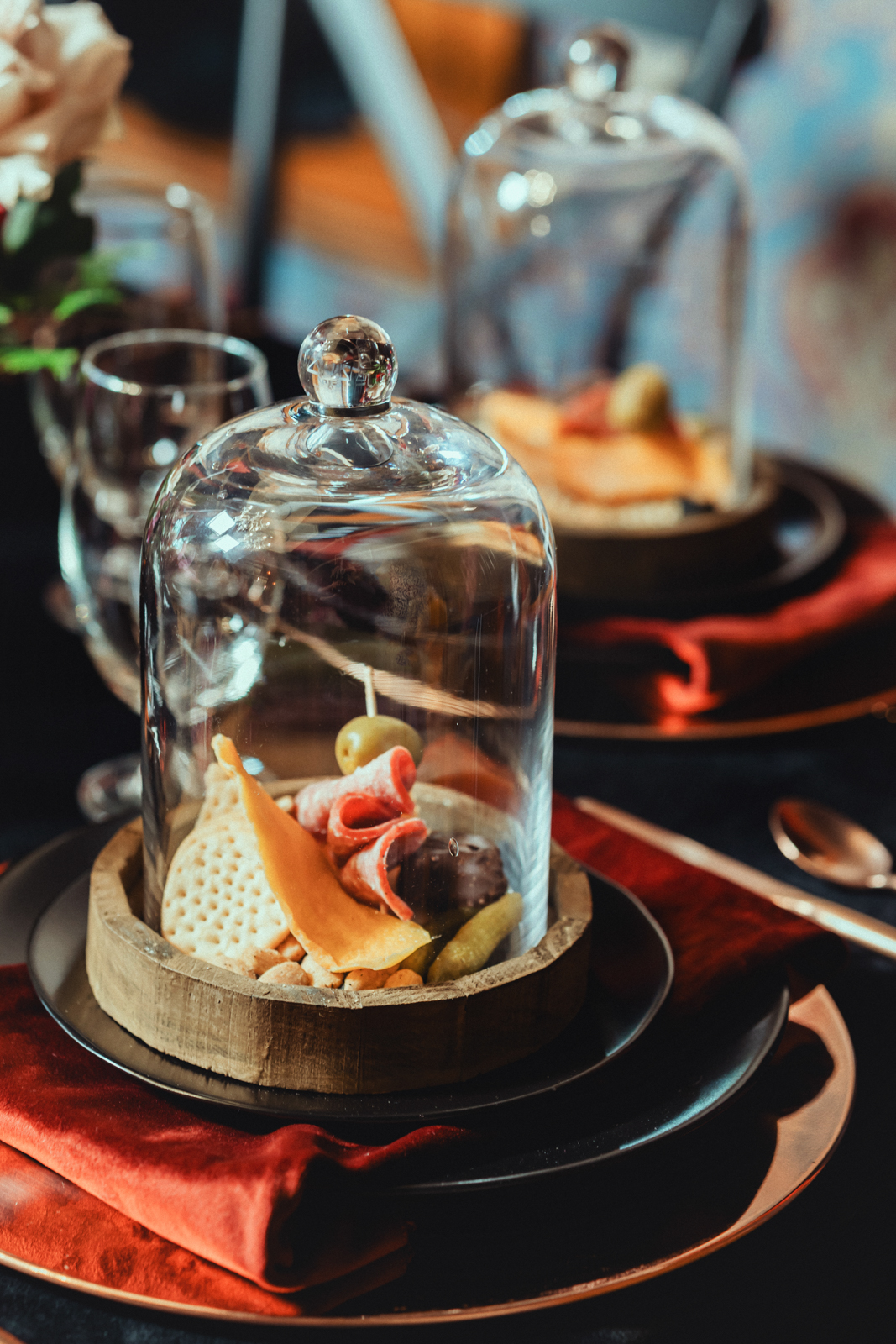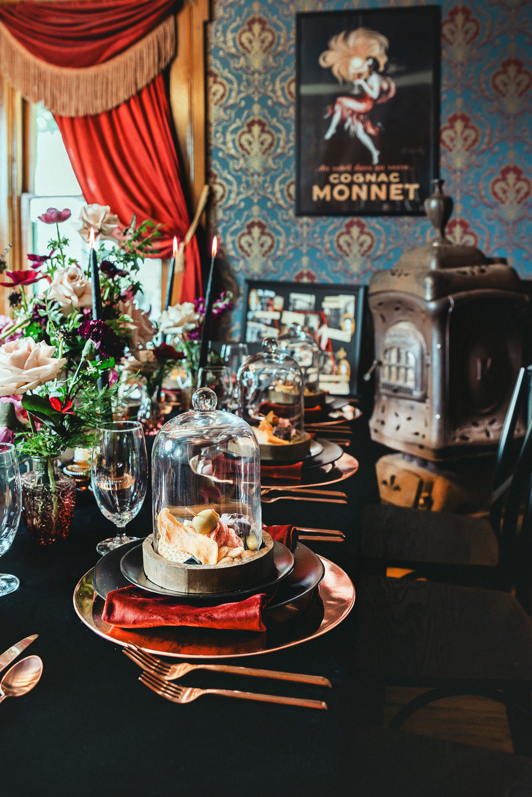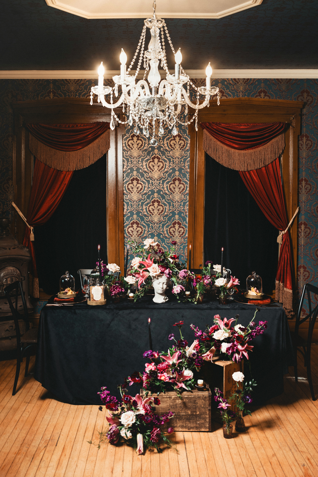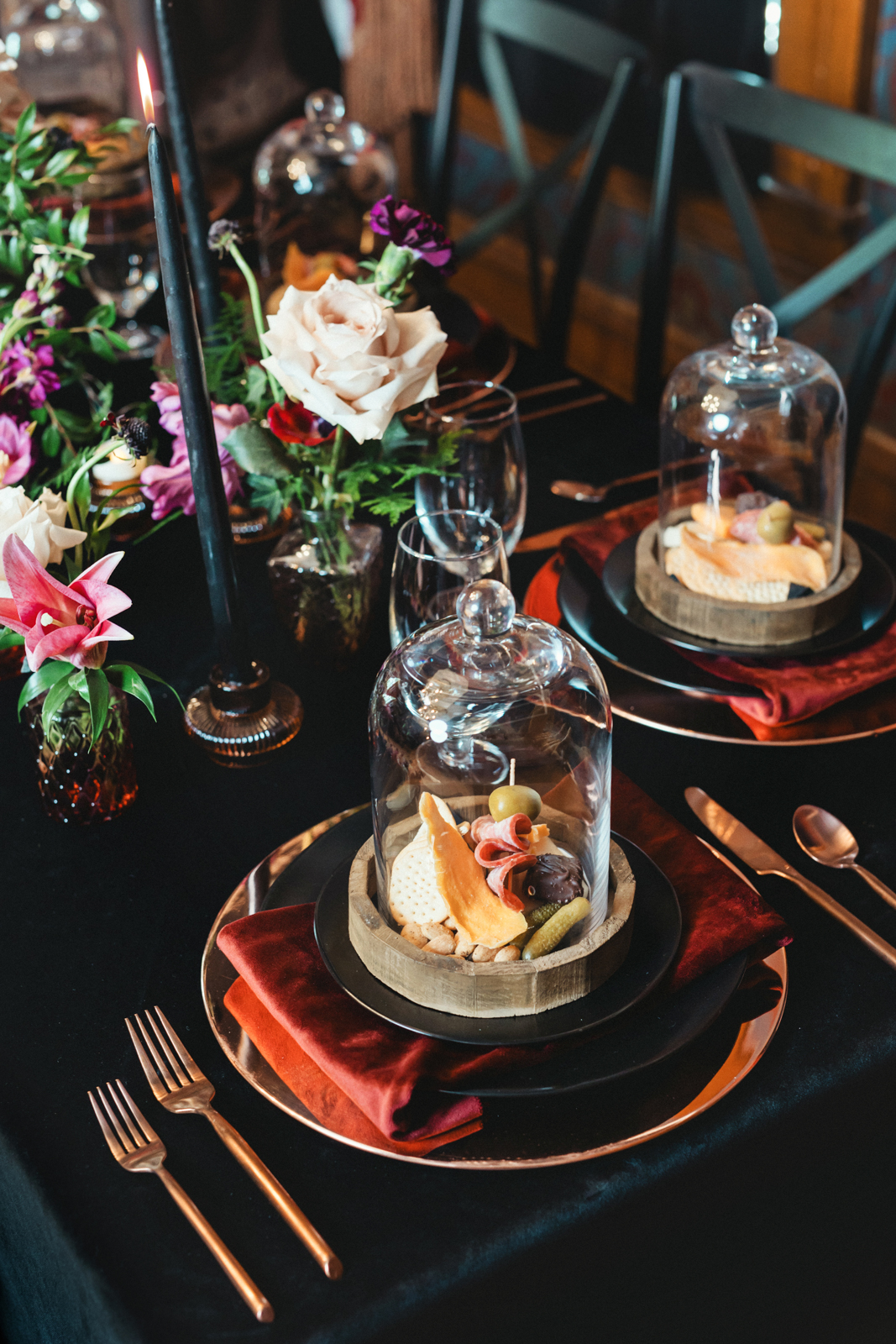 A deep black velvet tablecloth from Event Essentials set the stage for an enigmatic seating arrangement enhanced by copper chargers, brushed copper flatware, and matte black dinnerware, allowing the florals to stand out against the dramatic design. Tall black taper candles and the glow of a crystal chandelier illuminated the scene, while glass domes showcased delectable “Sinister Charcuterie” from the Iron Amethyst.