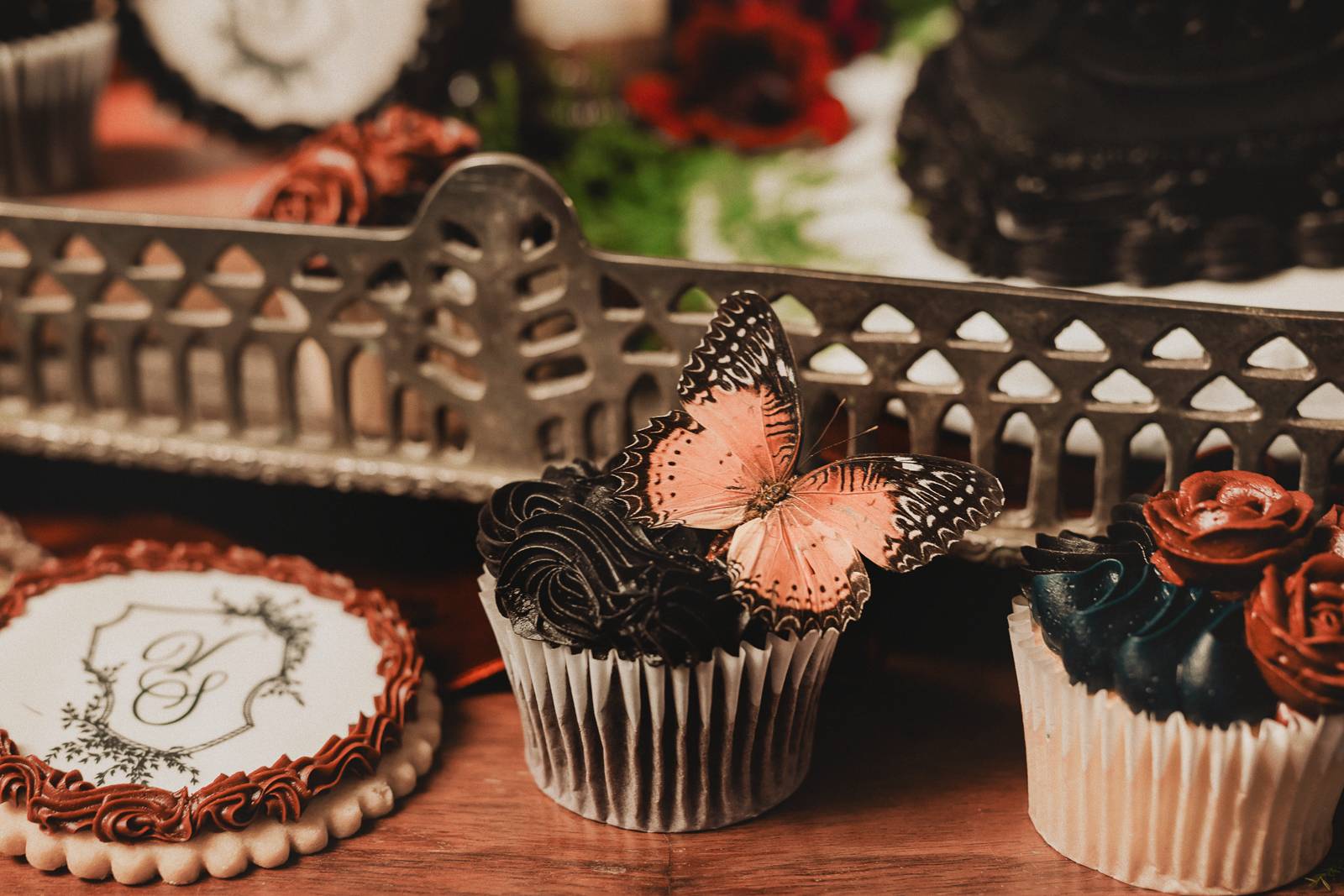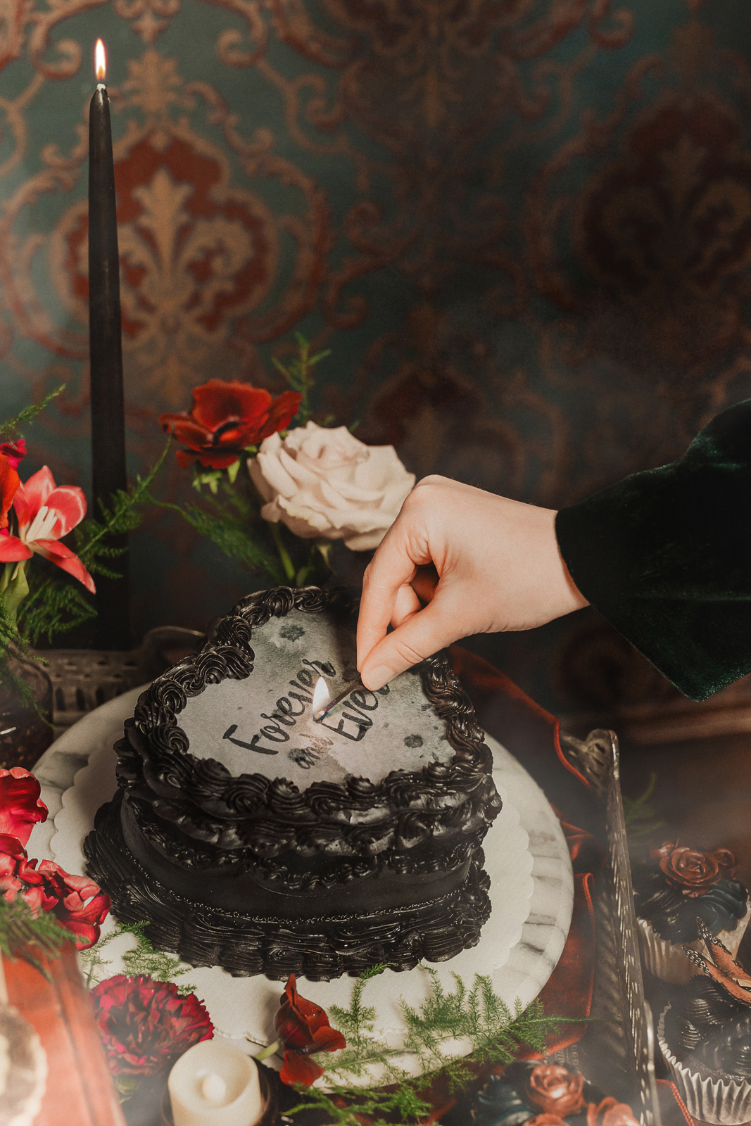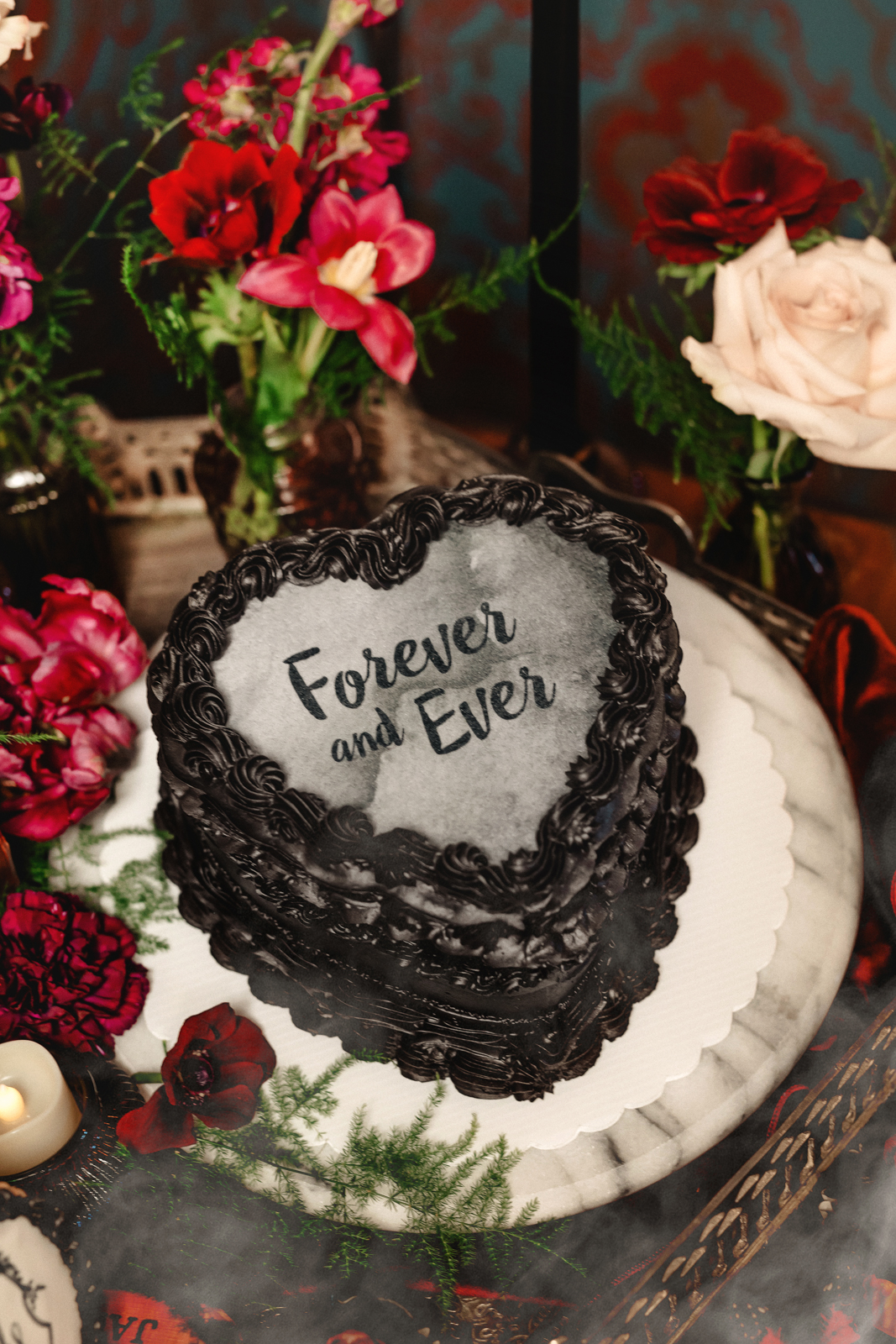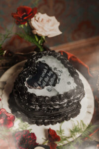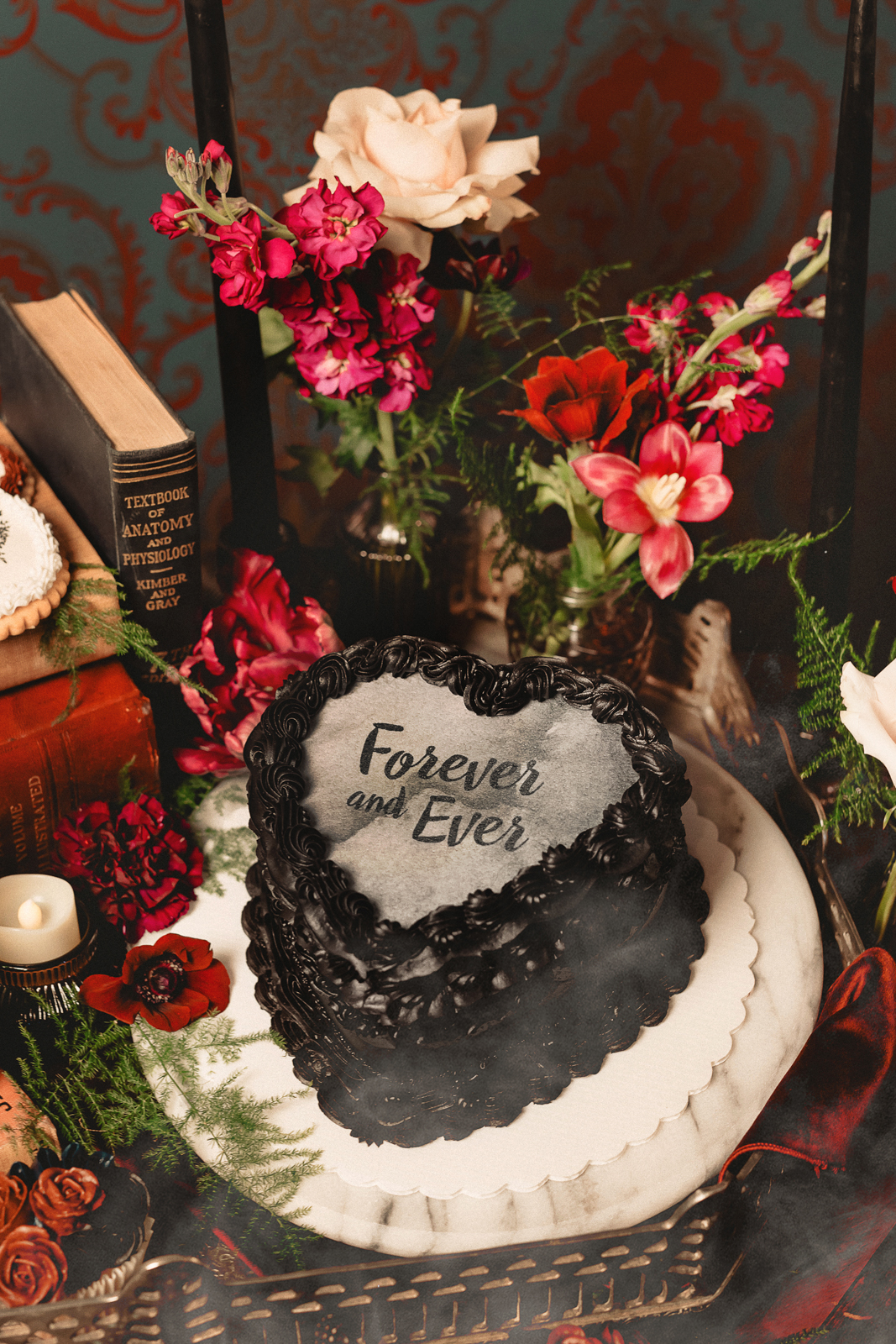 A deep black velvet tablecloth from Event Essentials set the stage for an enigmatic seating arrangement enhanced by copper chargers, brushed copper flatware, and matte black dinnerware, allowing the florals to stand out against the dramatic design. Tall black taper candles and the glow of a crystal chandelier illuminated the scene, while glass domes showcased delectable “Sinister Charcuterie” from the Iron Amethyst.