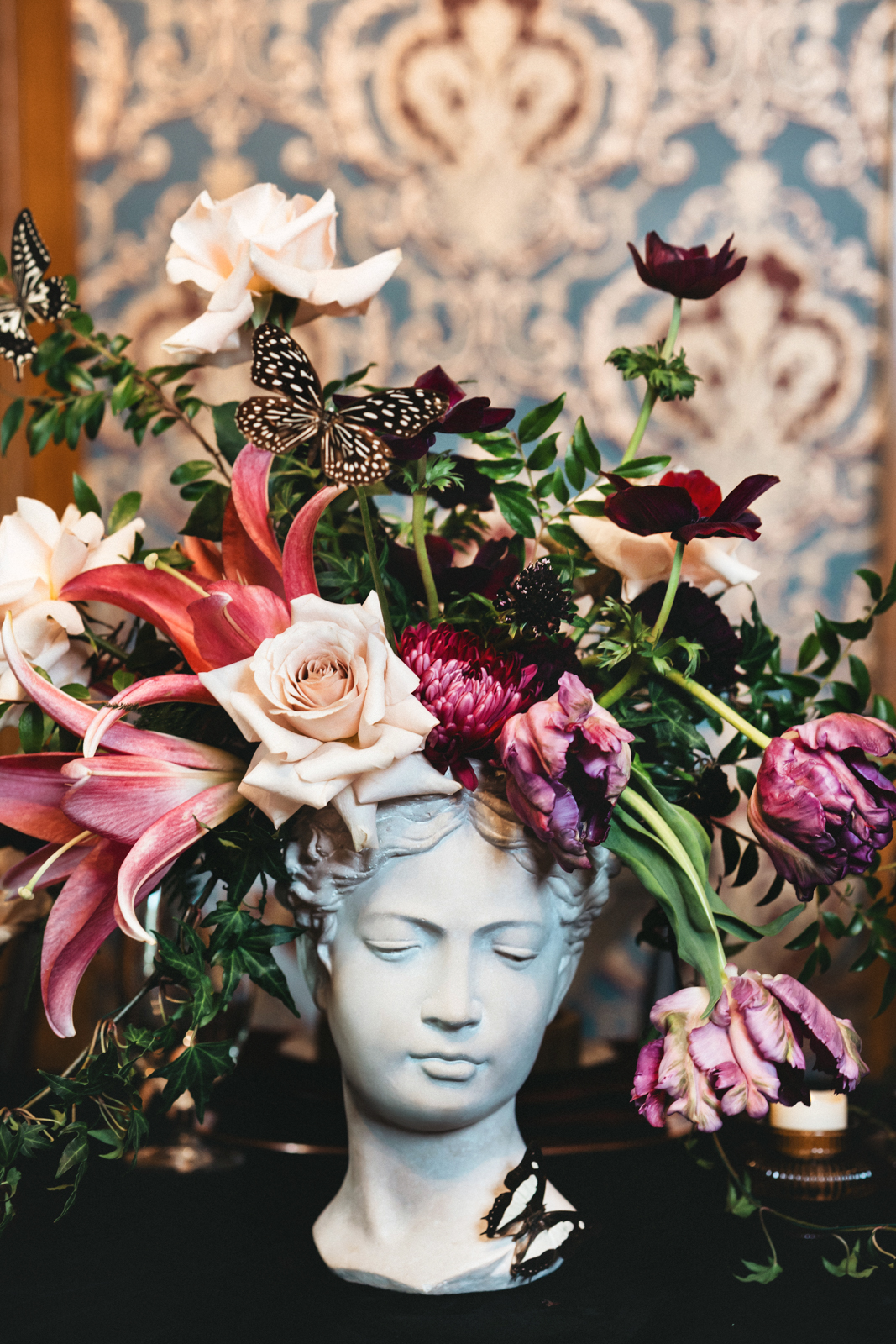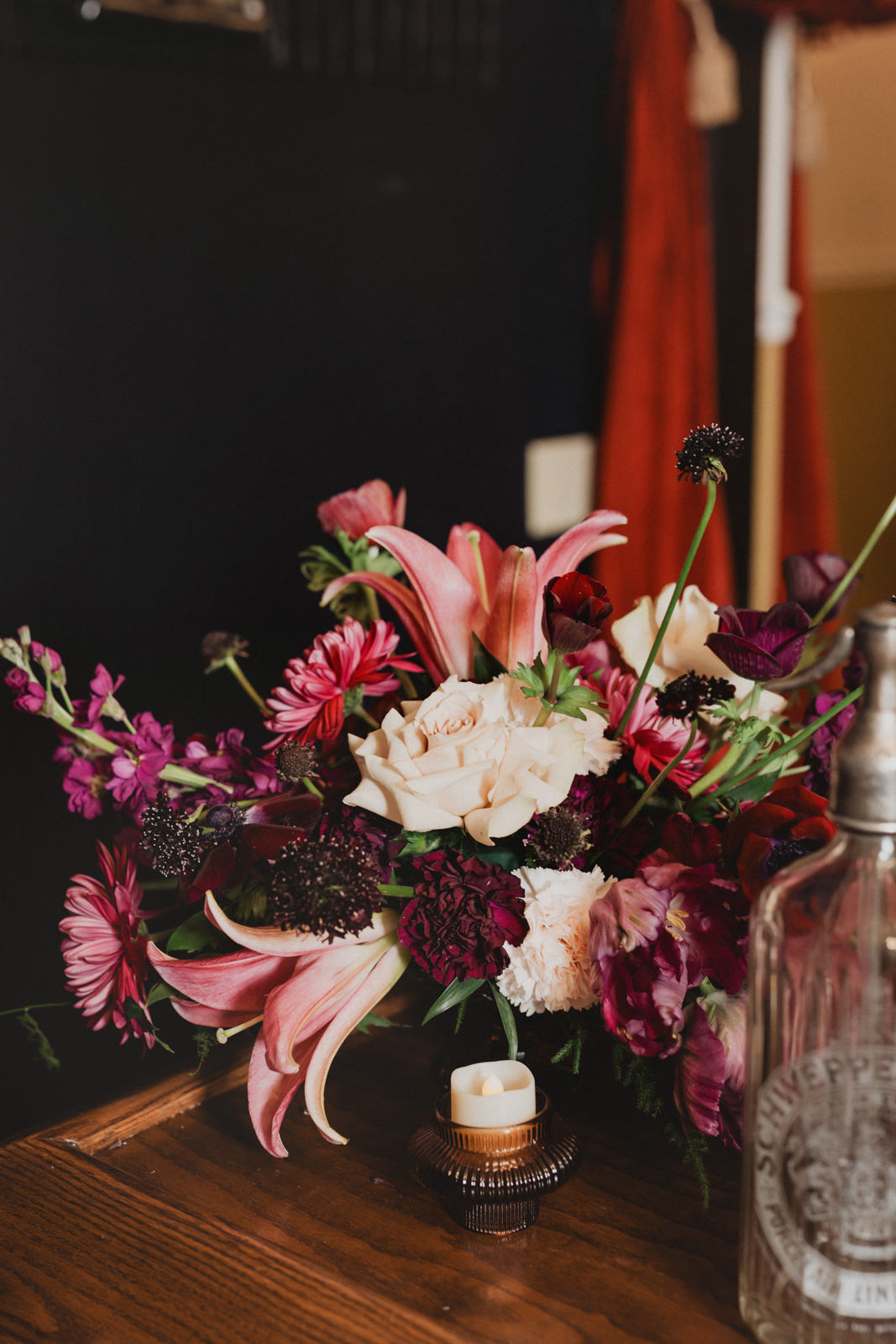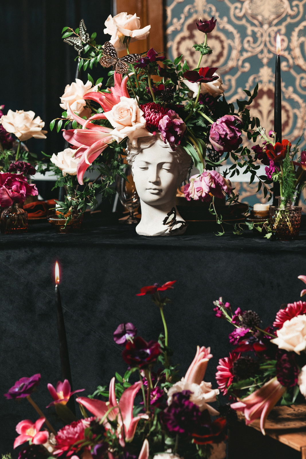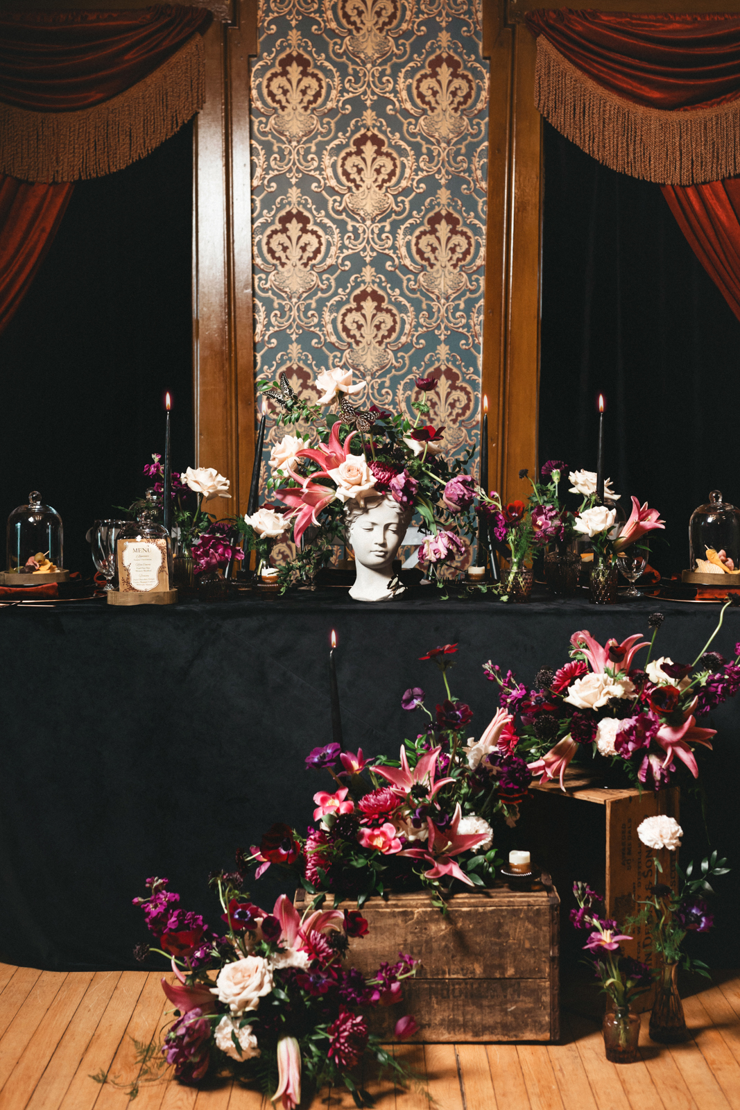 B-Style Floral brought a touch of dark garden elegance to the design through stunning floral arrangements. Featuring textured greenery and purple, pink, and mauve-hued blooms, they perfectly captured the moody, enigmatic atmosphere of the venue and event. Each arrangement was meticulously crafted to complement the mysterious theme, adding a layer of sophistication and intrigue to the celebration.