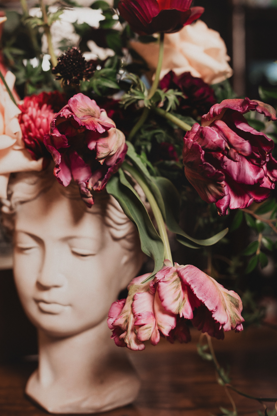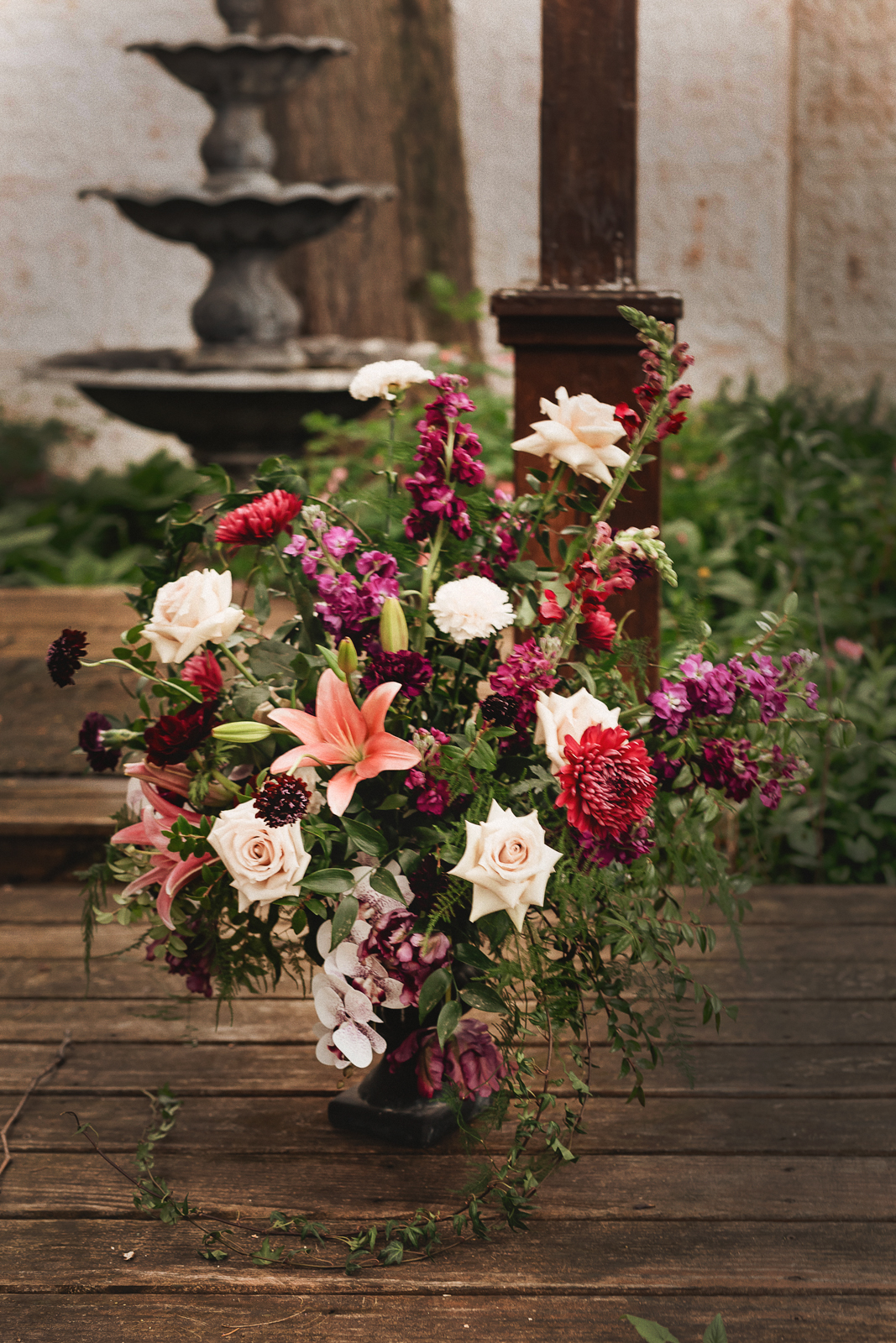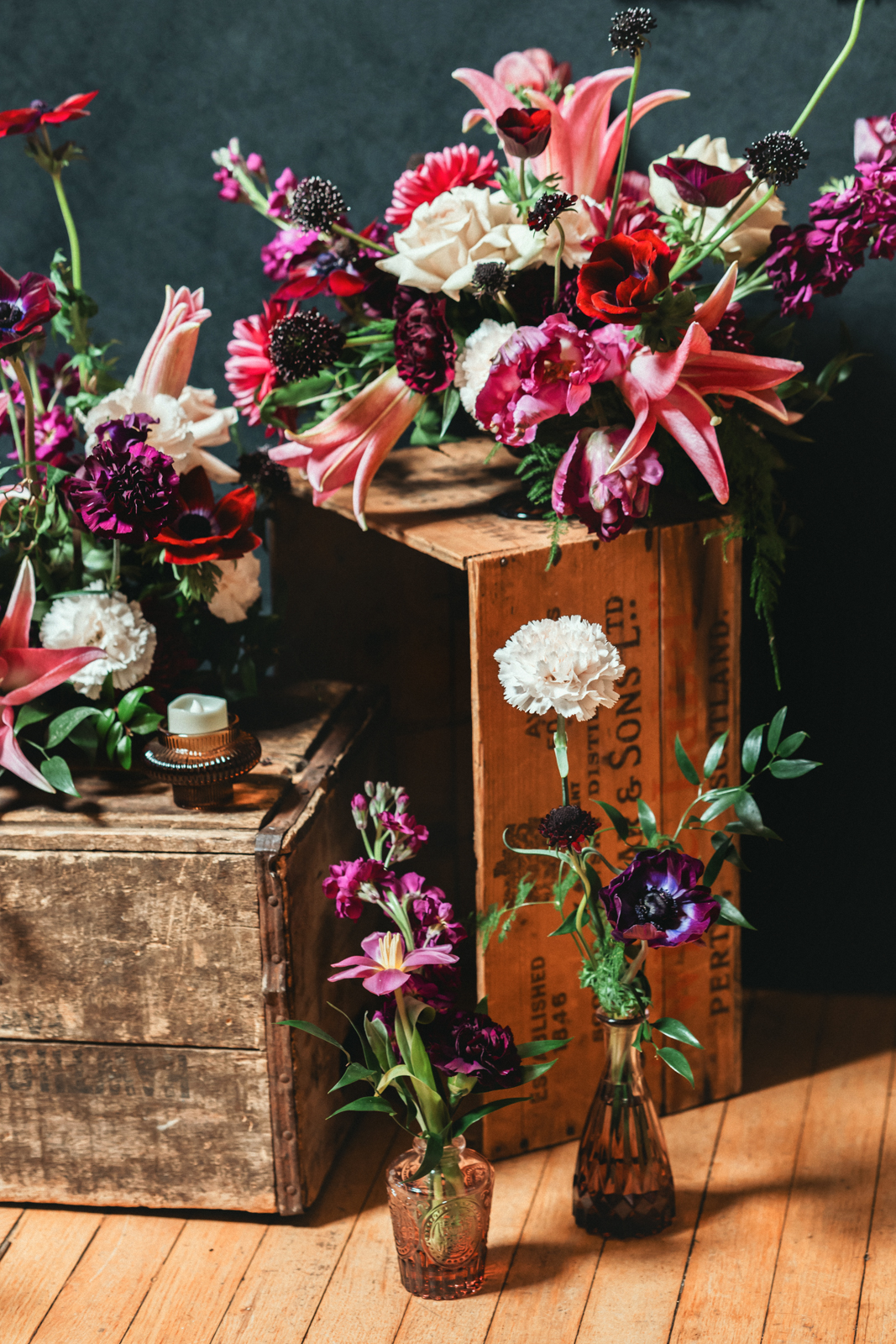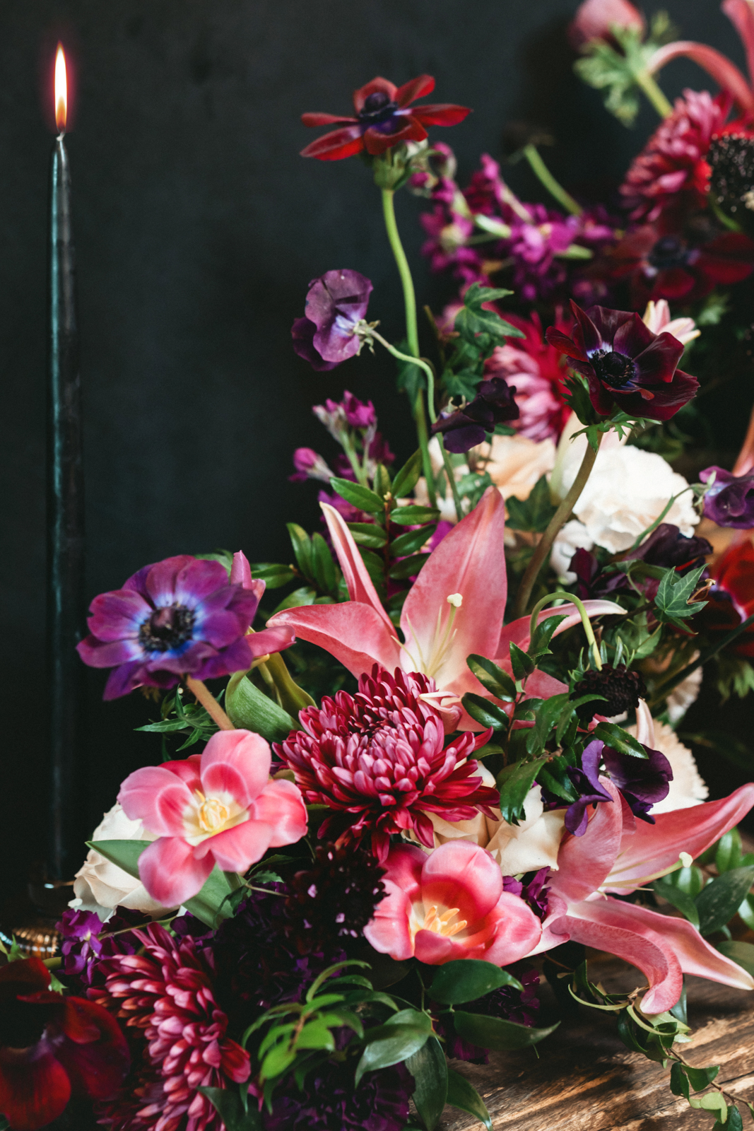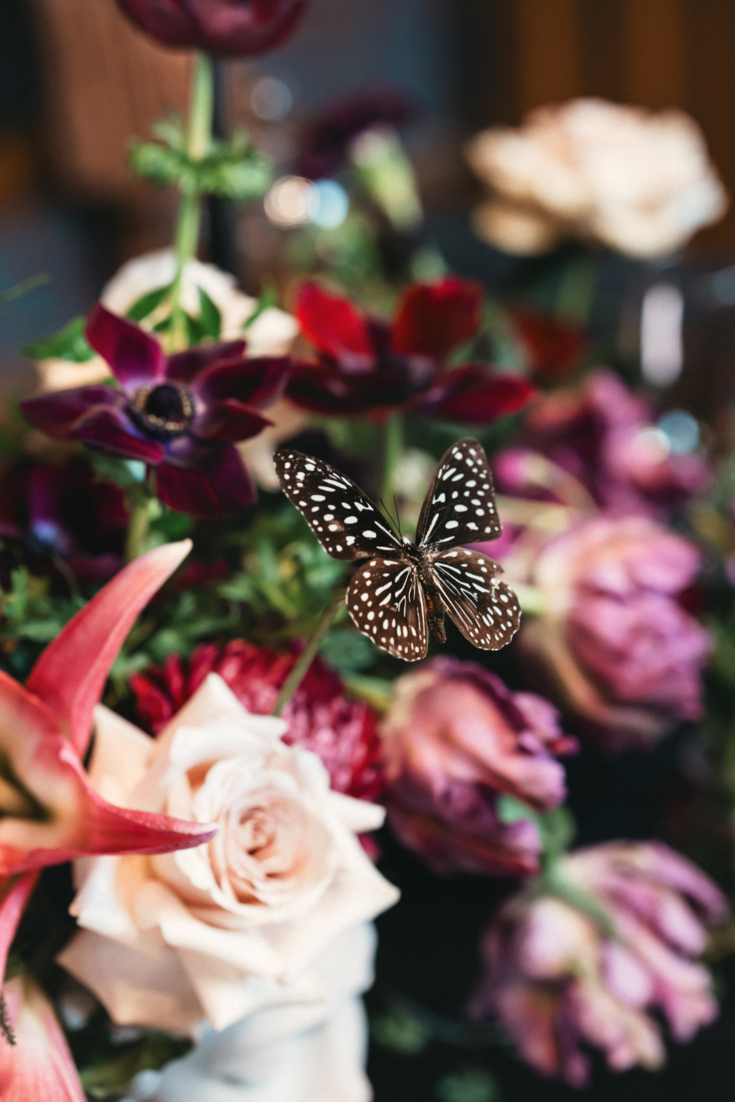B-Style Floral brought a touch of dark garden elegance to the design through stunning floral arrangements. Featuring textured greenery and purple, pink, and mauve-hued blooms, they perfectly captured the moody, enigmatic atmosphere of the venue and event. Each arrangement was meticulously crafted to complement the mysterious theme, adding a layer of sophistication and intrigue to the celebration.