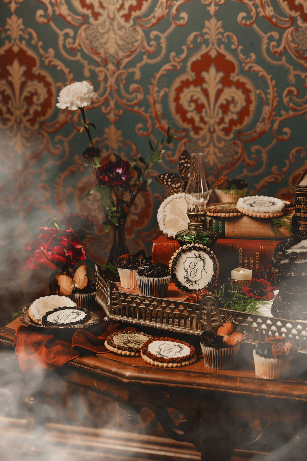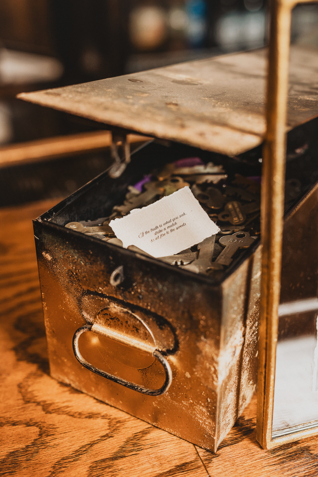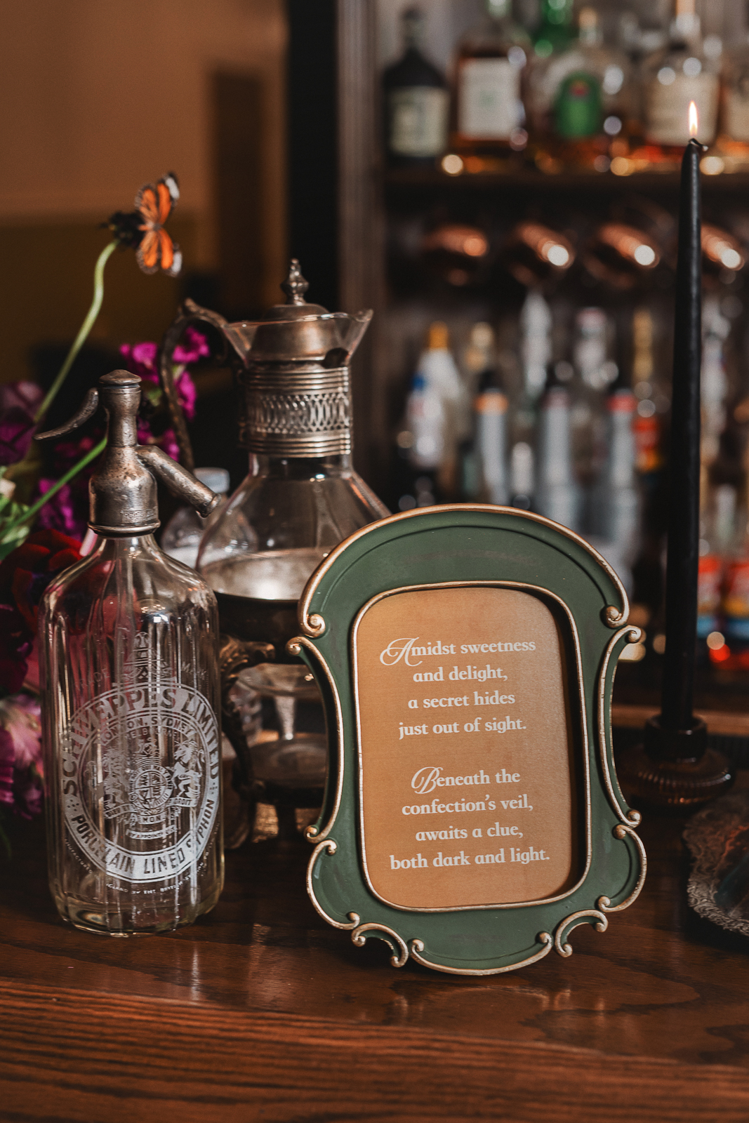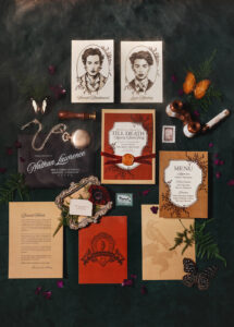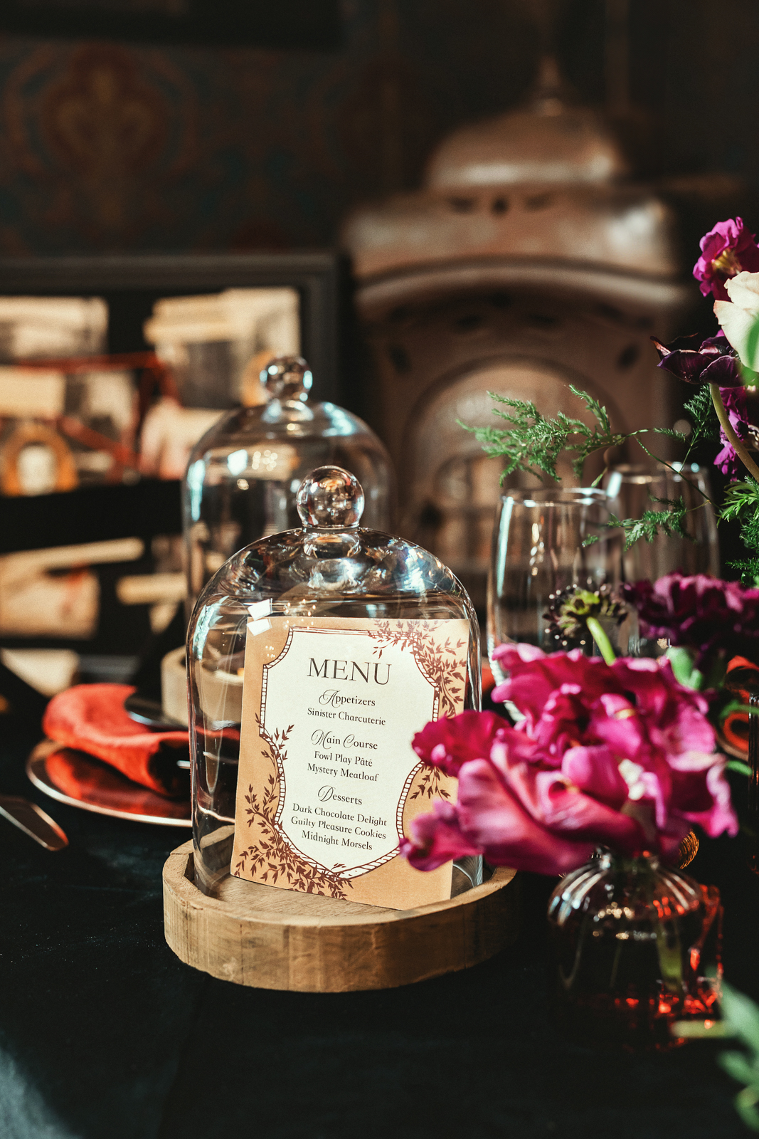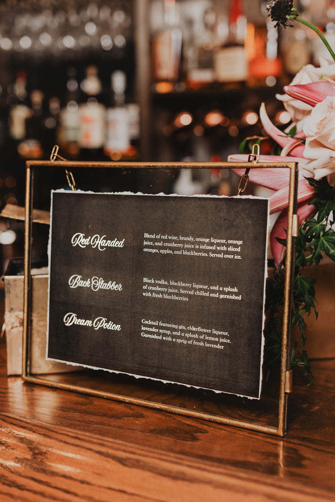 From design to photography, stationery, signage, and game creation, LK Bridal Studio masterfully crafted a clever and immersive experience for the couple and their guests. Complementing the dark, yet whimsical, vibe of the Iron Amethyst Inn and the mystery theme of the party, the invitation suite showcased rich hues of gold, burgundy, and black, and also included a custom crest created to celebrate the couple. Attendees were assigned a game character complete with illustrations, personality traits, and backstories, along with an evidence board featuring more information about – and a potential motive for – each guest.