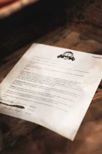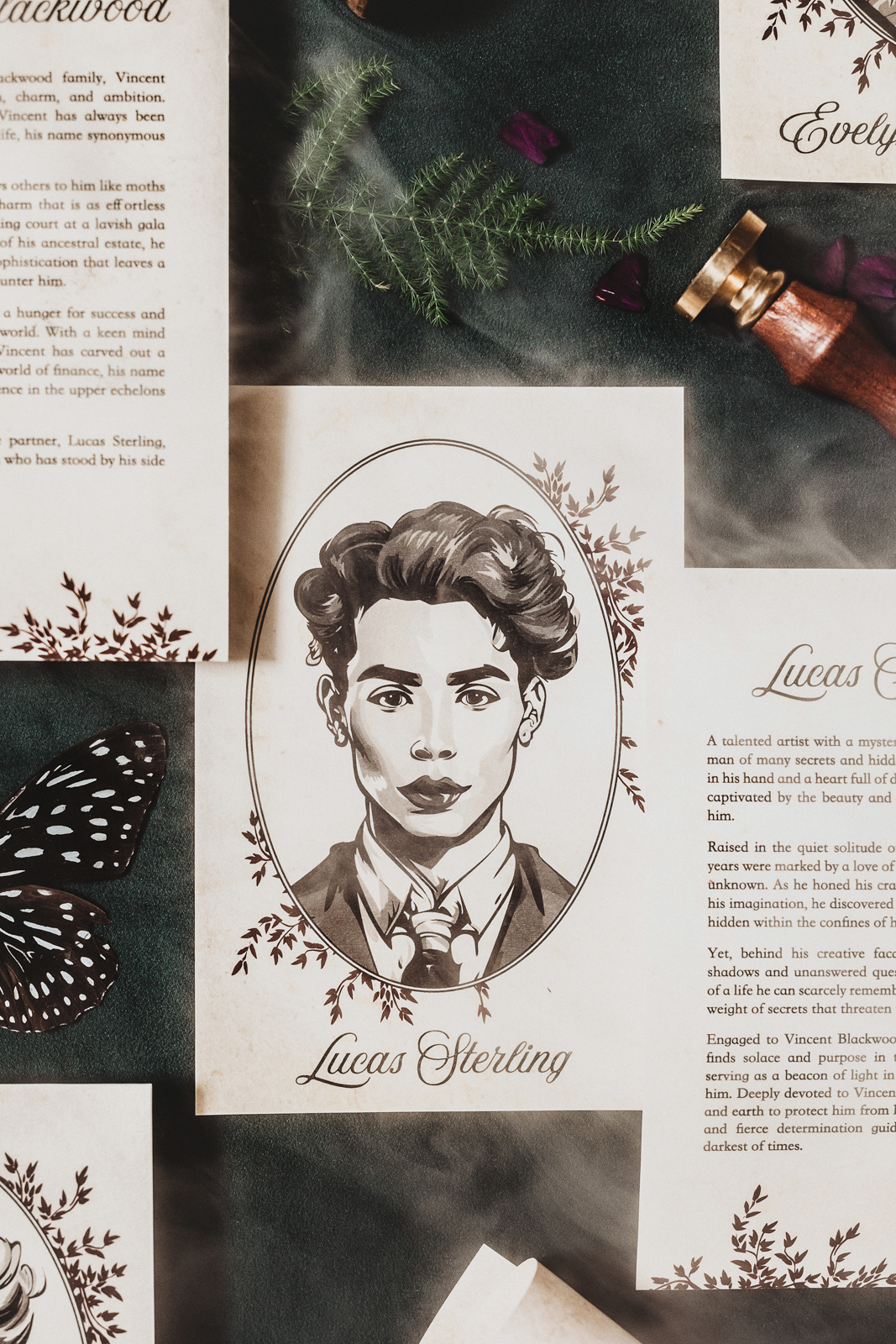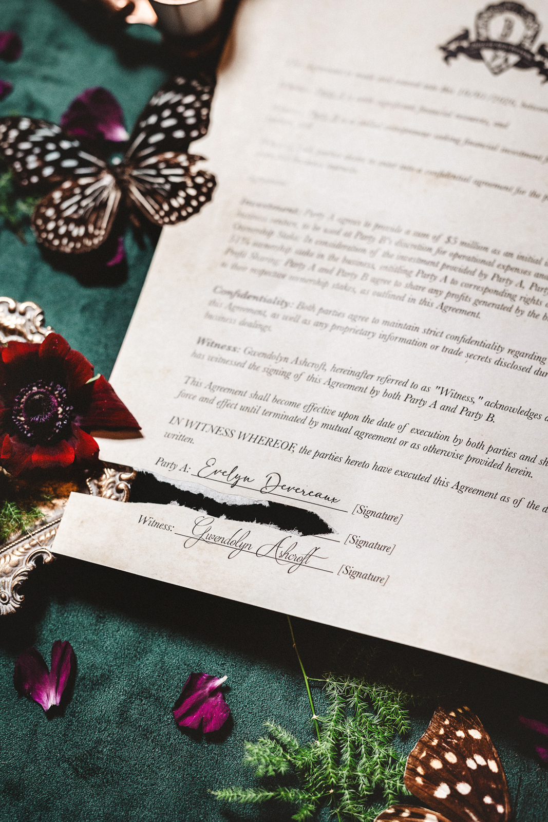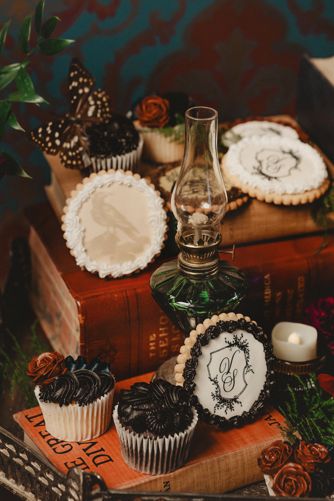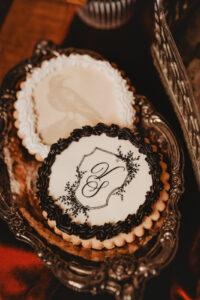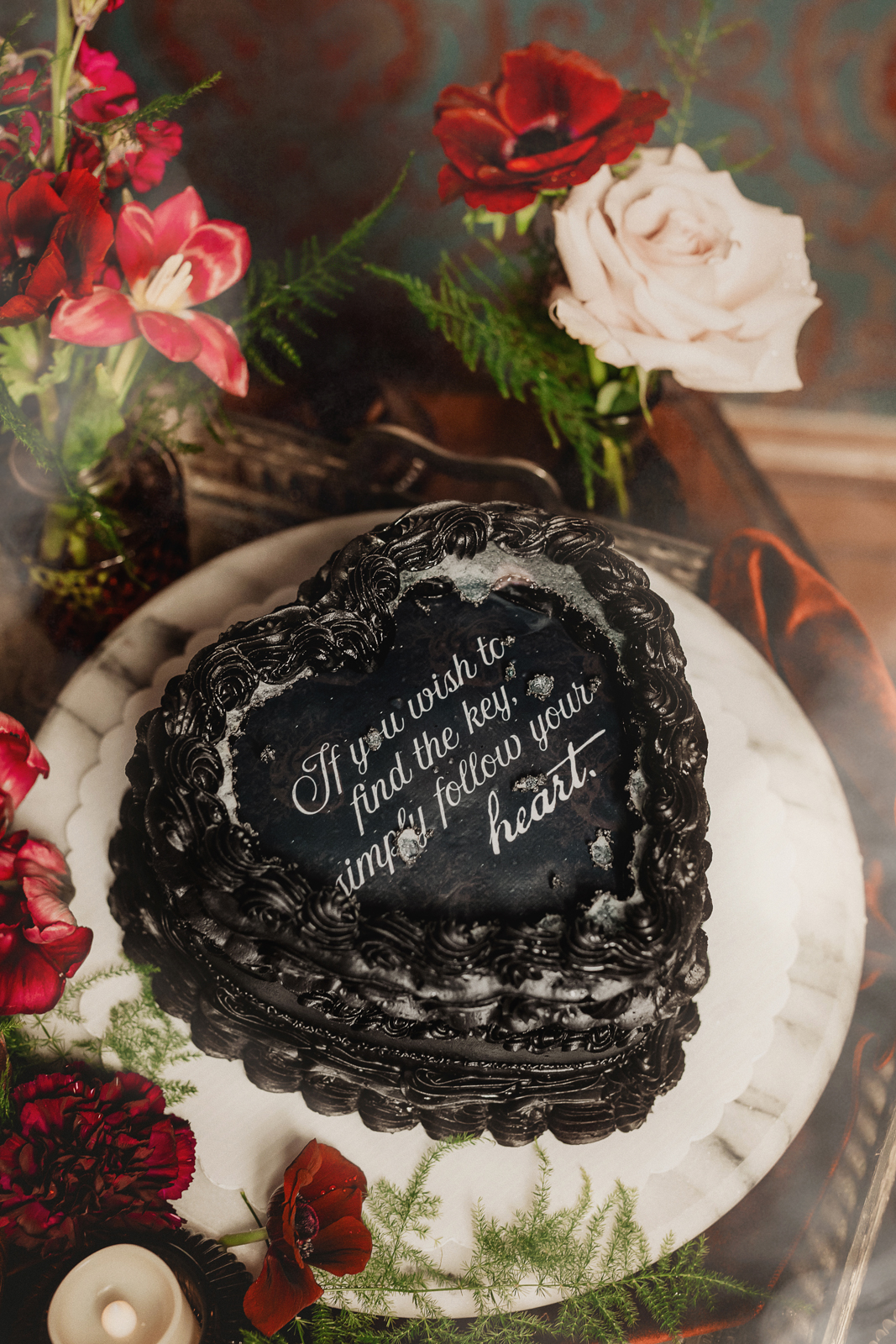 From design to photography, stationery, signage, and game creation, LK Bridal Studio masterfully crafted a clever and immersive experience for the couple and their guests. Complementing the dark, yet whimsical, vibe of the Iron Amethyst Inn and the mystery theme of the party, the invitation suite showcased rich hues of gold, burgundy, and black, and also included a custom crest created to celebrate the couple. Attendees were assigned a game character complete with illustrations, personality traits, and backstories, along with an evidence board featuring more information about – and a potential motive for – each guest.