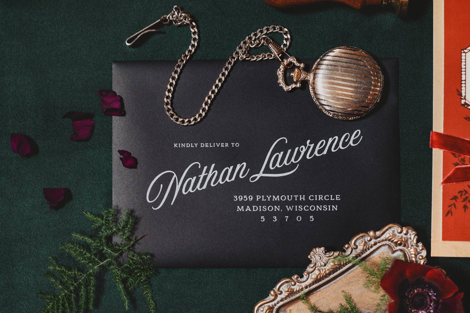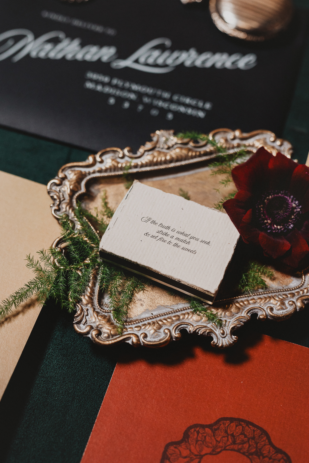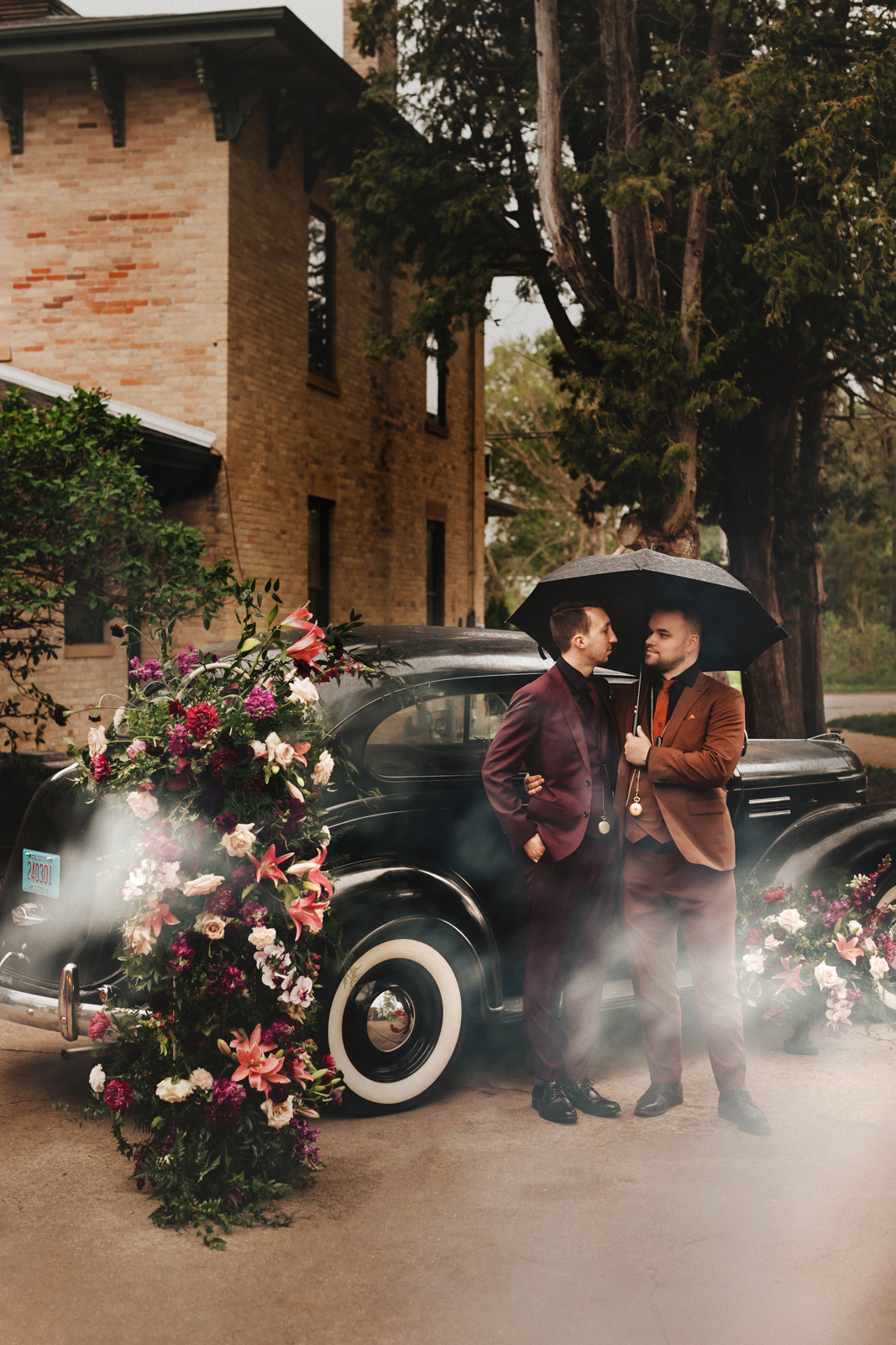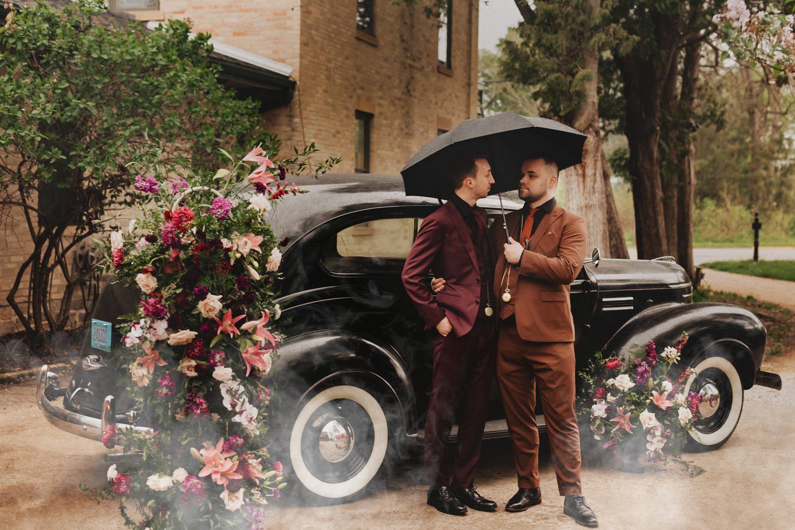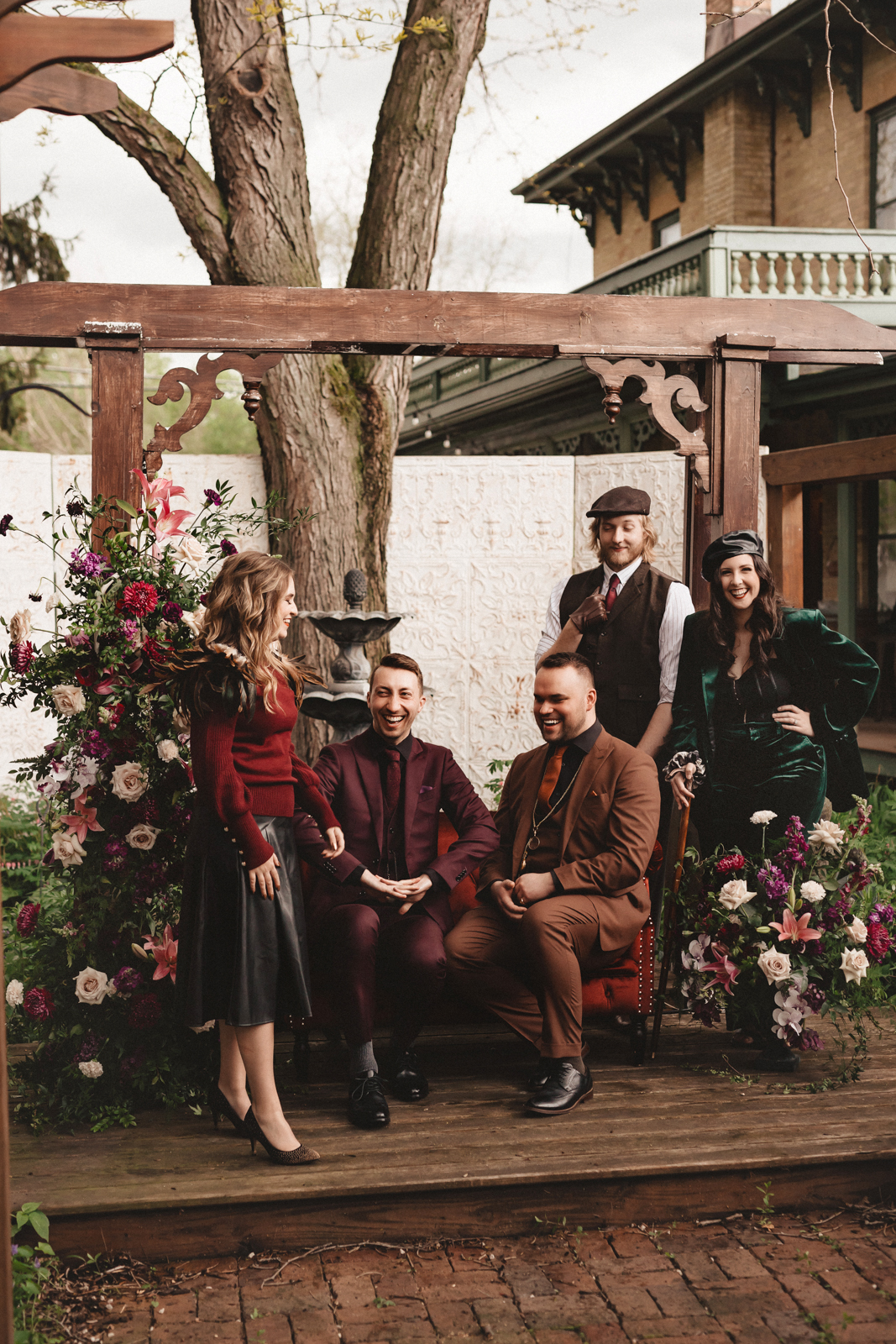 With its historical 1865 Italianate mansion, lush outdoor gardens, 2One Speakeasy offering snacks and creative craft cocktails, and more, the Iron Amethyst Inn was the perfect one-of-a-kind venue for this moody and mysterious celebration located just 25 minutes west of Madison. Nodding to the time period of their property, they also provided a vintage car for photo ops for the couple and their guests!