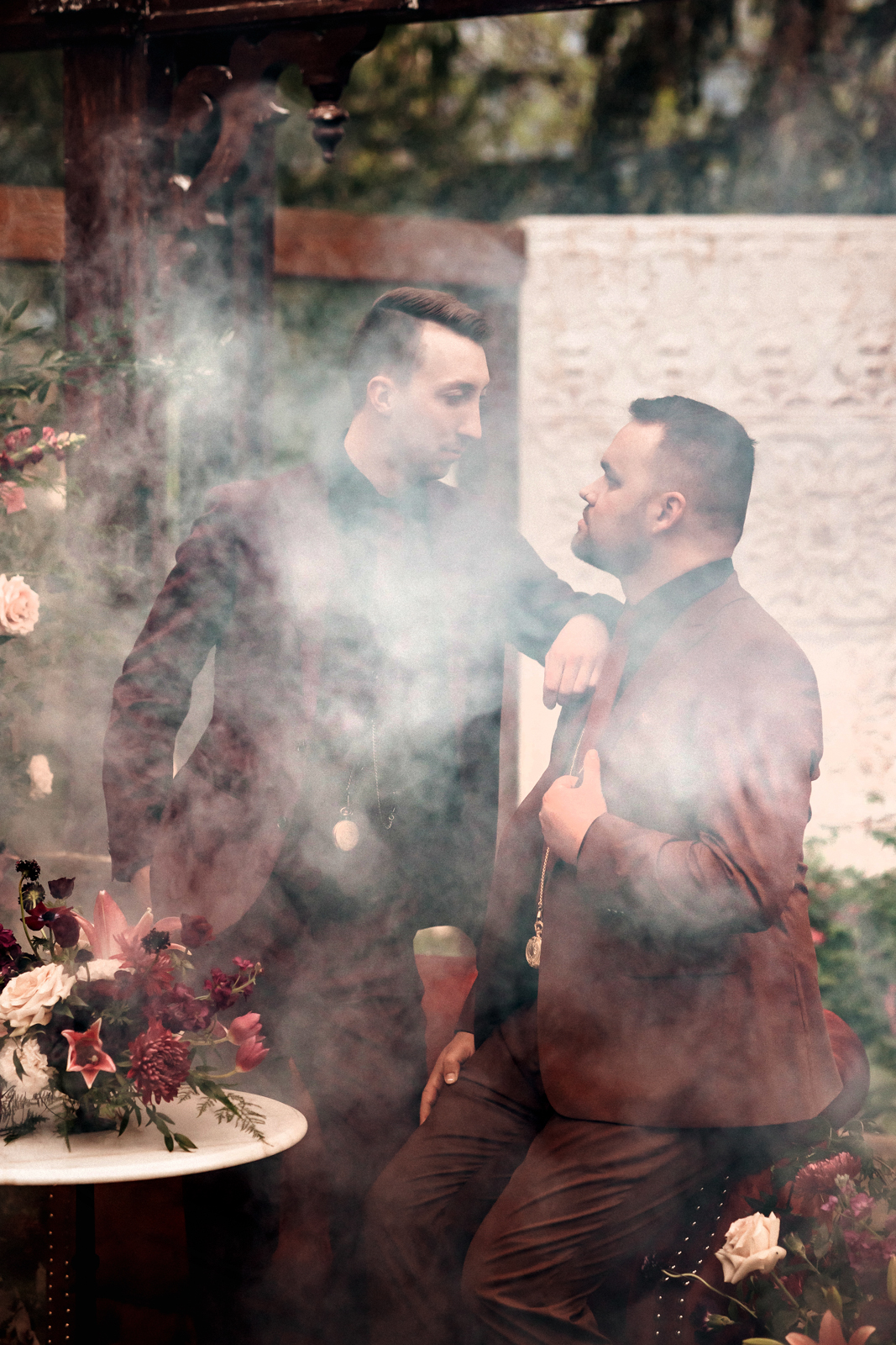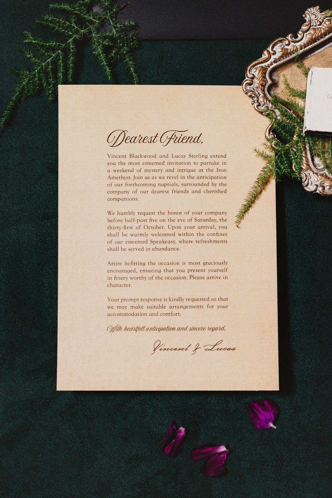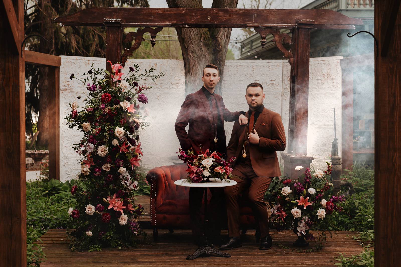 With a thrilling interactive game at the heart of the evening, two grooms and their guests channeled their inner detectives to navigate through a series of sinister enigmas and cryptic clues. Featuring LK Bridal Studio, Iron Amethyst Inn, Hello Darling Films, B-Style Floral, Sunny Celebrations, AB On Site Beauty, Event Essentials, Celebrations Entertainment, and A+ Heler’s Dry Ice & CO2, this blood-curdling bach party promises to be a spine-tingling good time filled with laughter and suspense. After all, what better way to celebrate till death do us part than with a night to die for?