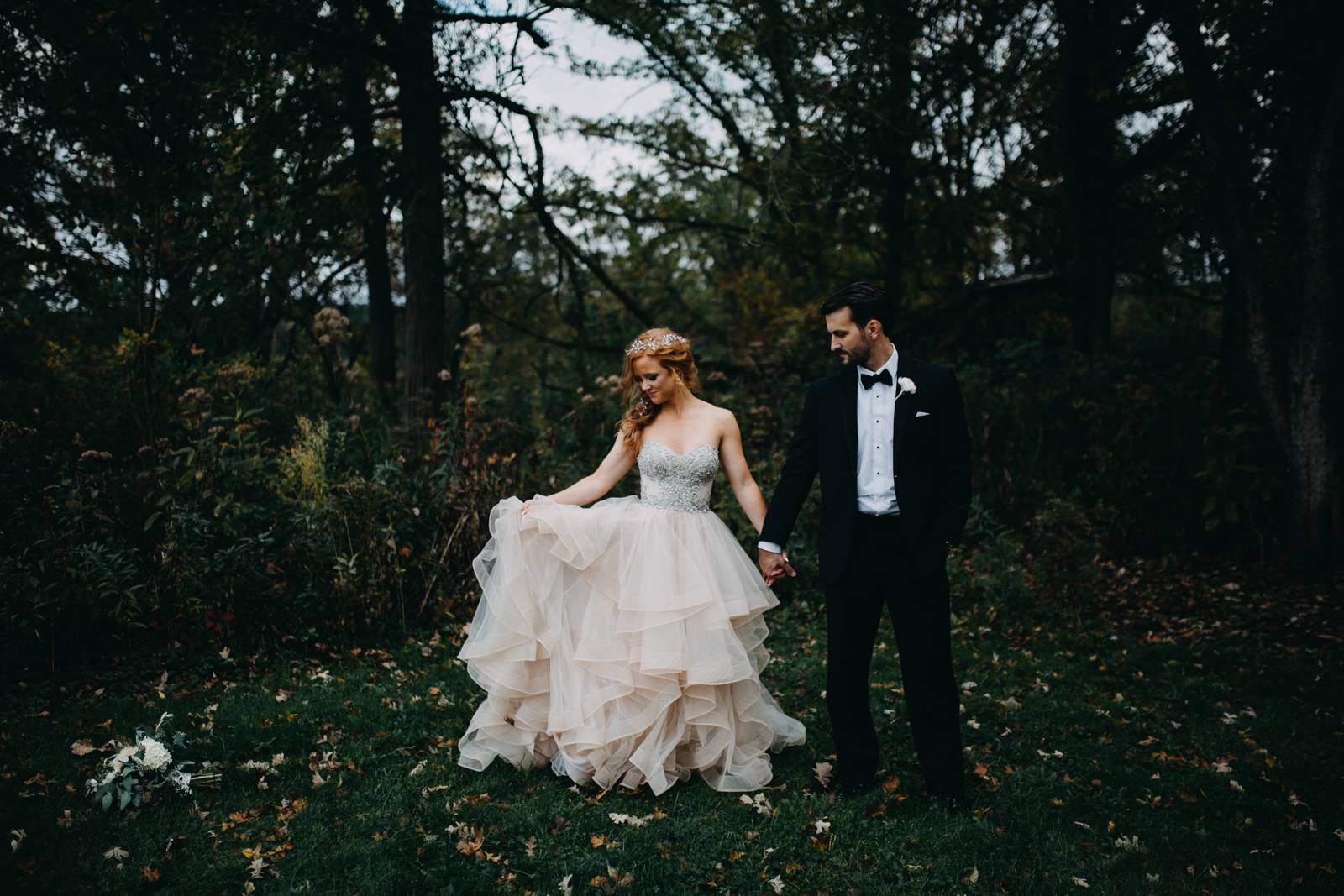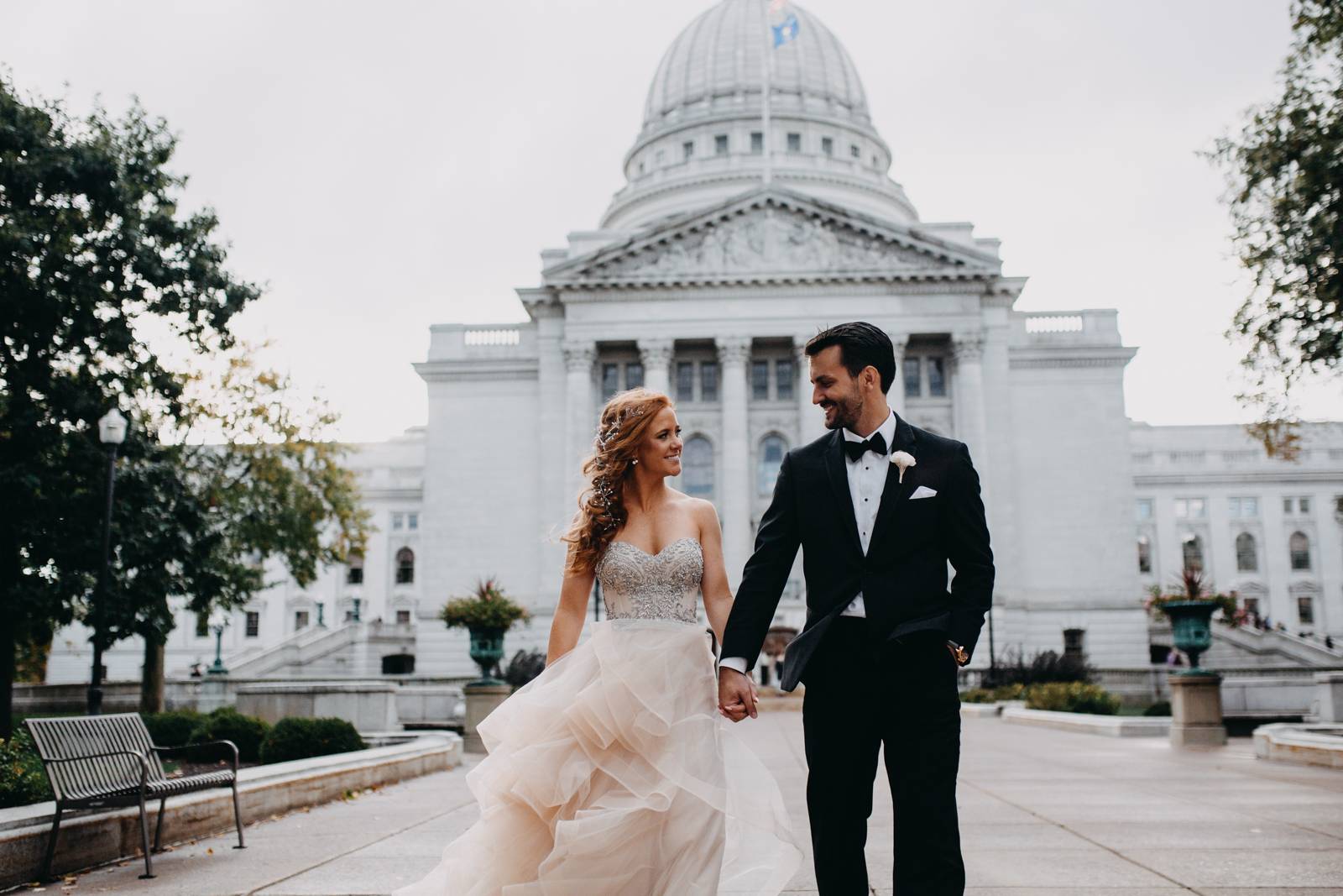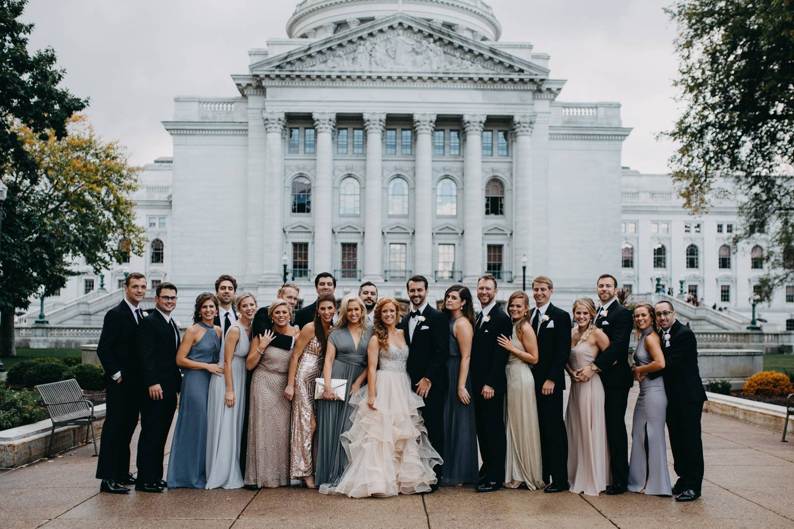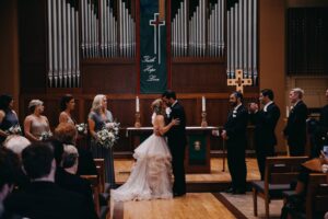 Fall has certainly arrived! We are digging all the earthy tones, moody romance, and darker details this season brings with. Emily married Michael in just such a setting in their Madison wedding. Their vows were exchanged in a church setting and then celebrated at the stunning Madison Club. The bride looked radiant in a layered ball gown wedding dress while the groom sported a sophisticated tux from Men’s Wearhouse. With cakes created by Gig’s Cupcakes, signs crafted by A La Crate Rentals, and music organized by Celebrations Entertainment, this was an incredible event! Read more about Emily and Michael’s happy celebration below!