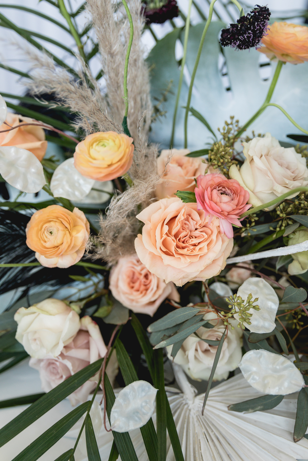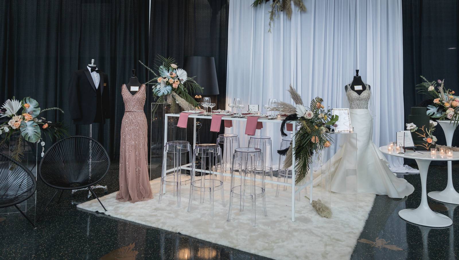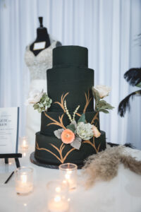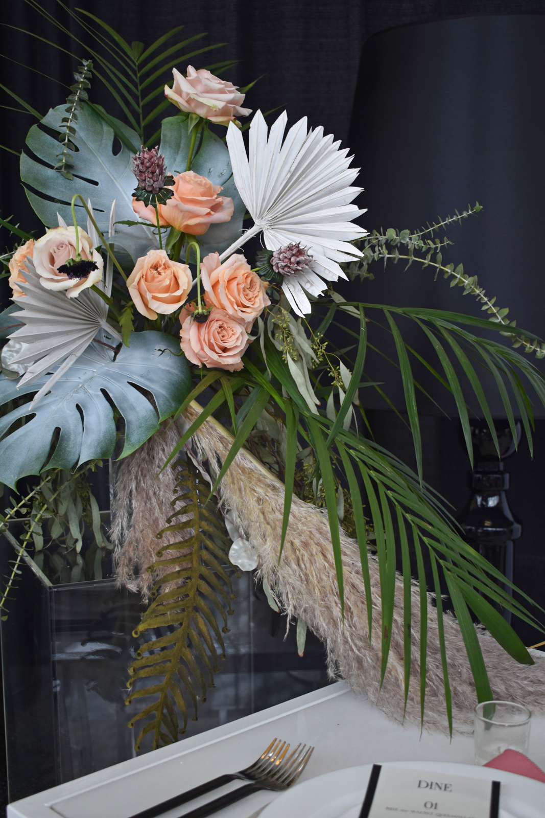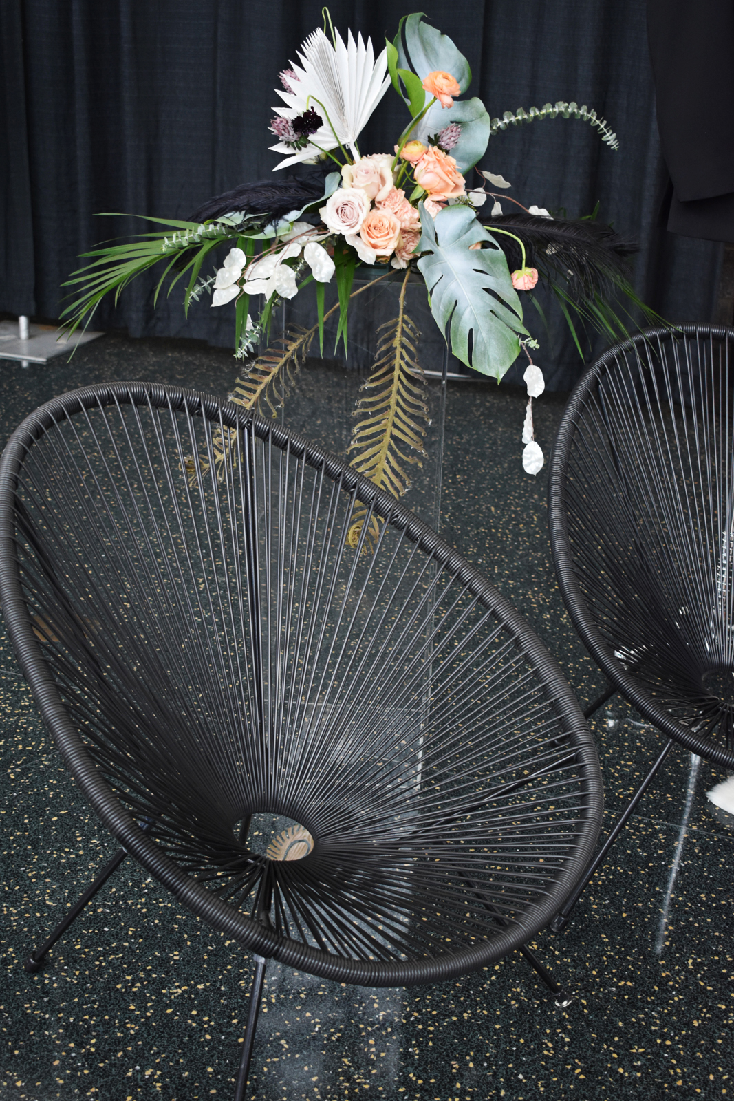 Timeless meets tropical in this chic and trendy inspirational styled shoot brought to us by Event Essentials. A pastel palette perfectly accents a classic black and white stationary from Sugar Pear Design. The tropical floral and gold accent make a bold cake a unique, yet stunning choice from Gigi’s Cupcakes. A modern, form-fitting dress for the bride that is made to impress with an equally beautiful bridesmaid’s dress from Brandi’s Bridal Galleria, Etc. paired with a refined suit from Nedrebo’s Formalwear make for a classic and stated bridal party. Captured by The Wedding Flashers, the lush greens, modern twists and beautiful color palettes brought us the perfect inspiration at our latest WedPlan Event, scroll to see more!