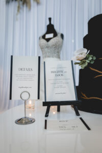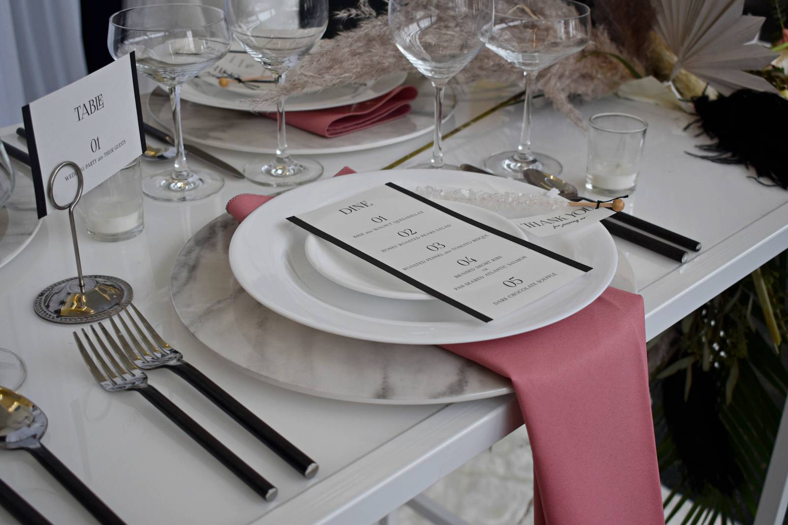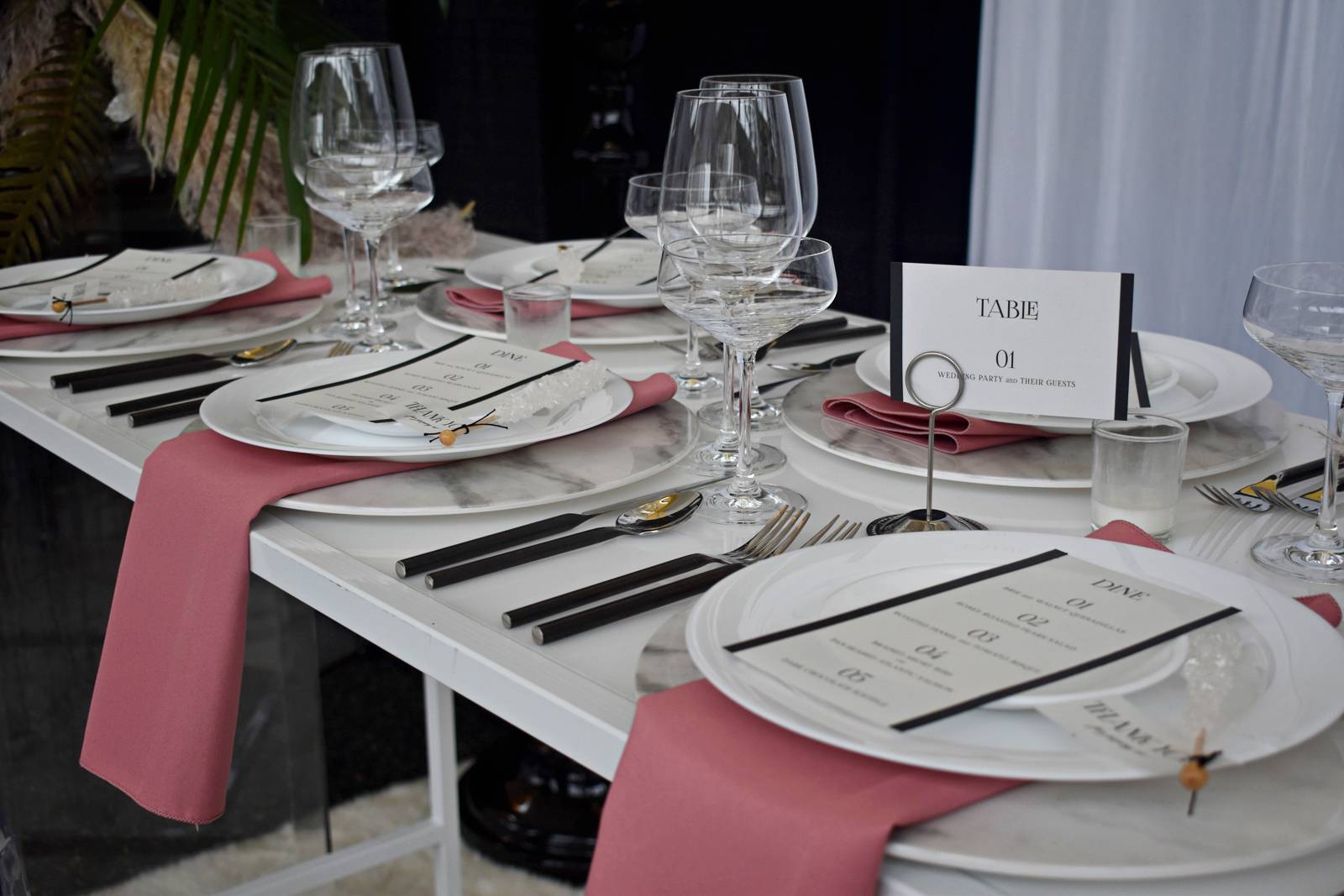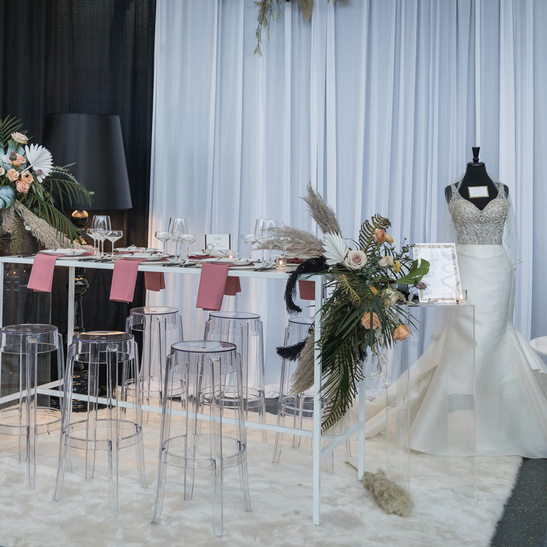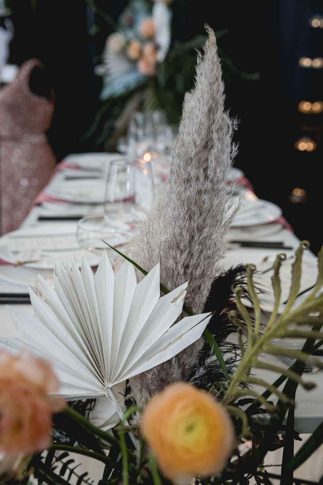 Timeless meets tropical in this chic and trendy inspirational styled shoot brought to us by Event Essentials. A pastel palette perfectly accents a classic black and white stationary from Sugar Pear Design. The tropical floral and gold accent make a bold cake a unique, yet stunning choice from Gigi’s Cupcakes. A modern, form-fitting dress for the bride that is made to impress with an equally beautiful bridesmaid’s dress from Brandi’s Bridal Galleria, Etc. paired with a refined suit from Nedrebo’s Formalwear make for a classic and stated bridal party. Captured by The Wedding Flashers, the lush greens, modern twists and beautiful color palettes brought us the perfect inspiration at our latest WedPlan Event, scroll to see more!