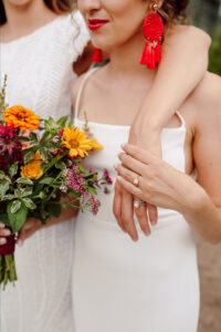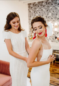 Modern and bold, we love the bridal look Lovely Elegance Hair & Makeup gave these two beautiful brides. A simple gown with a bright lip and fun jewelry makes for a stunning statement on your wedding day.