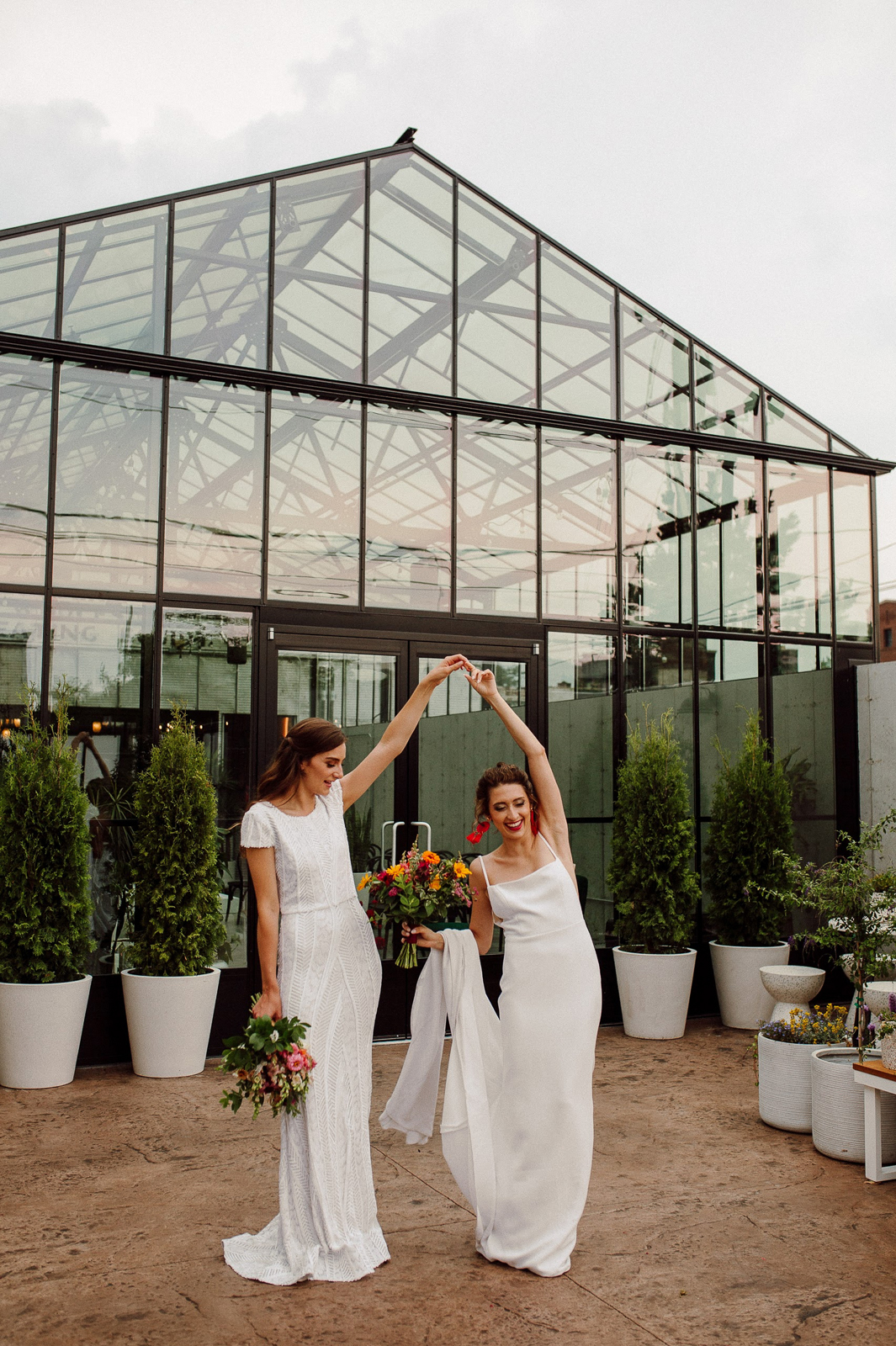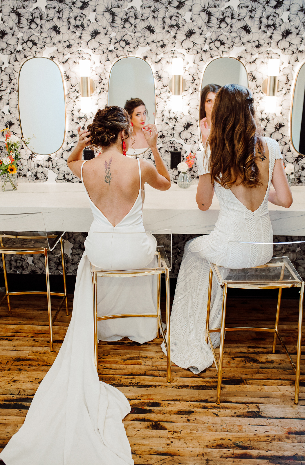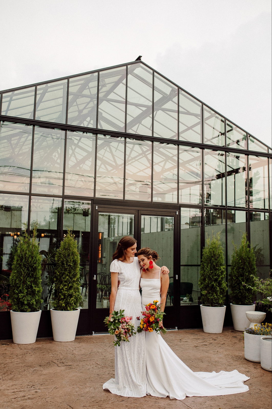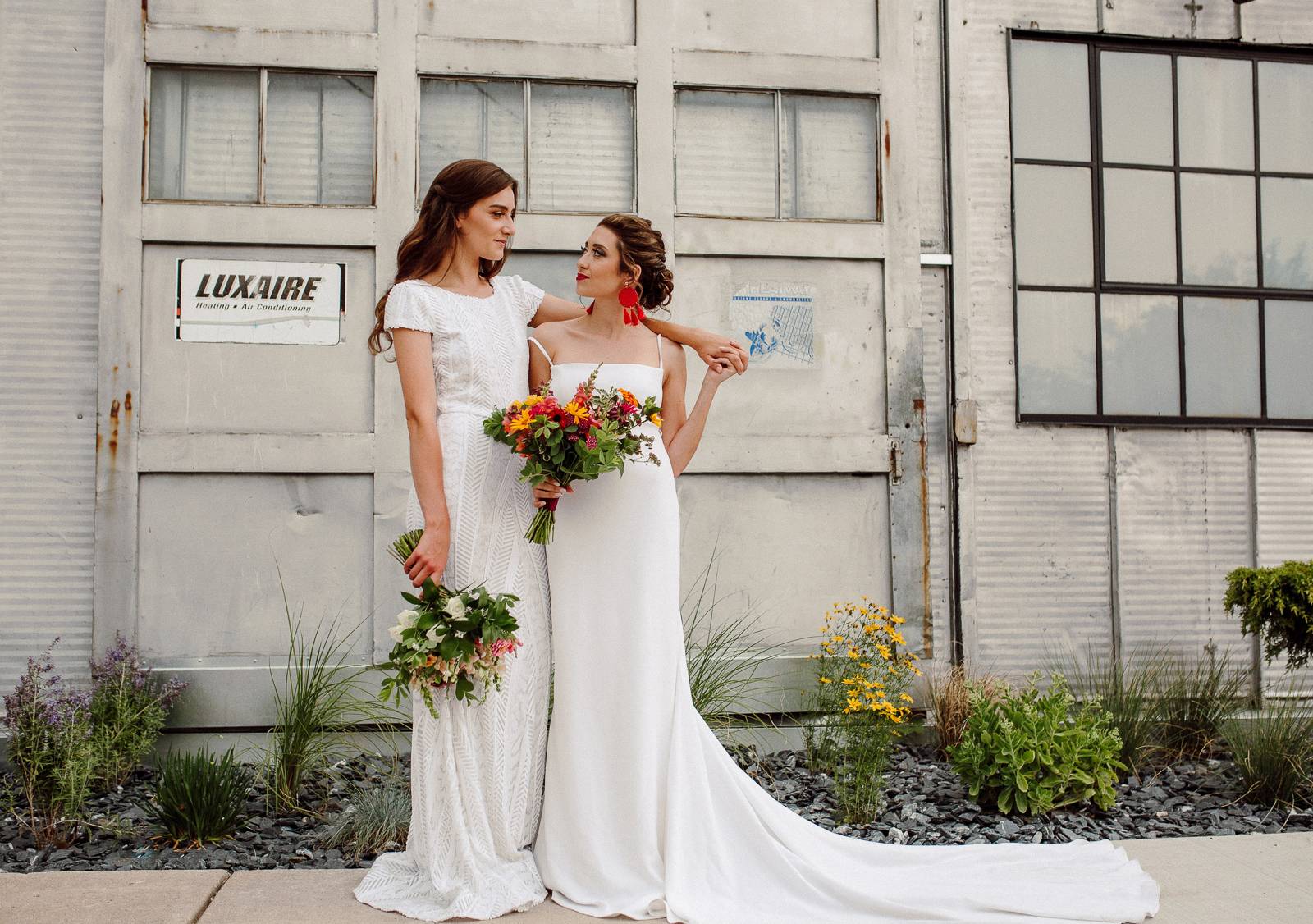 These same-sex brides are stunning, adorned in their modern, sleek, and simple gowns by Alyssa Kristin.