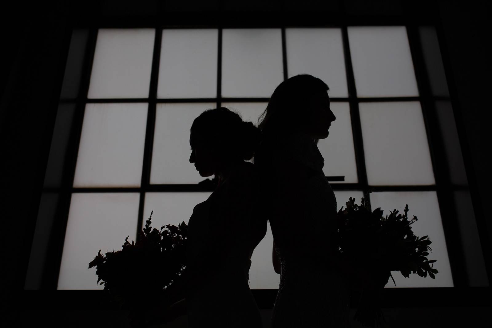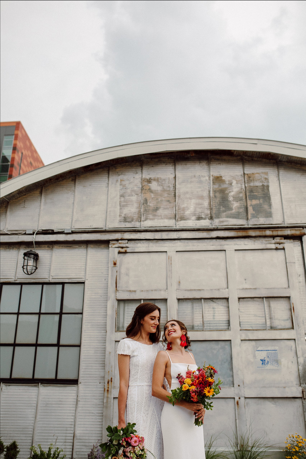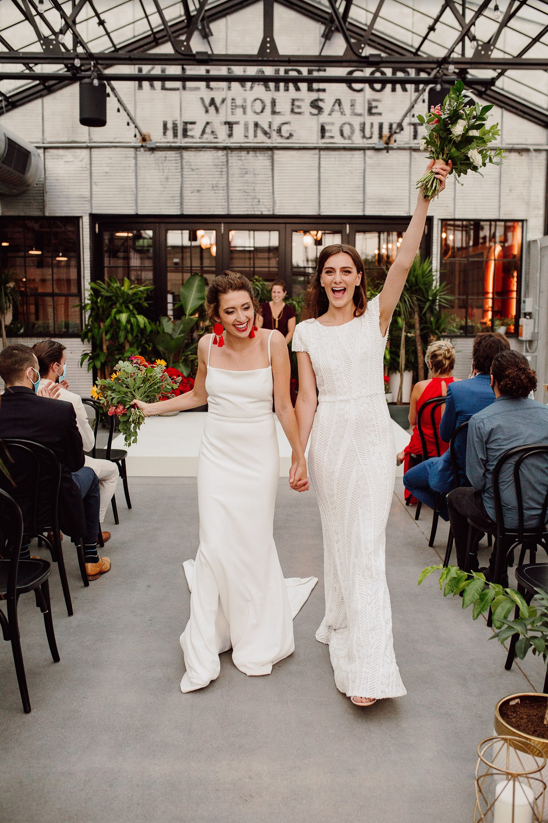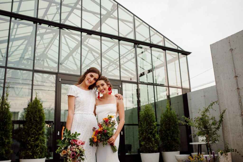 These same-sex brides are stunning, adorned in their modern, sleek, and simple gowns by Alyssa Kristin.