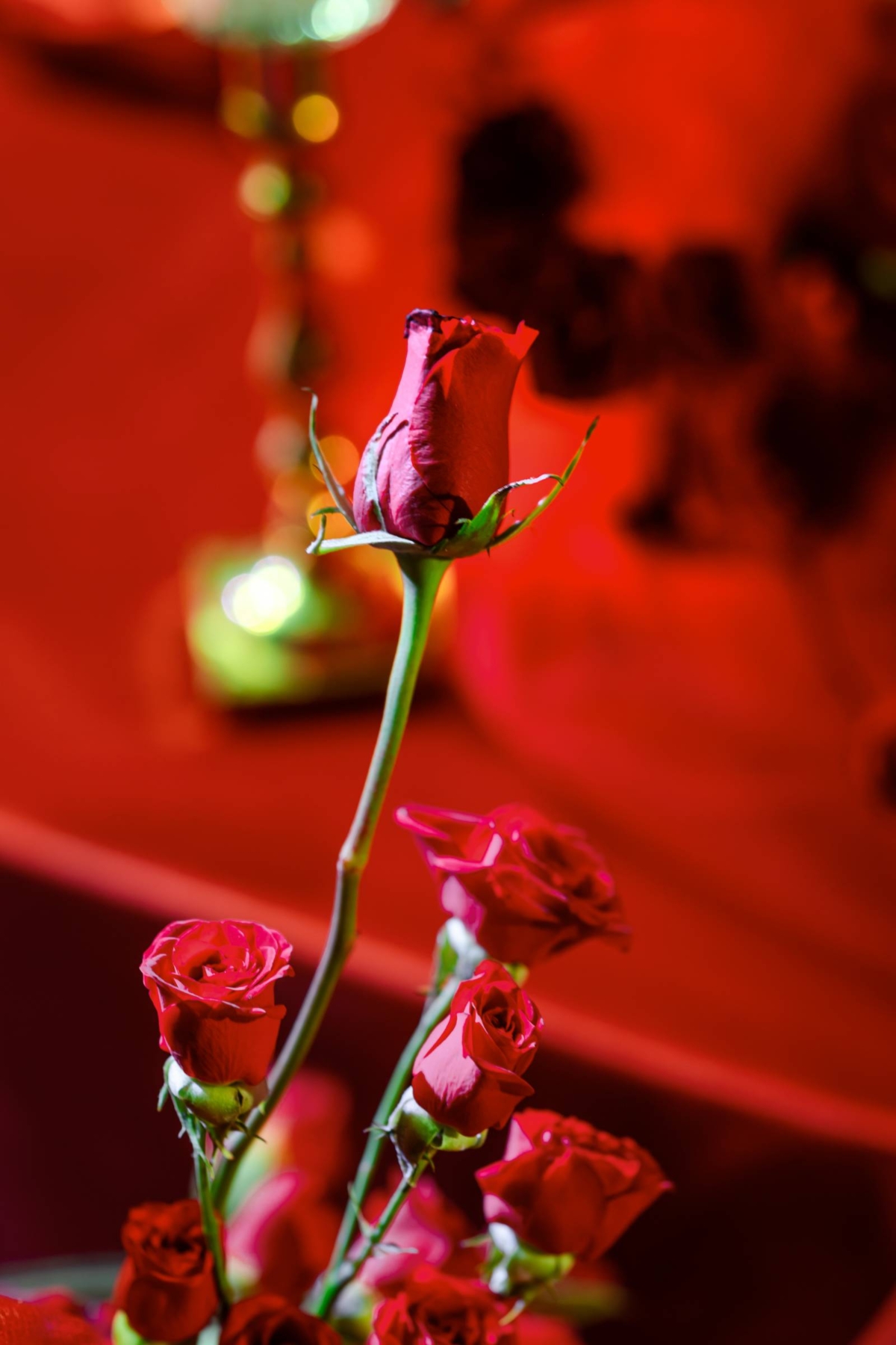 The bouquets, composed of red roses, were wrapped in tulle and included a microphone with electrical cord. The groom and best man wore coordinating floral lapel boutonnieres with a miniature silver microphone and secured with a red ribbon.