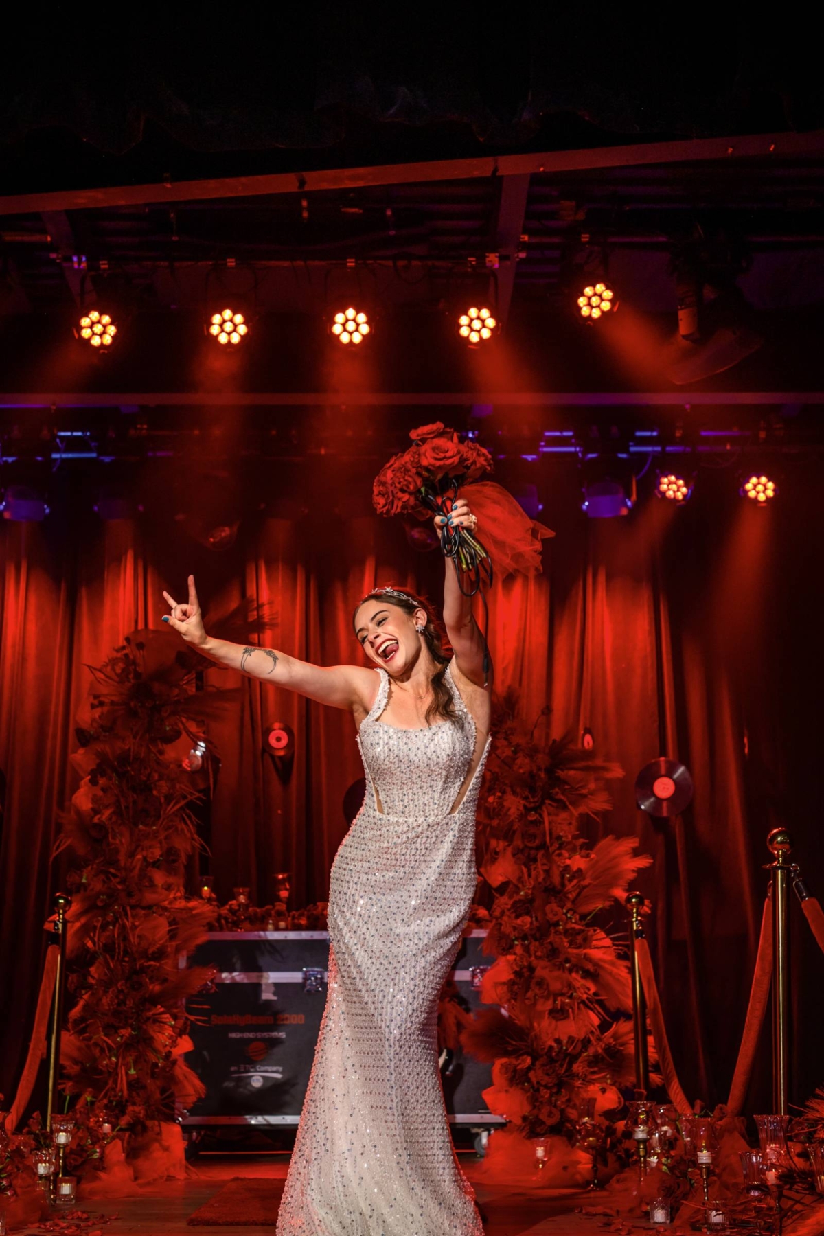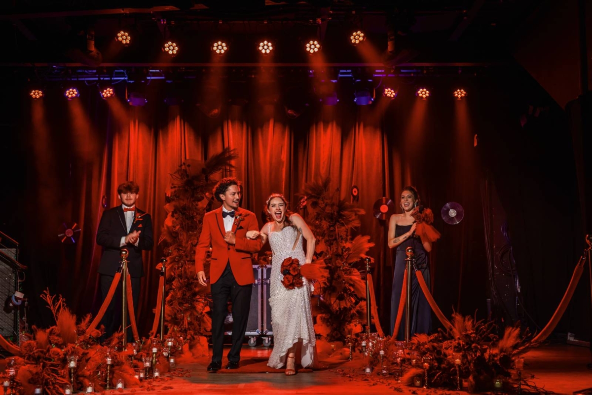 On the stage and beneath saturated red lights, the ceremony aisle was guided by velvet and gold stanchion ropes, florals, and candles. Florist Melody Rose Designs crafted a striking and unique backdrop, composed of an asymmetrical broken arch. They used a combination of fabrics, grasses, florals, and textures for a lush, artistic design that stood out against the lighting equipment, stage curtains, and hanging records.
