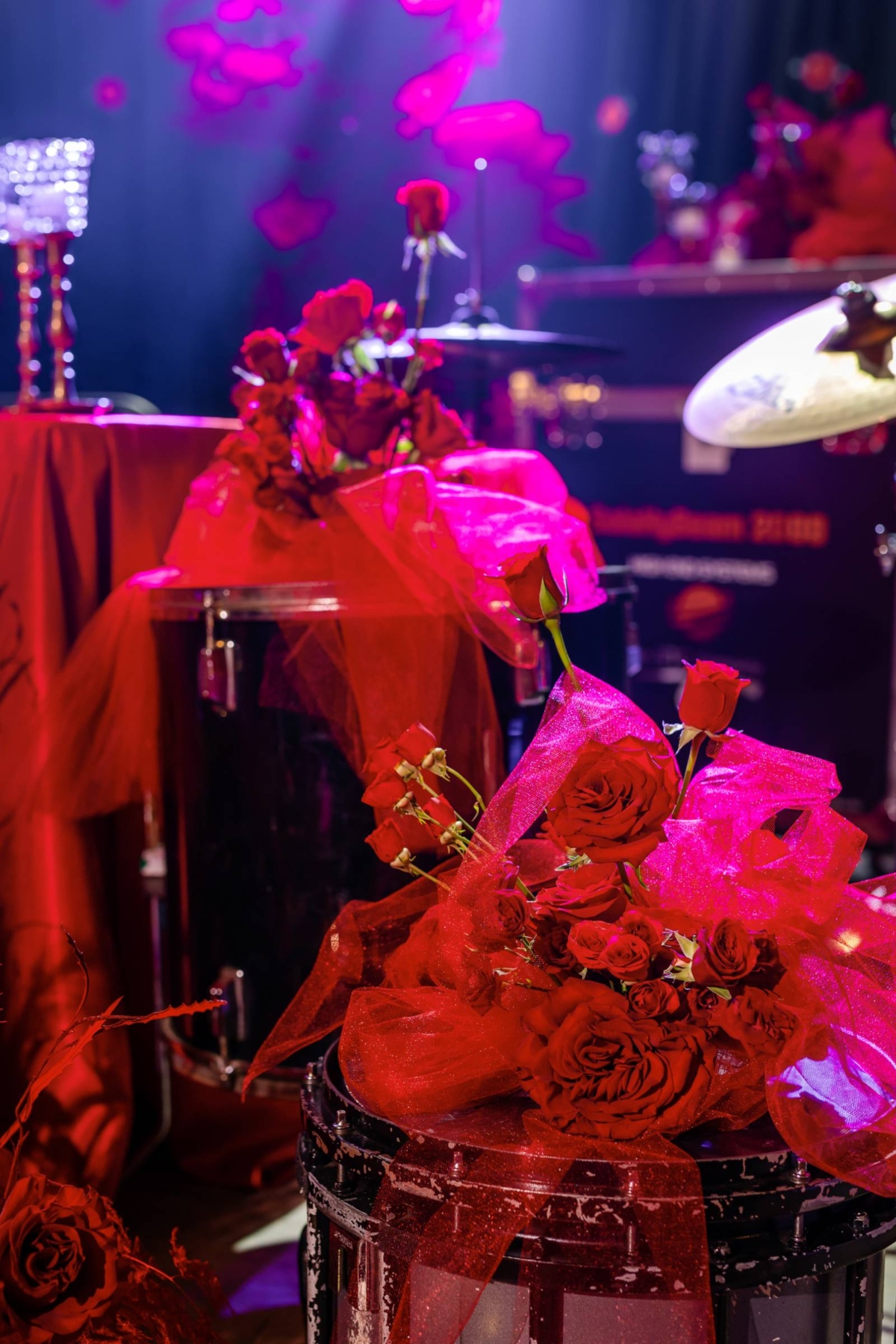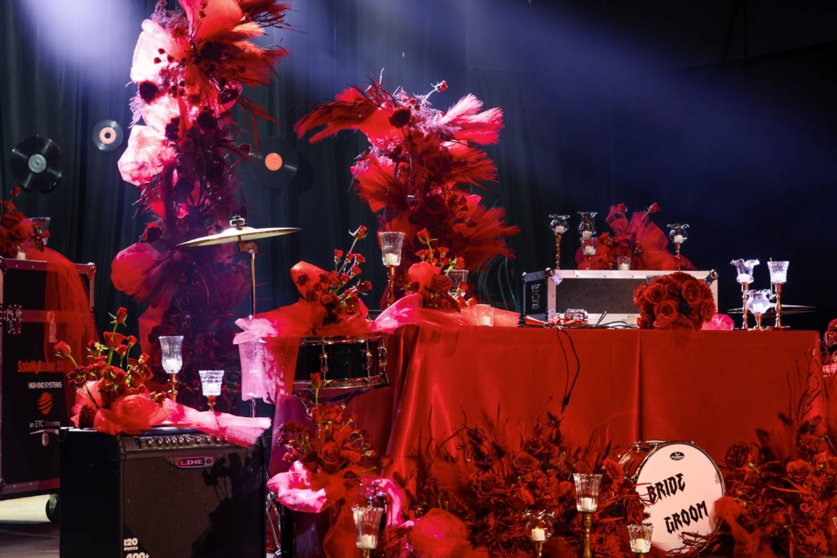 Melody Rose Designs repurposed the ceremony backdrop at the reception setup, with more rentals provided by both Melody Rose Rentals & Decor and Event Essentials. The design started with a sweetheart table on the stage, covered with a red tablecloth, with record chargers, crystal plates, silky linens, and crystal glassware. An assortment of props and florals surrounded the sweetheart table, including a snare drum with custom vinyl, amplifiers, cymbals, and other music equipment.