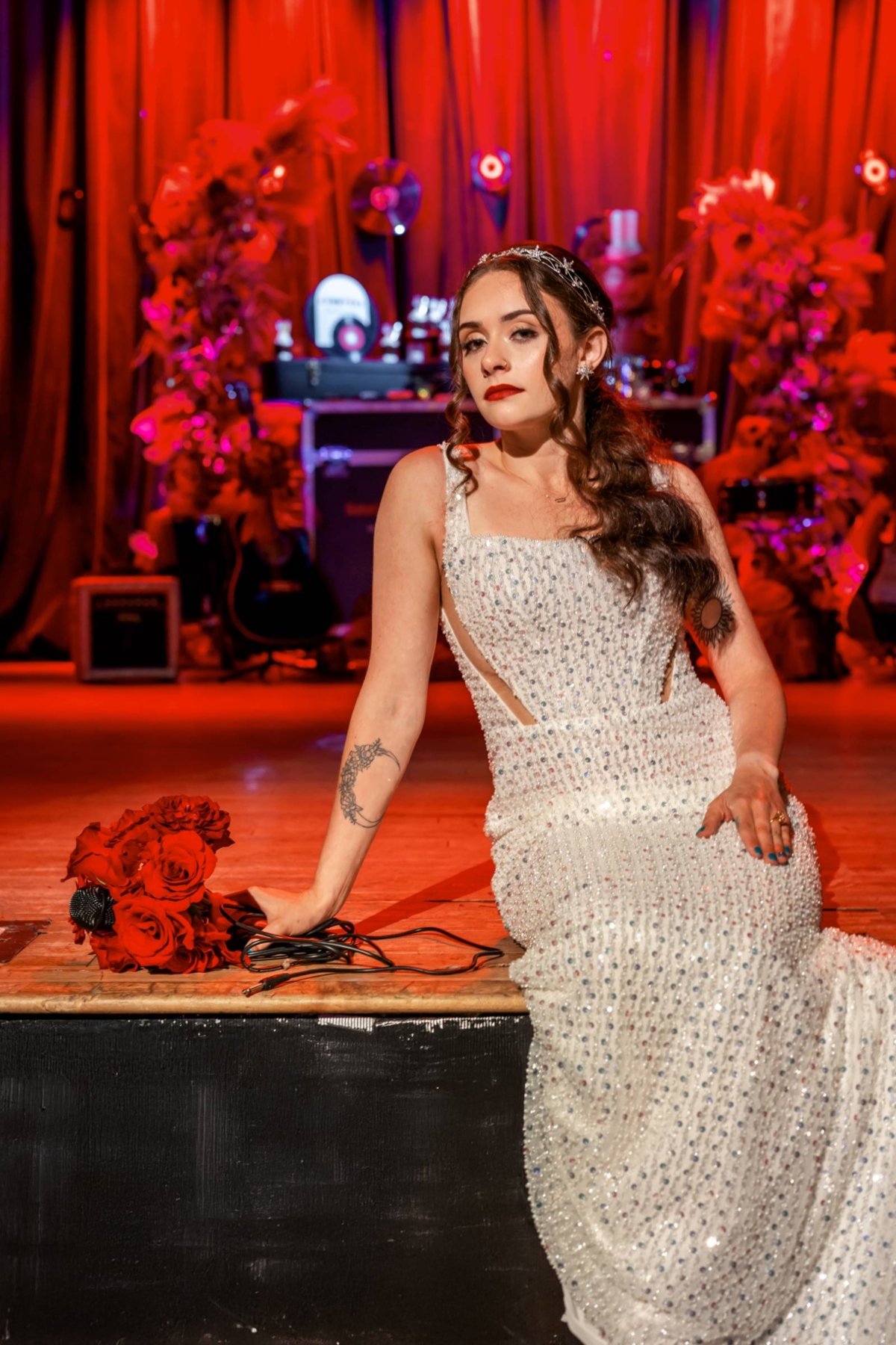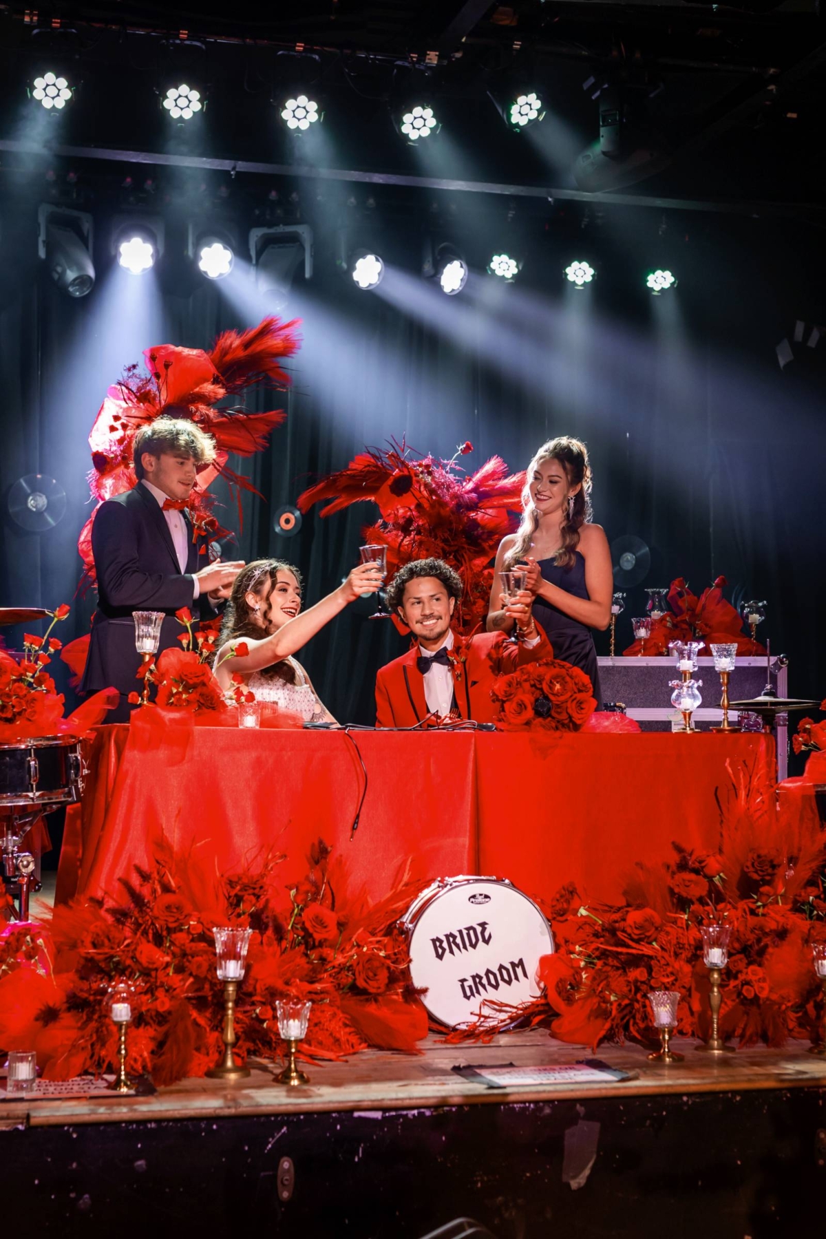 Step into the spotlight with this rockstar-inspired wedding editorial at Madison’s iconic Majestic Theatre. Bold black, crisp white, and fiery red set the tone for a dramatic, high-energy celebration filled with unforgettable details, including daring floral installations, vinyl records, musical instruments, and more.