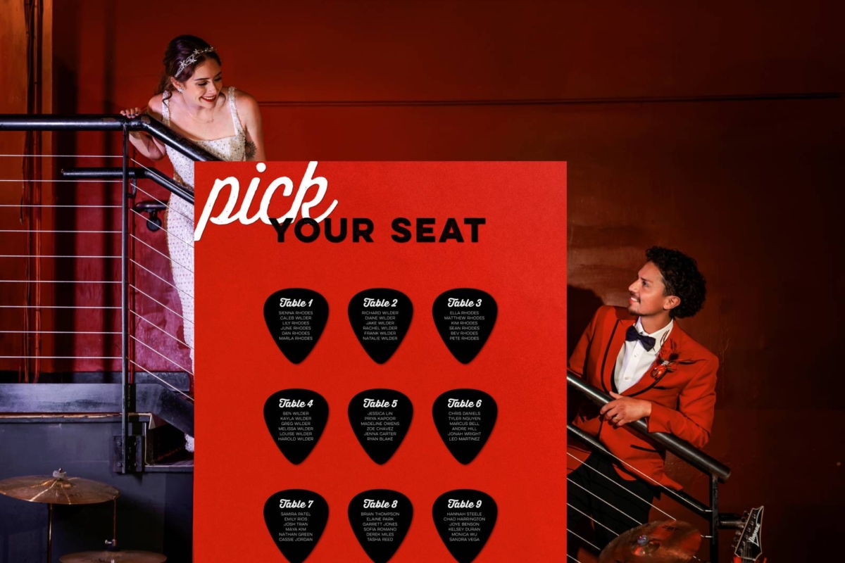 While the pieces largely included widely kerned sans-serif fonts, a script font was added to the envelope and accented throughout the signage. Other printed pieces included ticket name cards, a guitar-pick seating chart, a menu, merch signage, snack signage, drink and tattoo bar signs, announcement posters, and a dessert sign. LK Bridal Studio also produced vinyl graphics installed on a drum and a record. In addition, LK Bridal Studio designed and produced standout merch items, bringing an authentic concert vibe to the day.