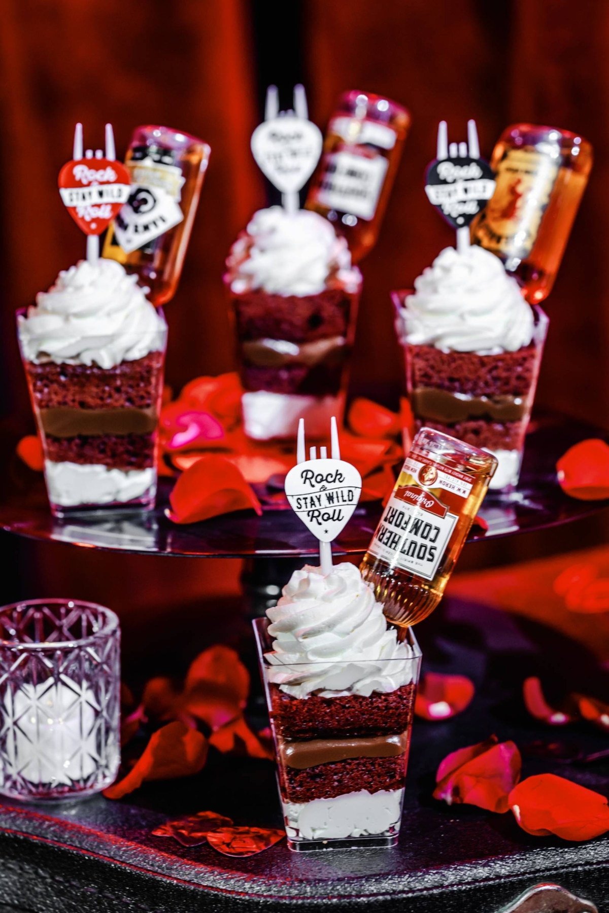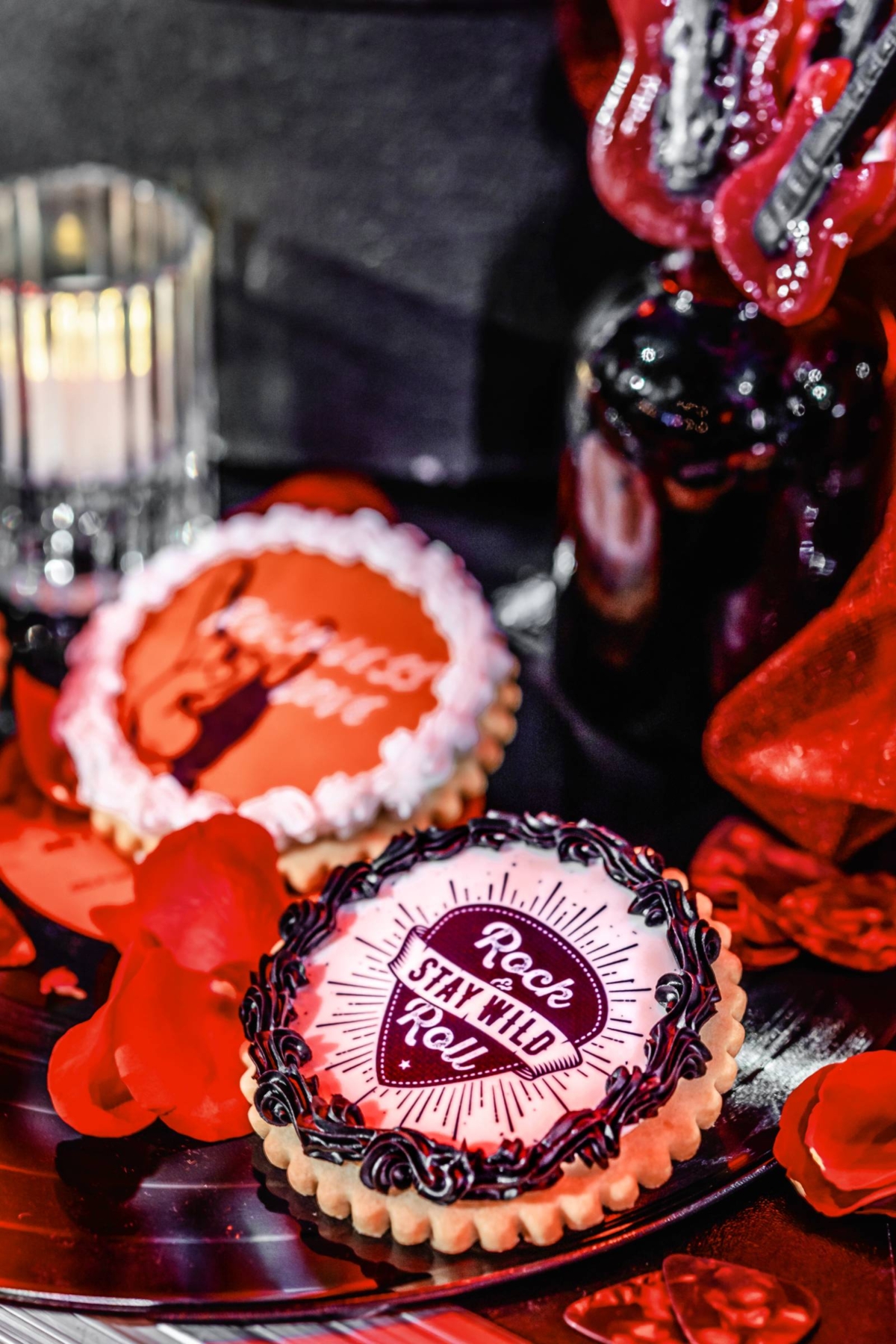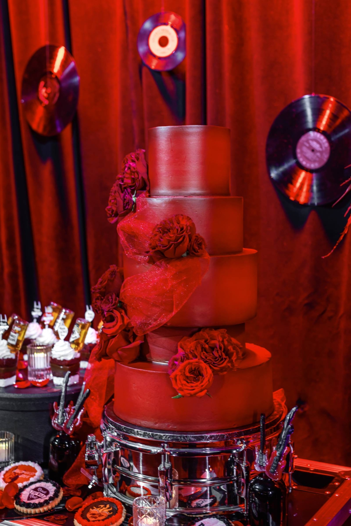 Multiple vendors contributed to the dessert table. Craig’s Cake Shop brought the centerpiece, a four-tier ombre red and black cake. They also provided an assortment of Afterparty Cake Shooters–dessert-cups with a kick–that were adorned with individual mini-bottle spirits. Also on the dessert table were printed and frosted sugar cookies from Sunny Celebrations, and guitar-shaped lollipops from Lily’s Magical Treats.
