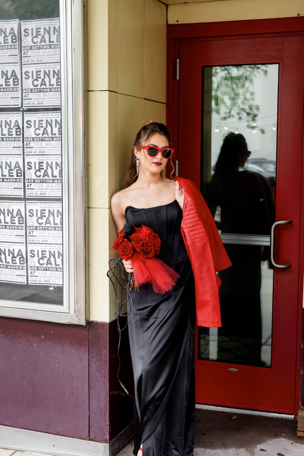 Outside, posters and a custom marquee decorated the Majestic Theatre, showcasing the couple’s wedding. The bride’s second look, a bit more relaxed, was a sheath gown with a deep-v neckline adorned with three white bows. For the second-look photos, the bride also wore a leather jacket, red wedges, and sunglasses. The groom changed out his suit coat and vest in favor of a leather jacket and dark sunglasses.