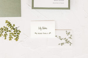 Flying Rabbit Press offers enchanting letterpress designs with a delightful blend of cream and green hues accented by blush pink. Earthy vining motifs add a touch of natural charm. The airy invitation is layered on a matte green panel with a pocket on the back, allowing supporting pieces to be neatly enclosed. The endearing botanical designs continue through the wedding program and place cards, continuing the lovely aesthetic.