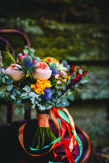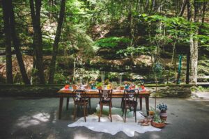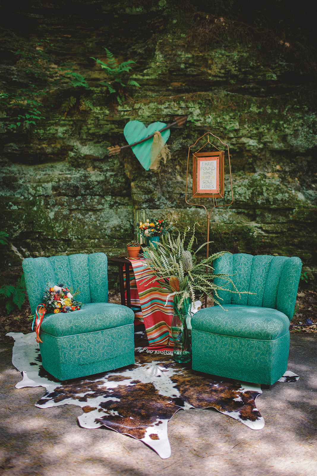Nestled deep into the cliffs along the Wisconsin River, sits the hidden glen of Cold Water Canyon with towering pines, sandstone bluffs and lush fern gardens. This was the perfect secluded and idyllic setting for this Native American inspiration wedding scape that includes bright, bold seasonal colors and textured patterns, designed by LK Bridal Studio. This was beautifully captured by Abbots Lane with Aztec details, wood elements, beautiful blooms, greenery and the cutest pony EVER.