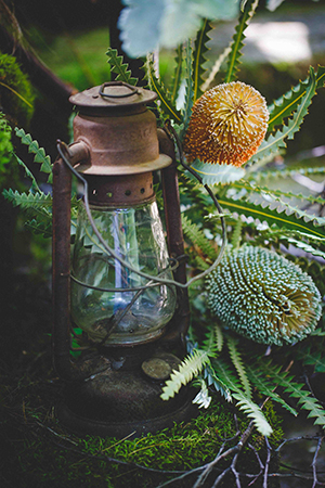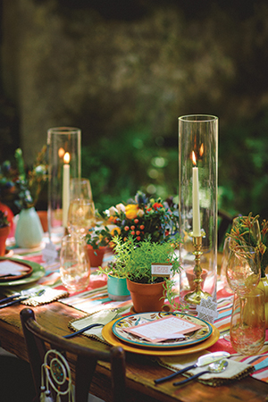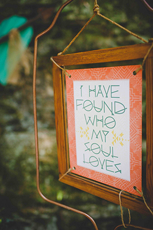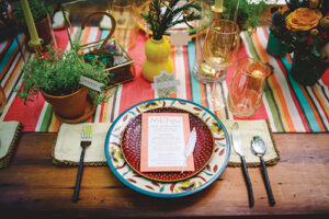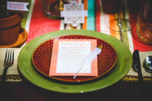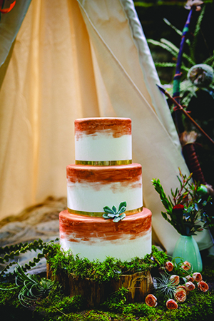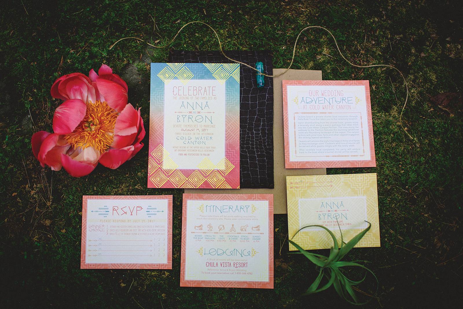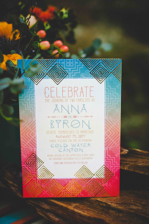 Lindsey of LK Bridal Studio explains, “The Native Romance scape was a design I have been considering for a while. Growing up on a ranch, my youth centered around horses and the southwestern lifestyle, even though we lived in Wisconsin. I wanted to create a scape that had bold colors and patterns, a gorgeous mix of succulents and cacti, with rustic, natural accents showcased in a dramatic organic setting. The invitation suite was really the building block for the scape. The Aztec design with a wash of the intense colors created a stunning base. The addition of the primitive fonts complimented the design and geometric foil stamp provided extra depth and texture.”