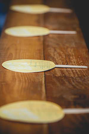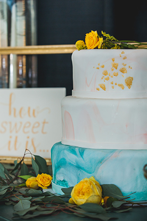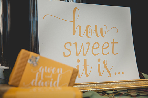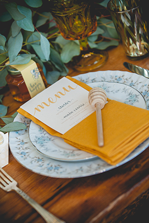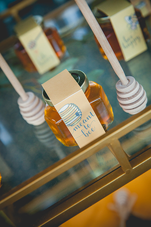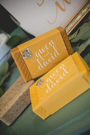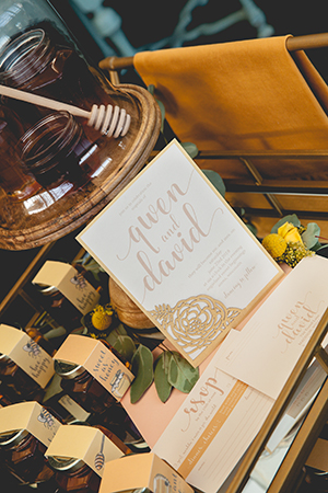 Lindsey from LK Bridal Studio explains, “The Naturally Sweet concept actually started stirring at the 2016 Winter Bridal Show. At that show, we were across from a honey vendor and after two days of chatting, the honey scape was born. I thought is would be a fantastic and fun design to put together. It was that and more! I decided to really embrace honey and it’s natural wonder. The actual nectar, the colors, and the warm-fuzzy emotions that it inspires. The whole scape is bursting with honey inspired details. From honey and honey-soap favors to honeycomb shaped name cards and more. The invitation even incorporates a laser flower cutout in a gorgeous, soft yellow pearl paper. And, oh my, the fragrance from all the honey and soaps was so enticing.”