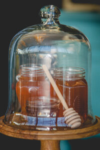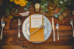 Lindsey from LK Bridal Studio explains, “The Naturally Sweet concept actually started stirring at the 2016 Winter Bridal Show. At that show, we were across from a honey vendor and after two days of chatting, the honey scape was born. I thought is would be a fantastic and fun design to put together. It was that and more! I decided to really embrace honey and it’s natural wonder. The actual nectar, the colors, and the warm-fuzzy emotions that it inspires. The whole scape is bursting with honey inspired details. From honey and honey-soap favors to honeycomb shaped name cards and more. The invitation even incorporates a laser flower cutout in a gorgeous, soft yellow pearl paper. And, oh my, the fragrance from all the honey and soaps was so enticing.”
