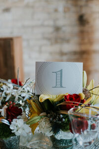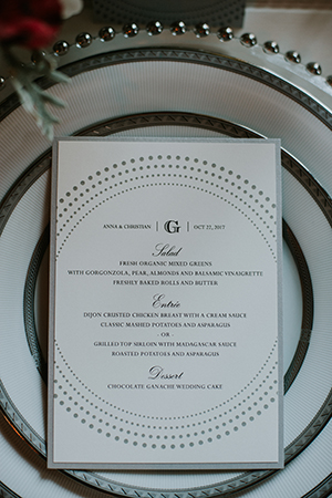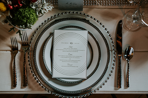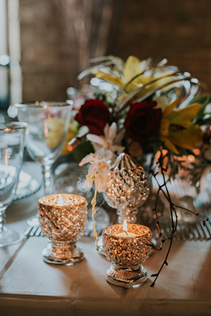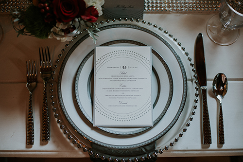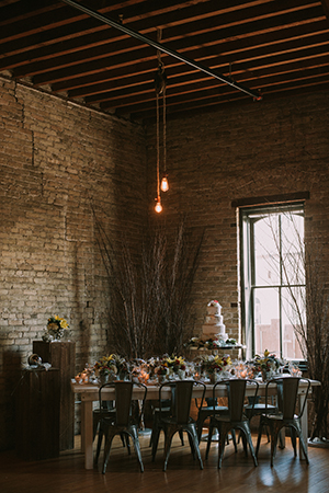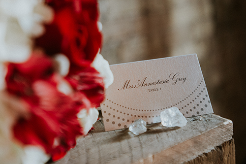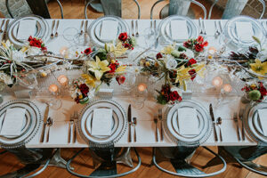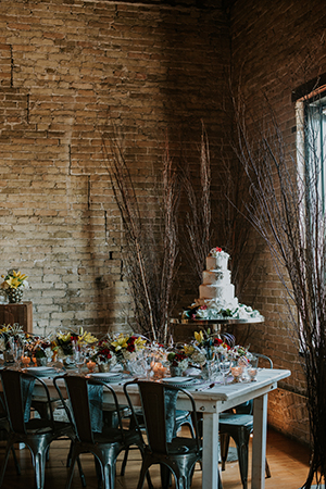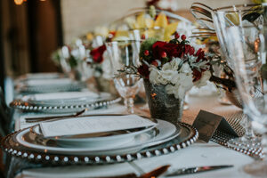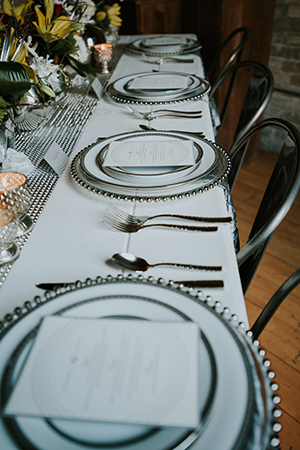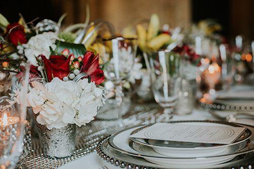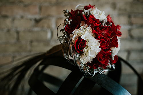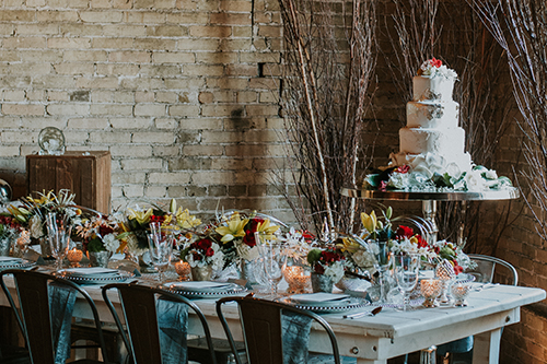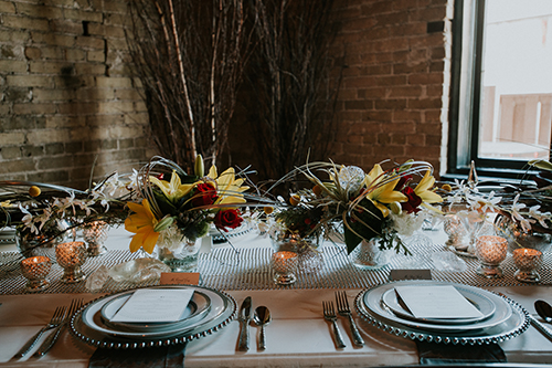 Taking place at one of Stoughton’s newest wedding venues in a charming old historic tobacco warehouse, The Lageret, is today’s beautiful urban rendezvous wedding scape. With exposed brick and wooden beam ceilings, this scape was designed by John with Surroundings Events & Floral and shot by Karly Jo Photography. Soft gray and white table settings with silver metallics give industrial yet elegant inspiration for a stunning warehouse wedding with lush red, white and yellow blooms.