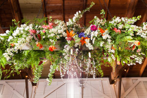 The Flower Studio installed lush greenery, pretty orange, pink, purple, white and maroon blooms throughout the space in the centerpieces, accenting the cake and hung from the ceiling above the stunning chandelier.