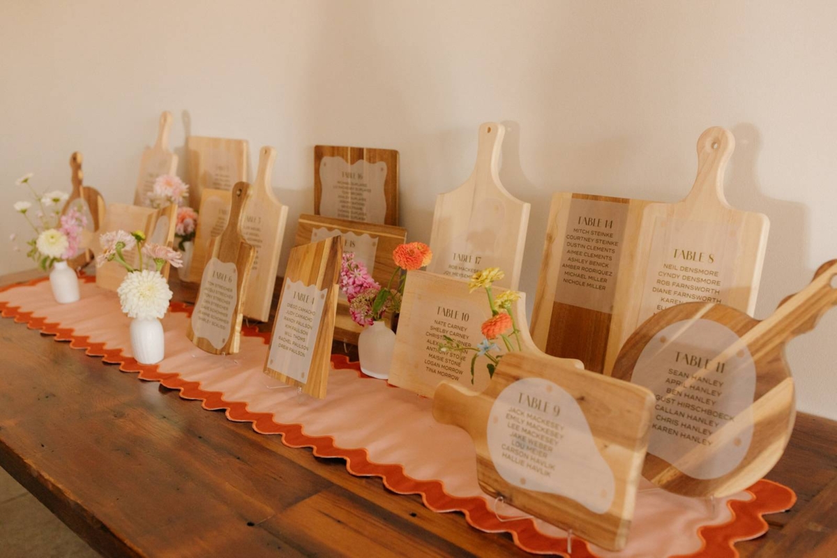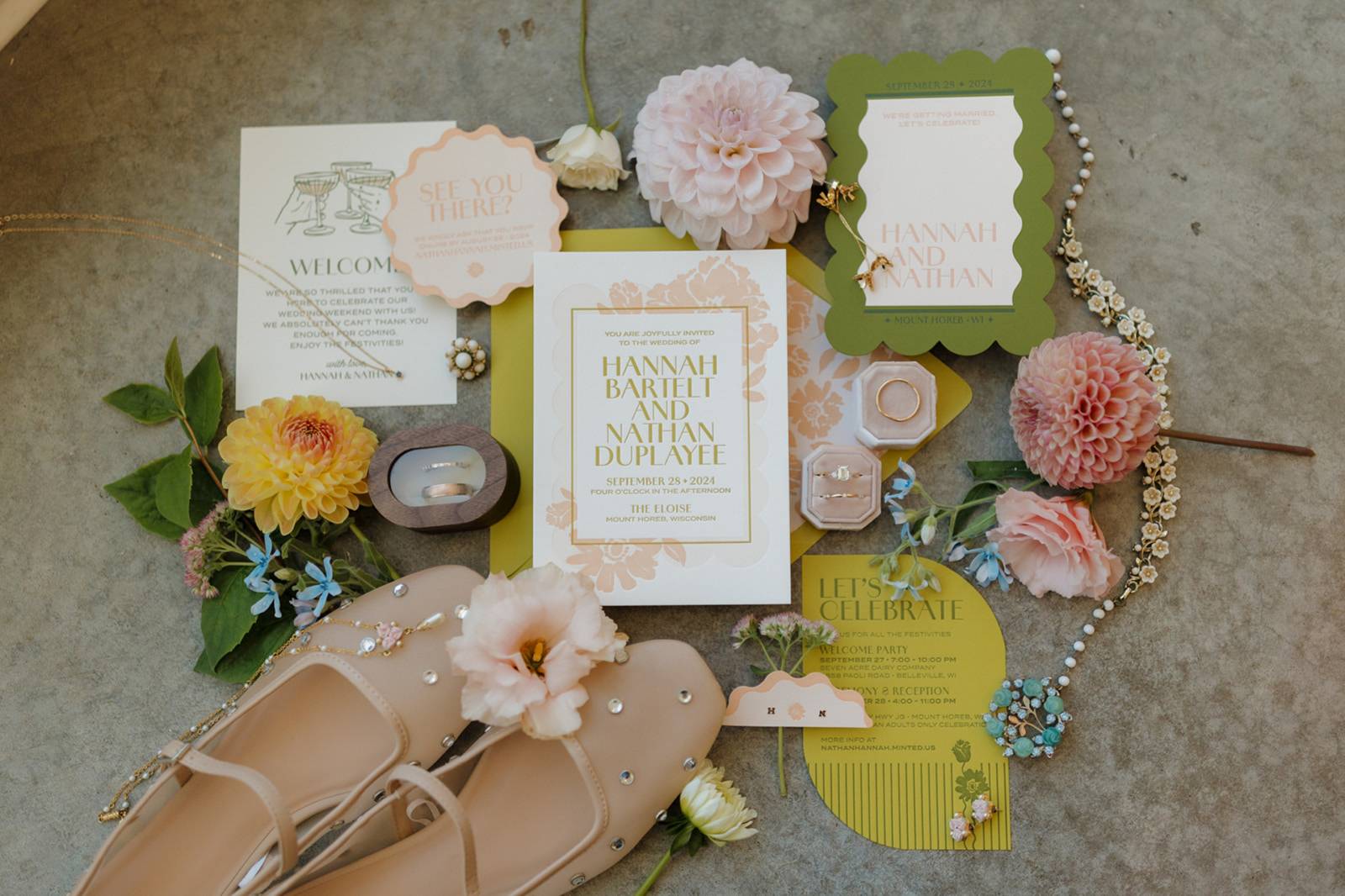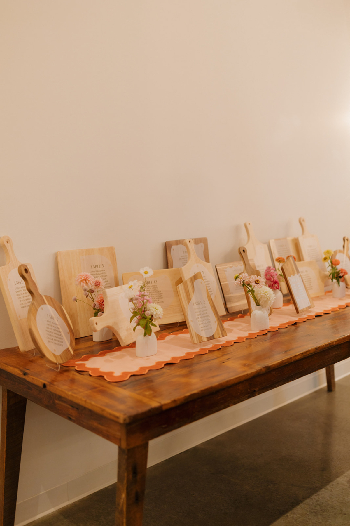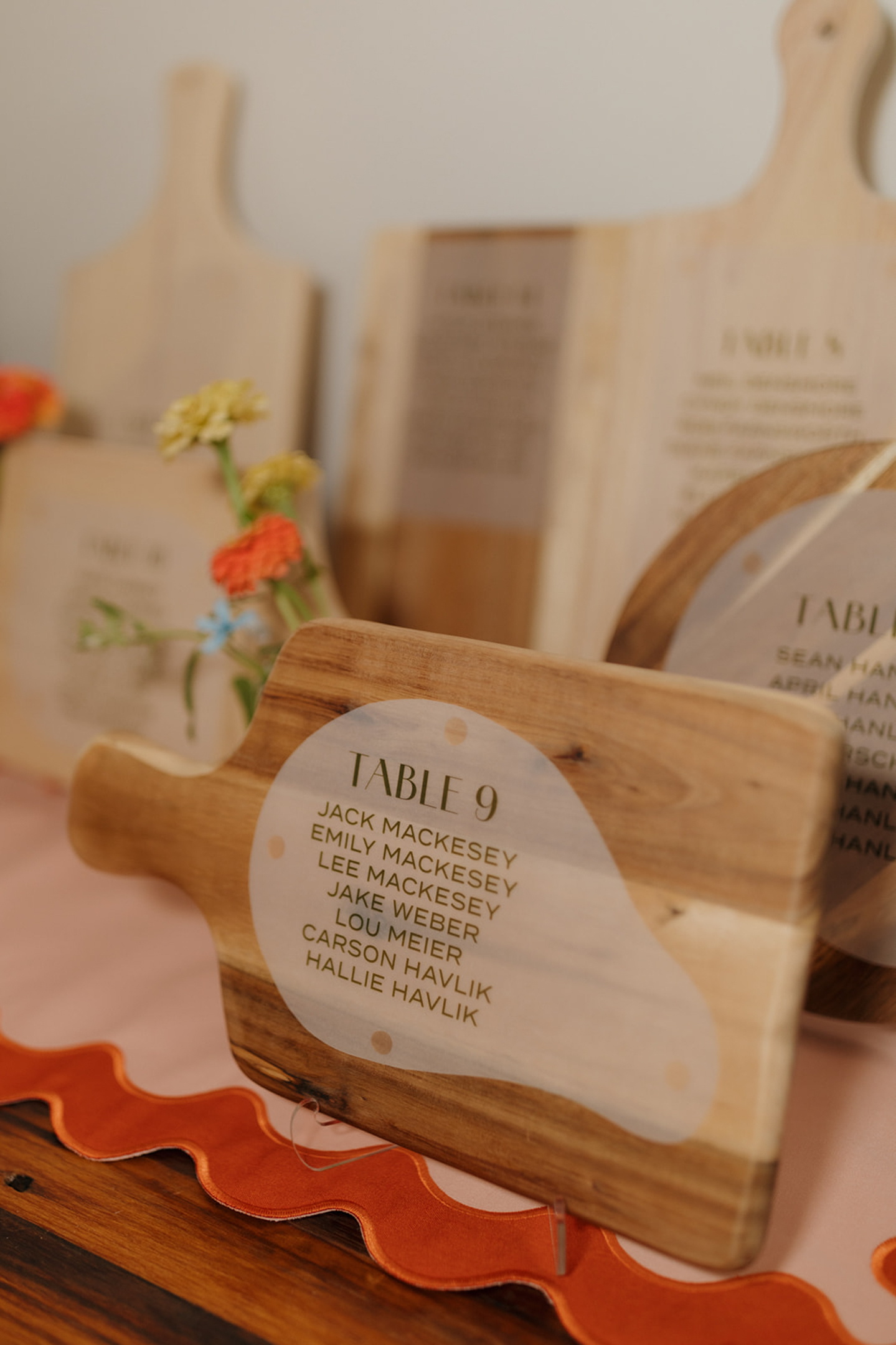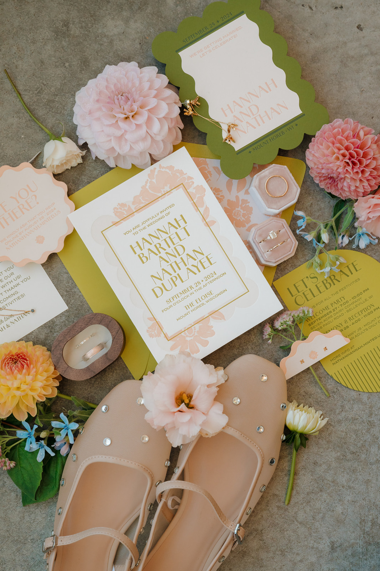 Located a short drive away in Milwaukee, Bay View Printing Co. specializes in custom graphic design and letterpress printing. They embraced Hannah and Nathan’s whimsical and welcoming style, creating stationery pieces in unique shapes and contour cuts. The color palette for the celebration was bright and warm, featuring peach, pinks, pops of blue and green, mustard, and wooden hues.