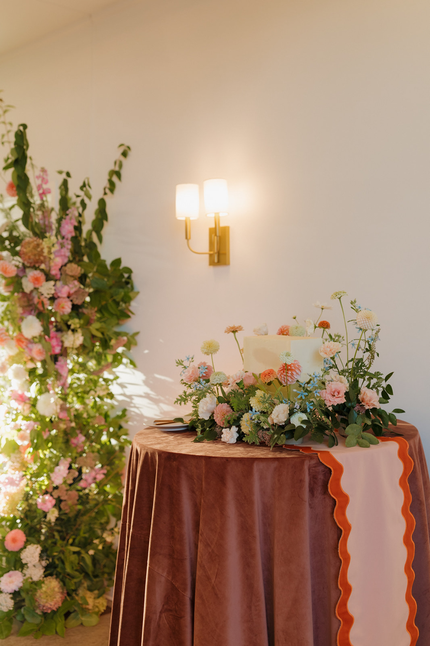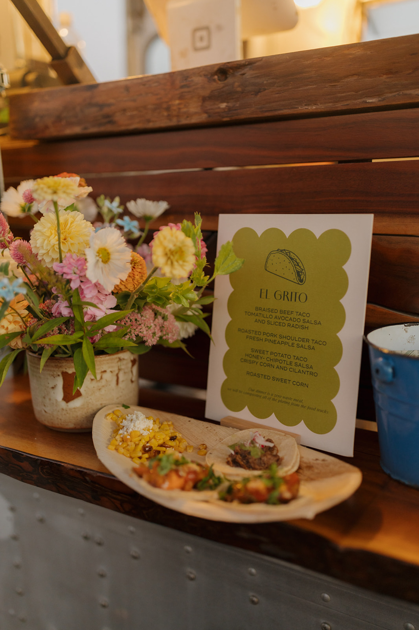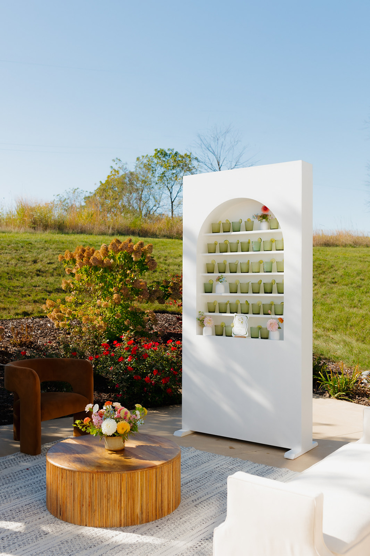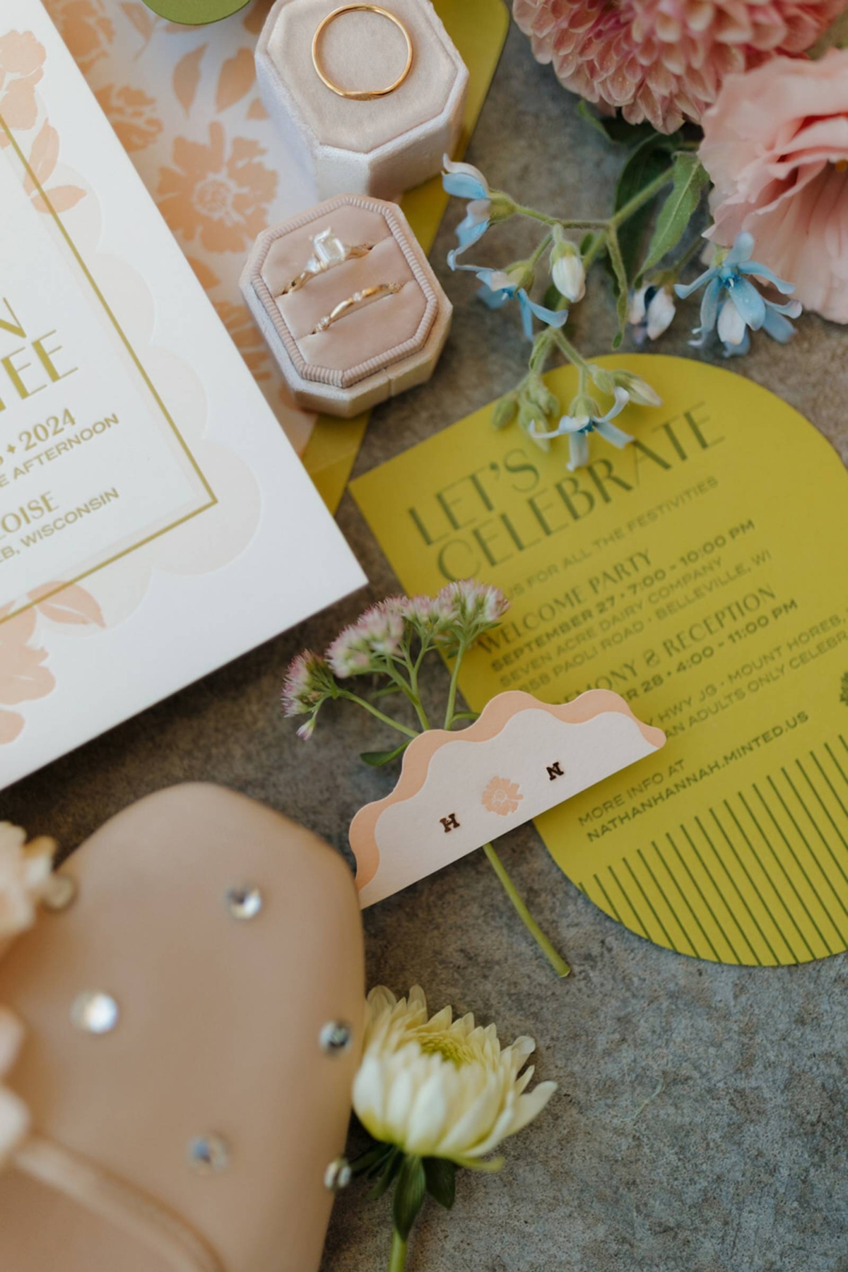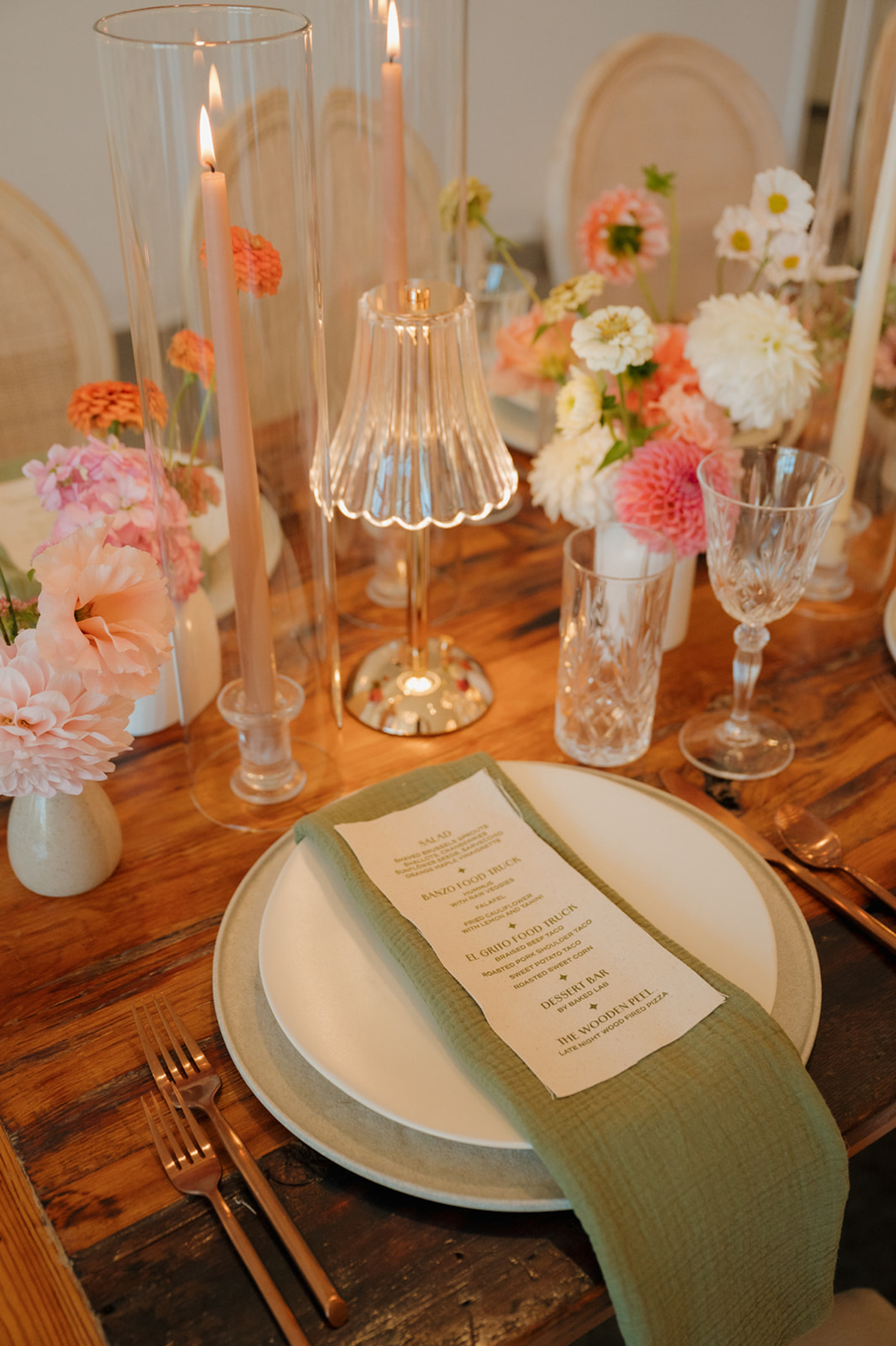 Located a short drive away in Milwaukee, Bay View Printing Co. specializes in custom graphic design and letterpress printing. They embraced Hannah and Nathan’s whimsical and welcoming style, creating stationery pieces in unique shapes and contour cuts. The color palette for the celebration was bright and warm, featuring peach, pinks, pops of blue and green, mustard, and wooden hues.