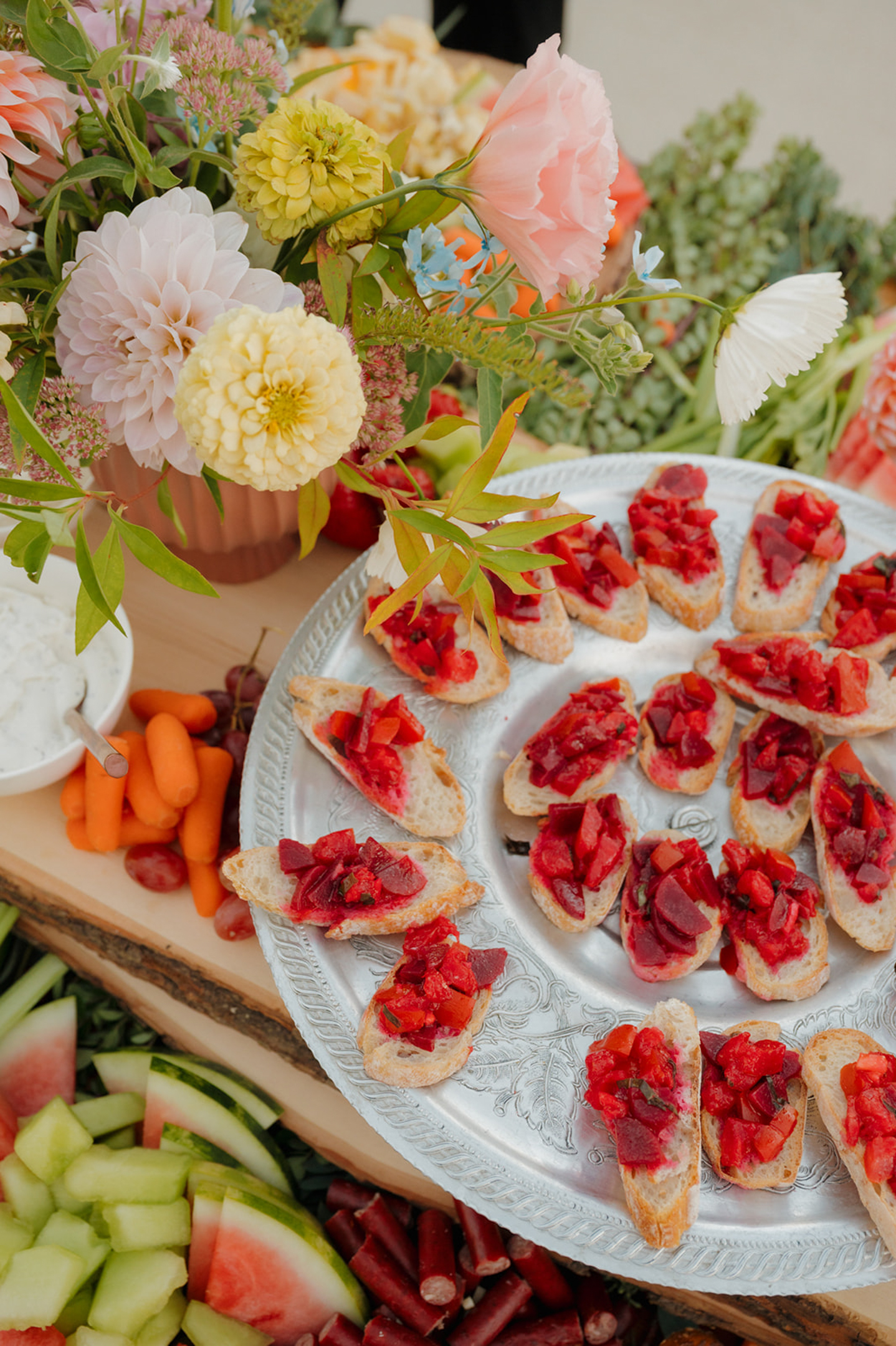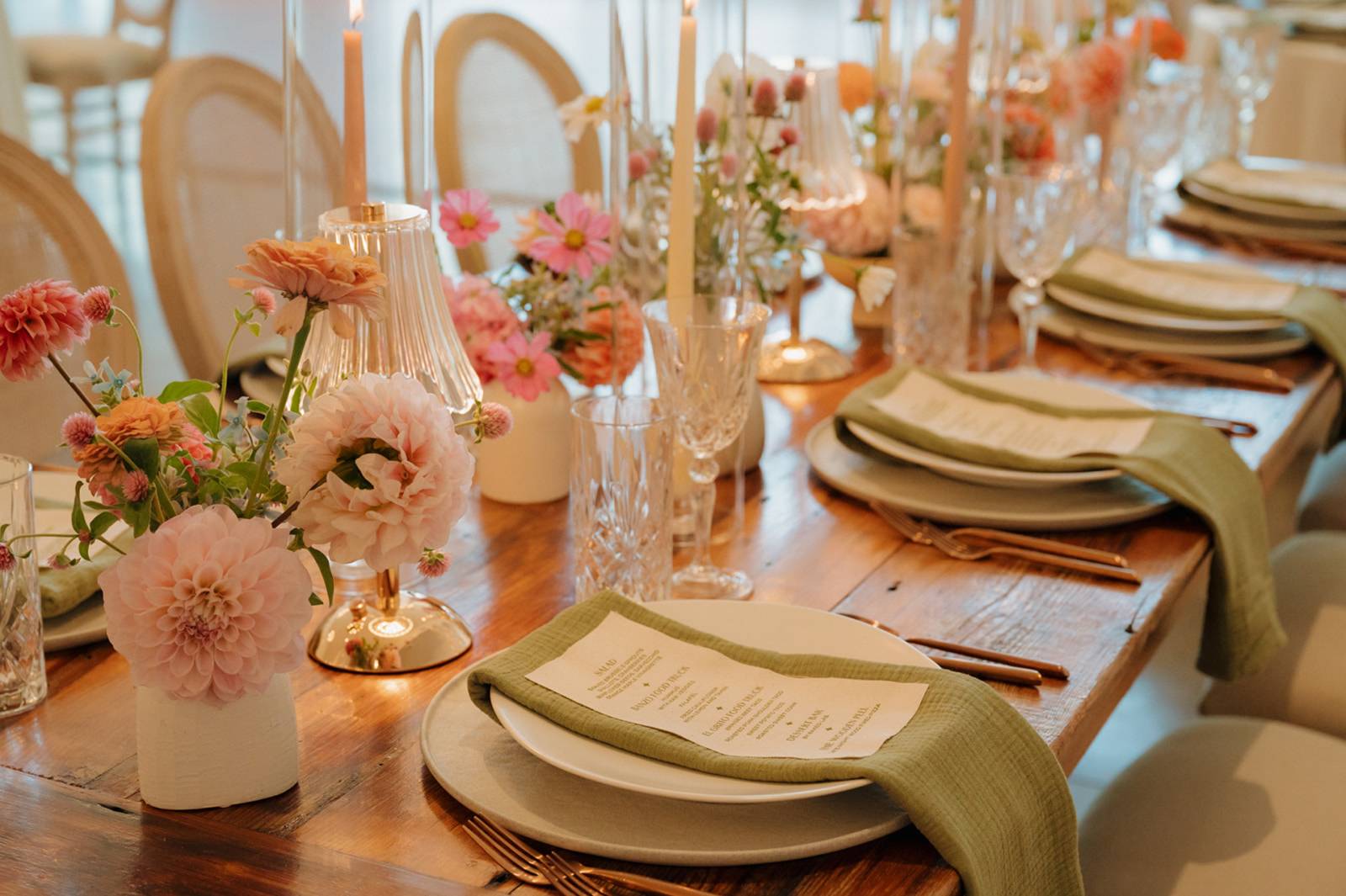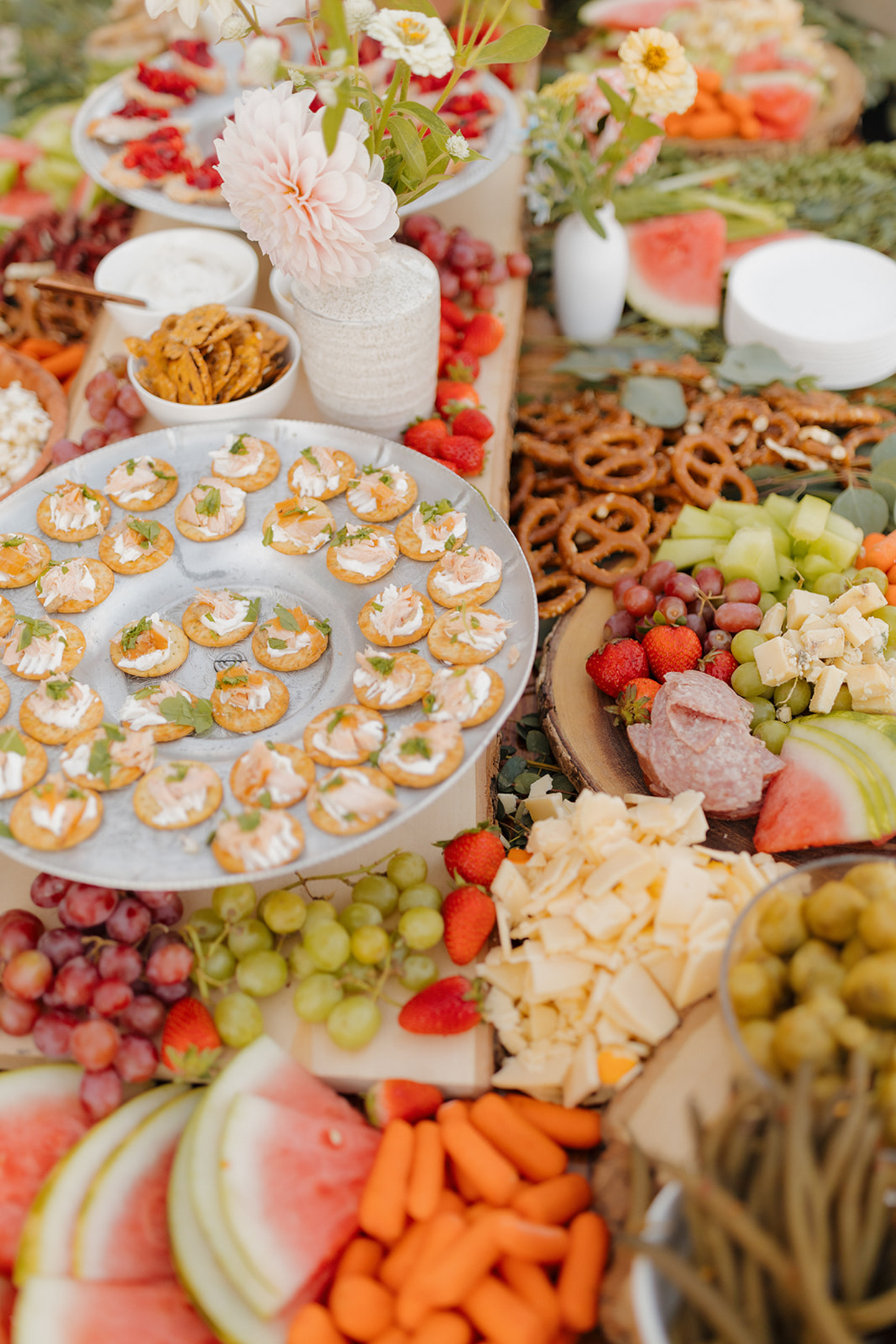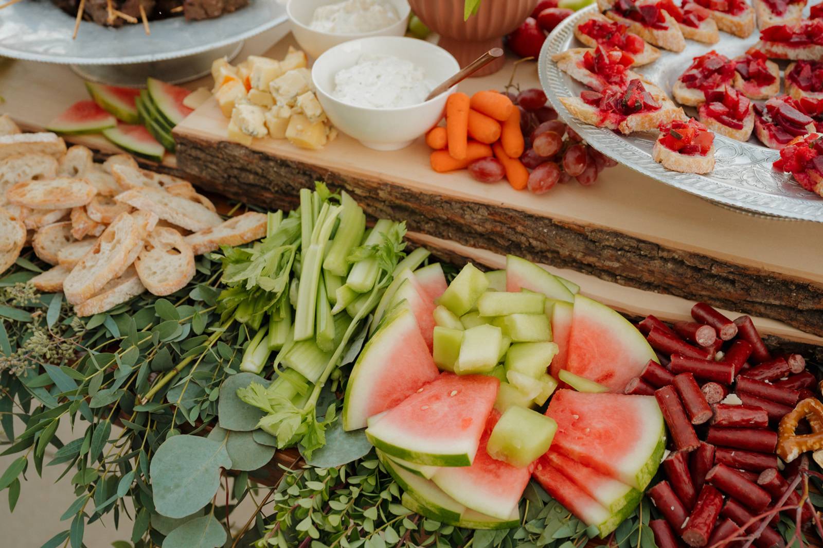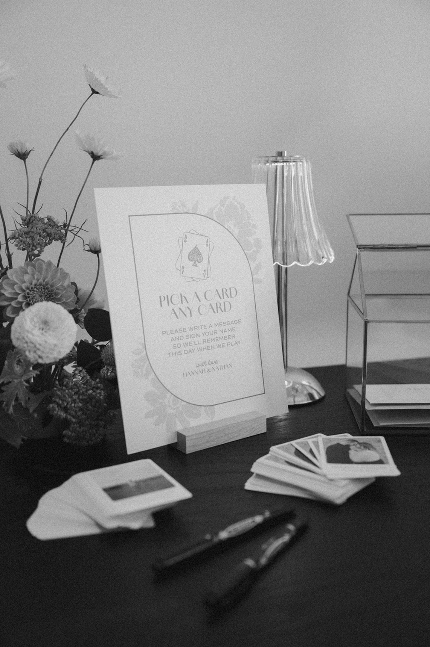 Located a short drive away in Milwaukee, Bay View Printing Co. specializes in custom graphic design and letterpress printing. They embraced Hannah and Nathan’s whimsical and welcoming style, creating stationery pieces in unique shapes and contour cuts. The color palette for the celebration was bright and warm, featuring peach, pinks, pops of blue and green, mustard, and wooden hues.