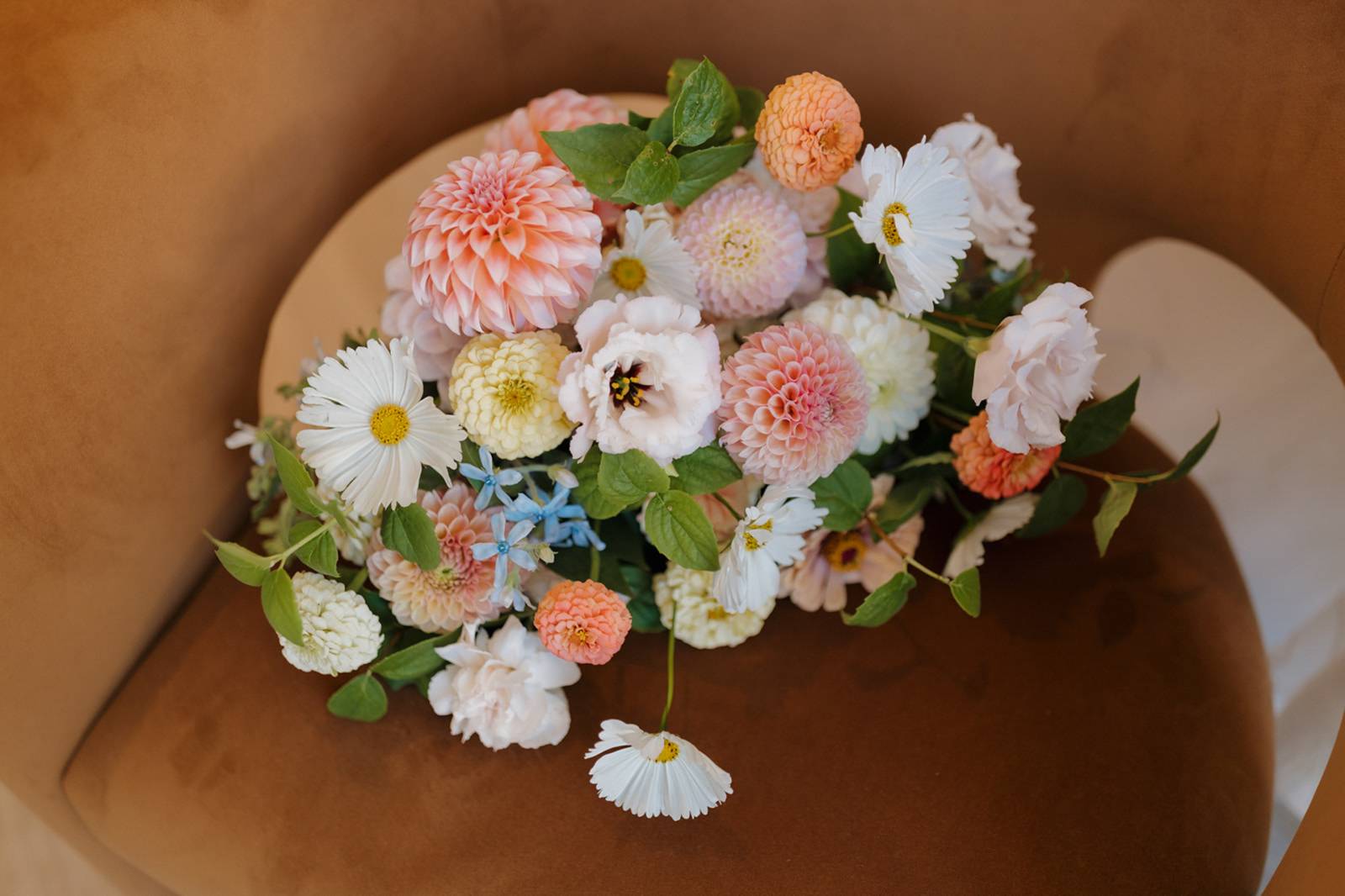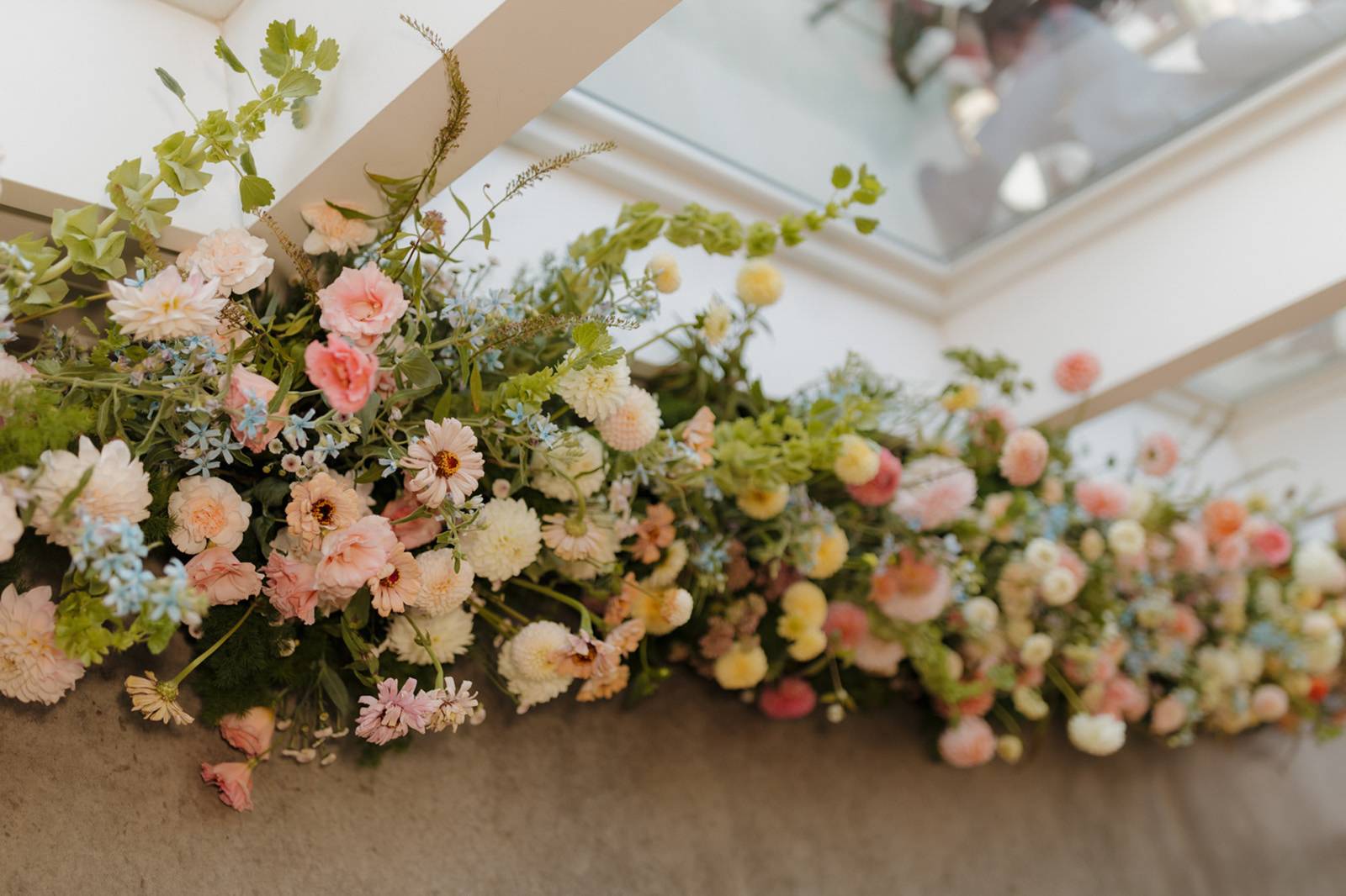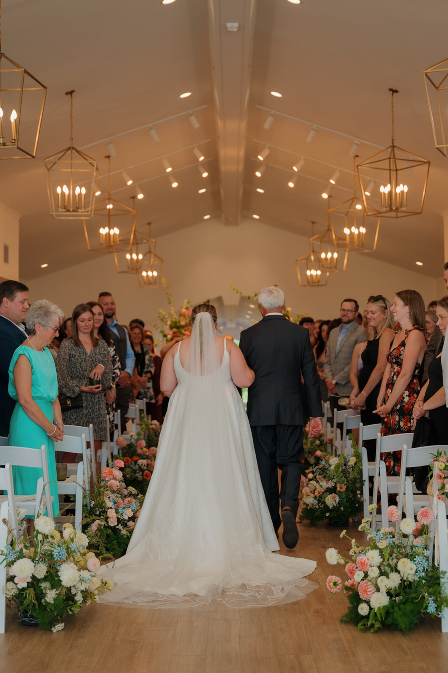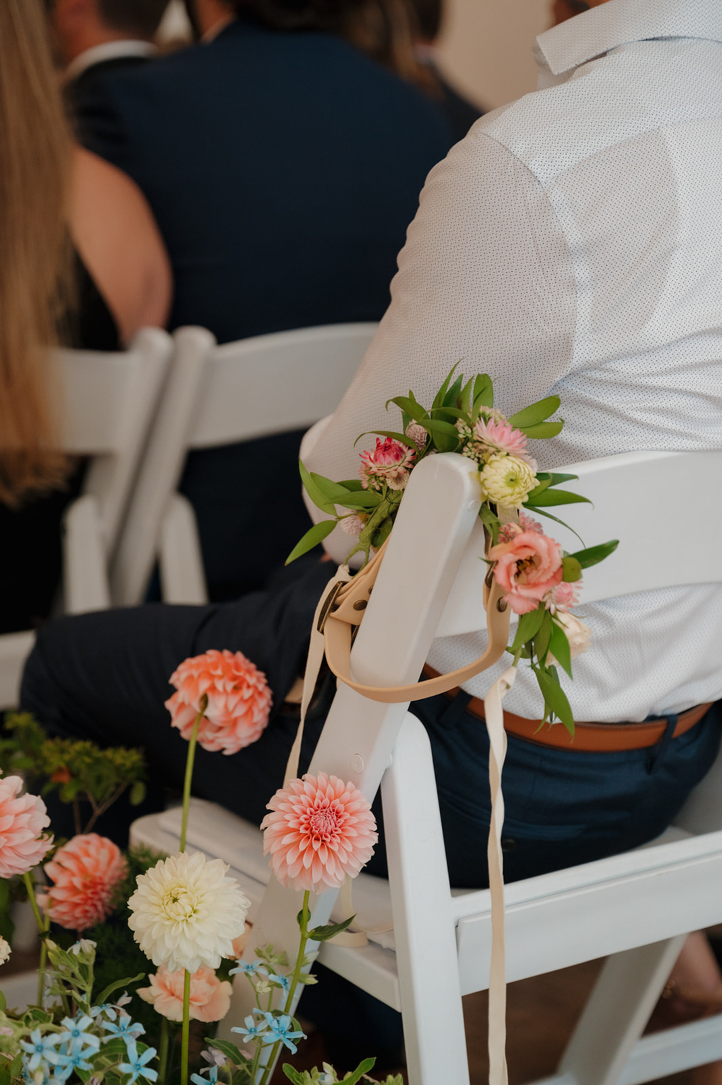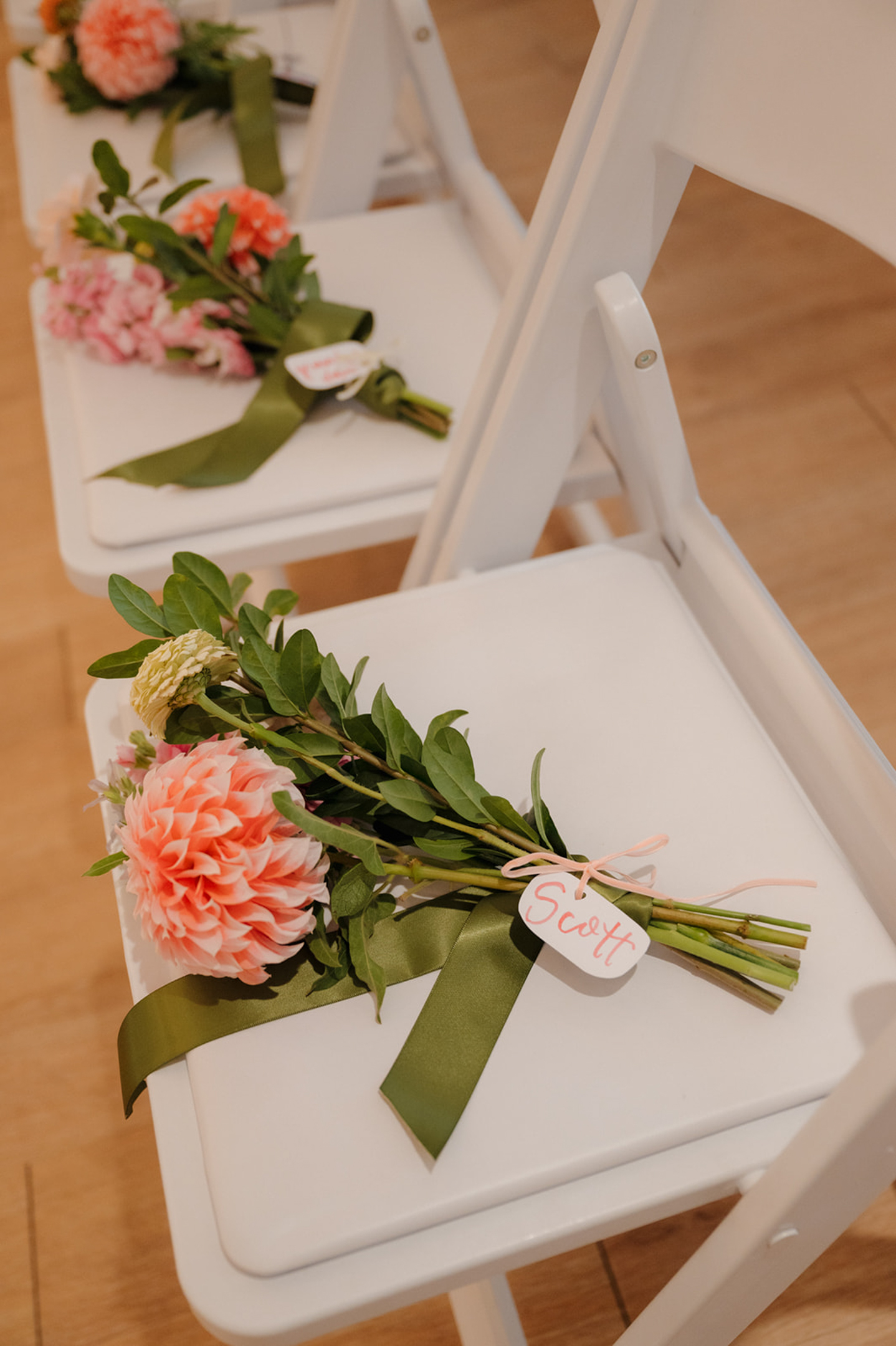 Sunborn Gardens provided a vast array of floral pieces for the day, including a lush, towering broken flower arch for the ceremony placed behind the couple and overlooking the reception space on the ground floor. Other florals included artful aisle arrangements, bud vases, bouquets, boutonnieres, and smaller, sentimental bouquets placed on chairs reserved for guests who were unable to attend the ceremony.