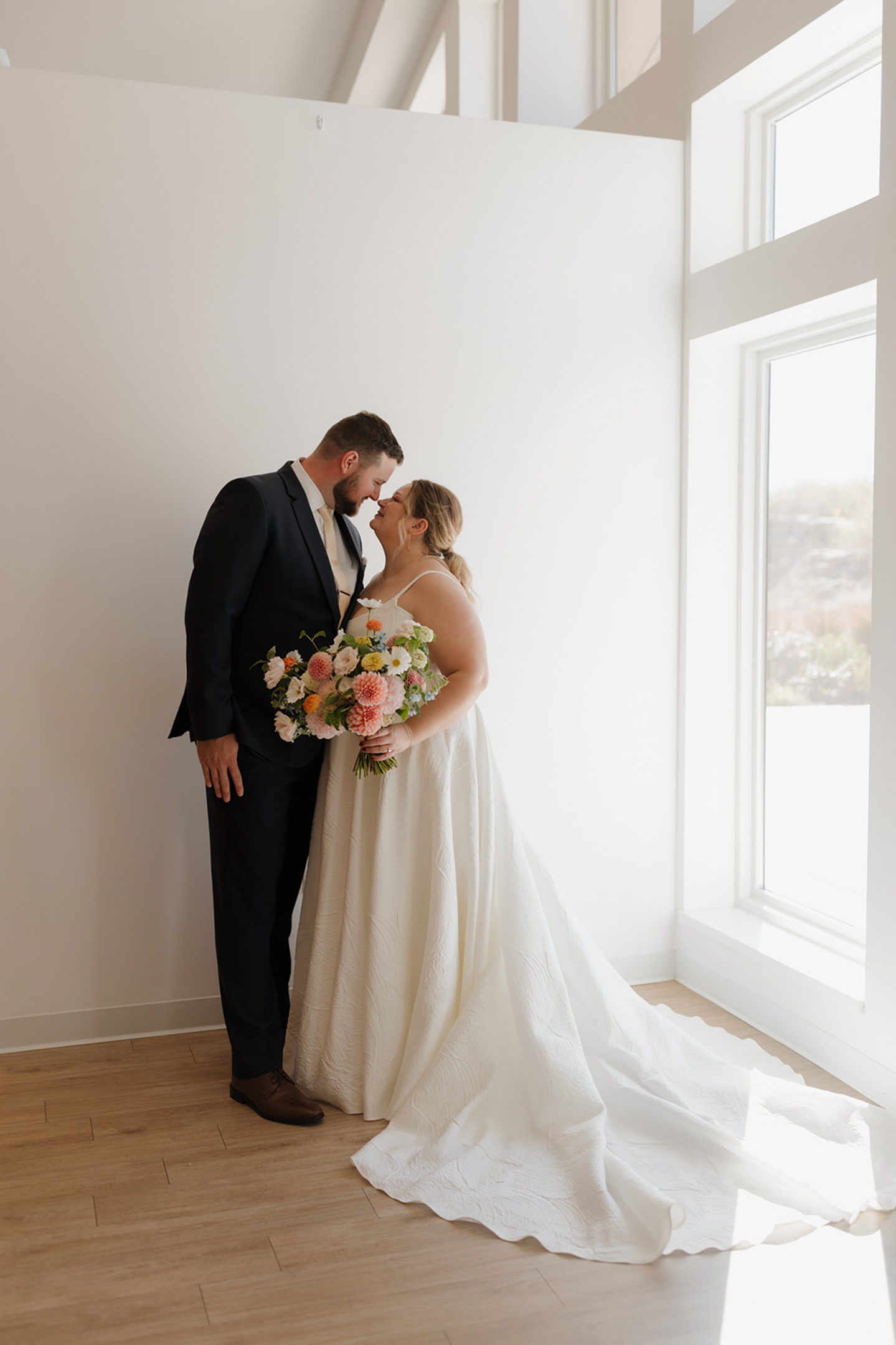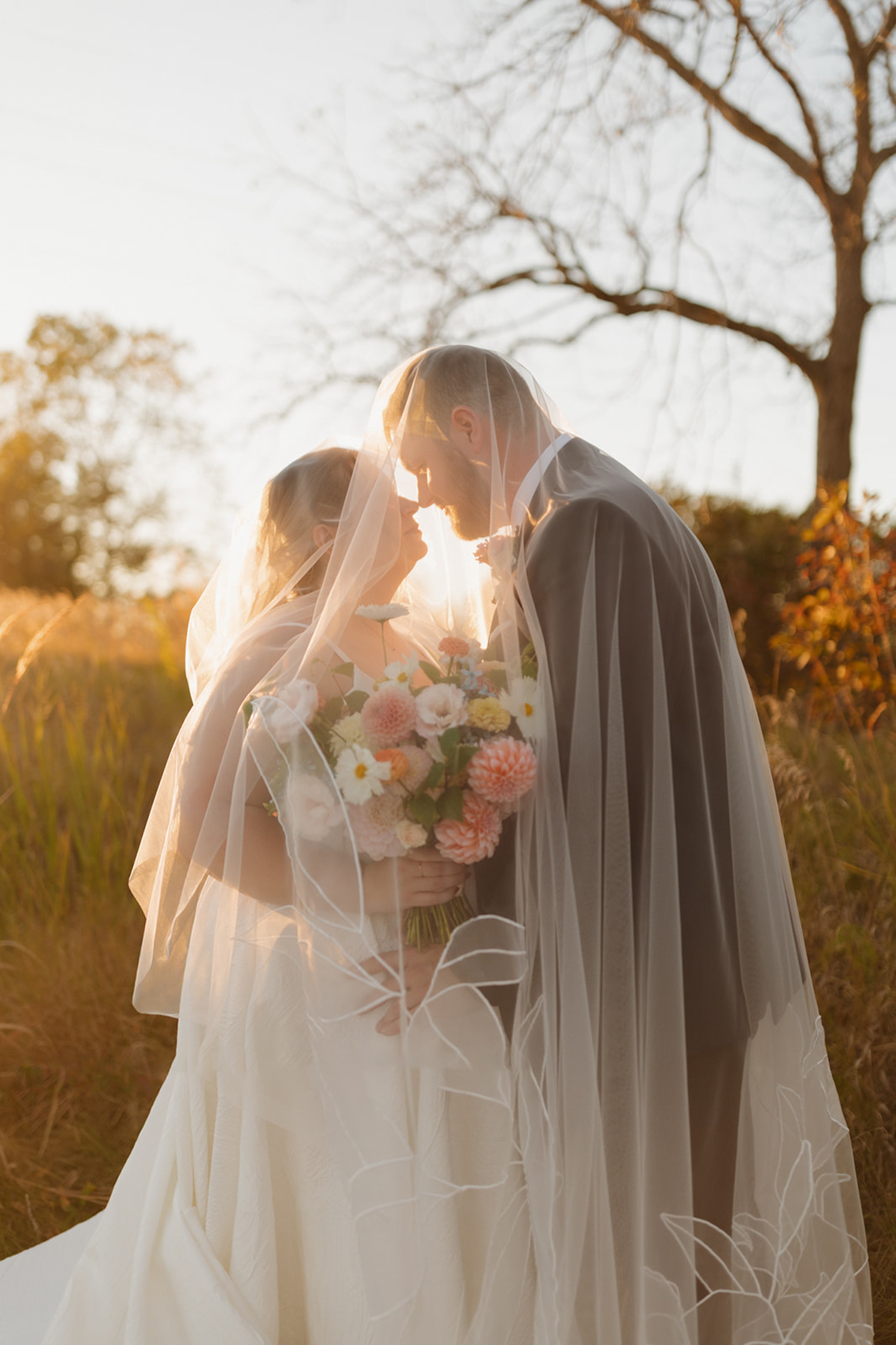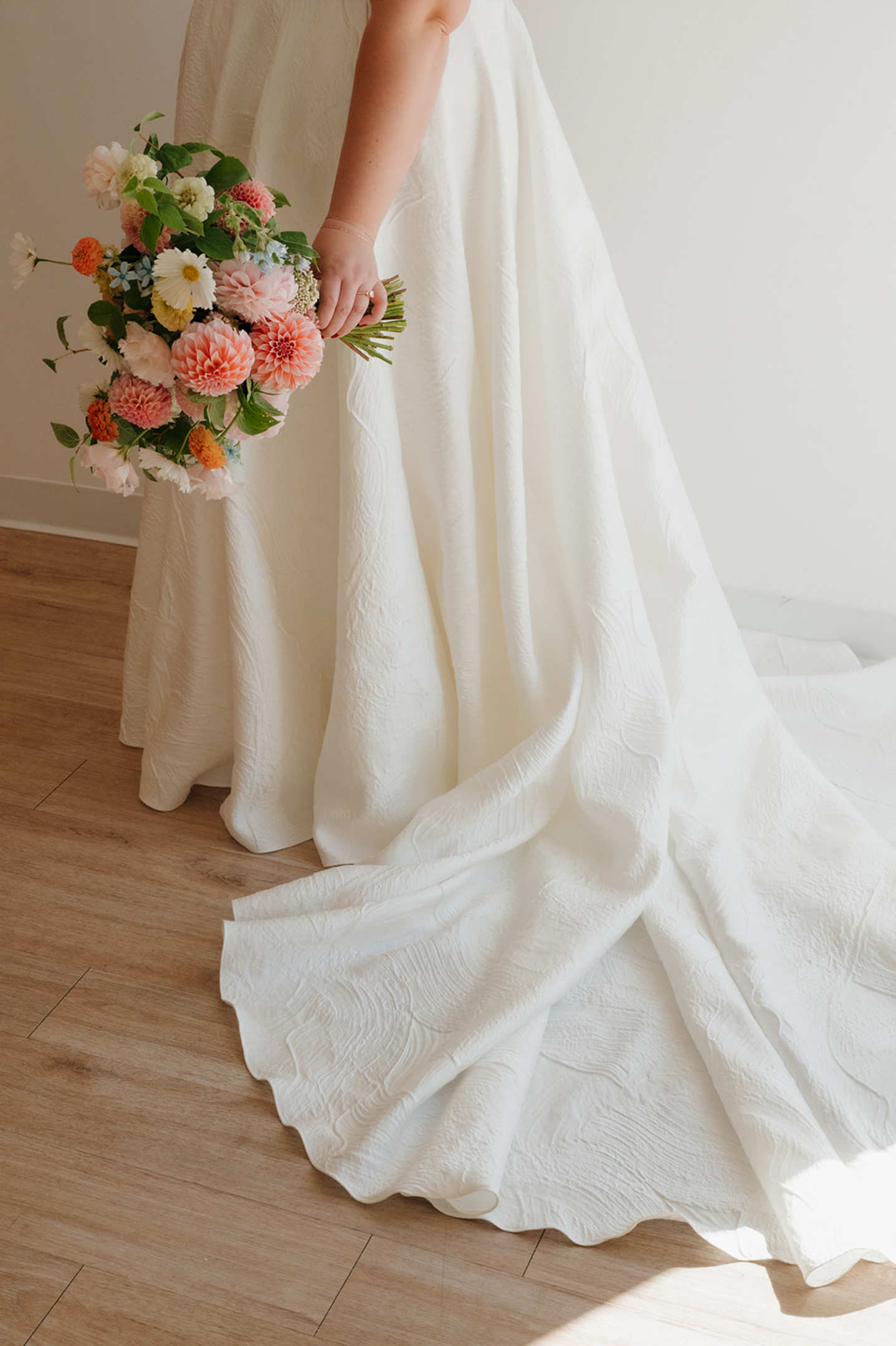 Hannah wore an elegant, textured gown from Strike Bridal Bar. Her hair was loosely curled and pulled back into a stylish low ponytail, with shorter pieces framing her face. A luxurious, chapel-length tulle veil was also added for the ceremony. Hair and makeup stylist, Rooted Culture, further accentuated Hannah’s natural beauty with a subtle peachy palette for her eyeshadow and blush.