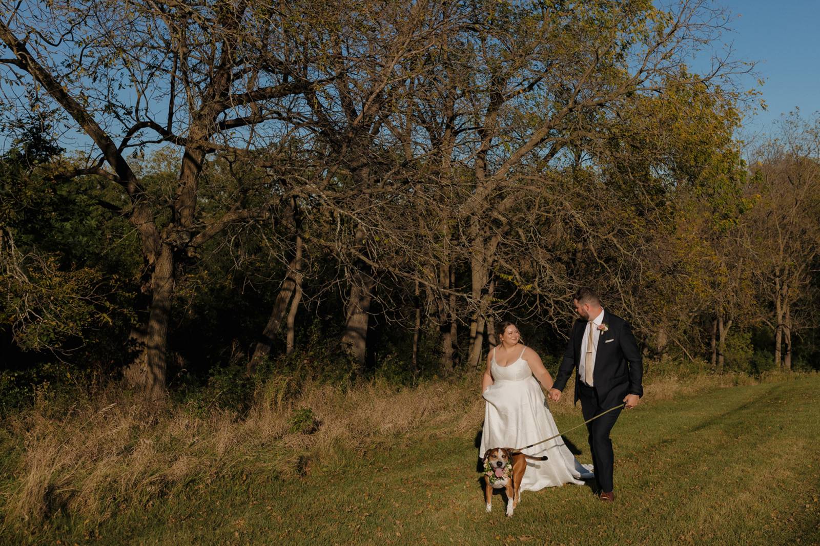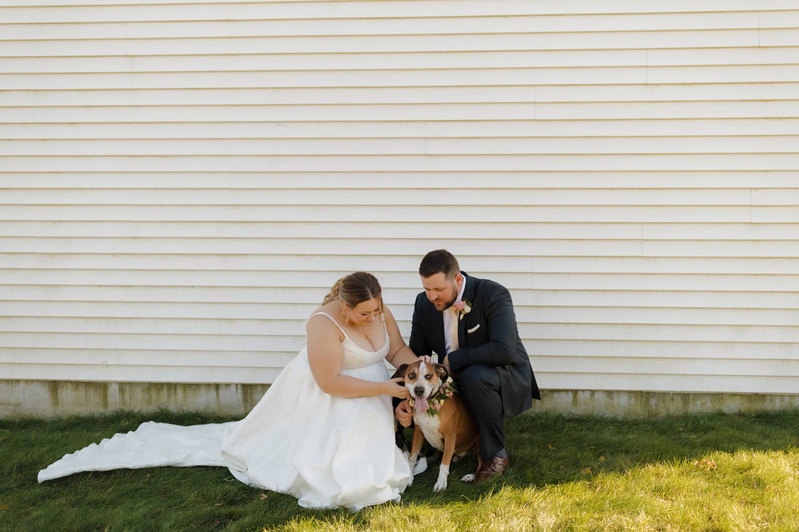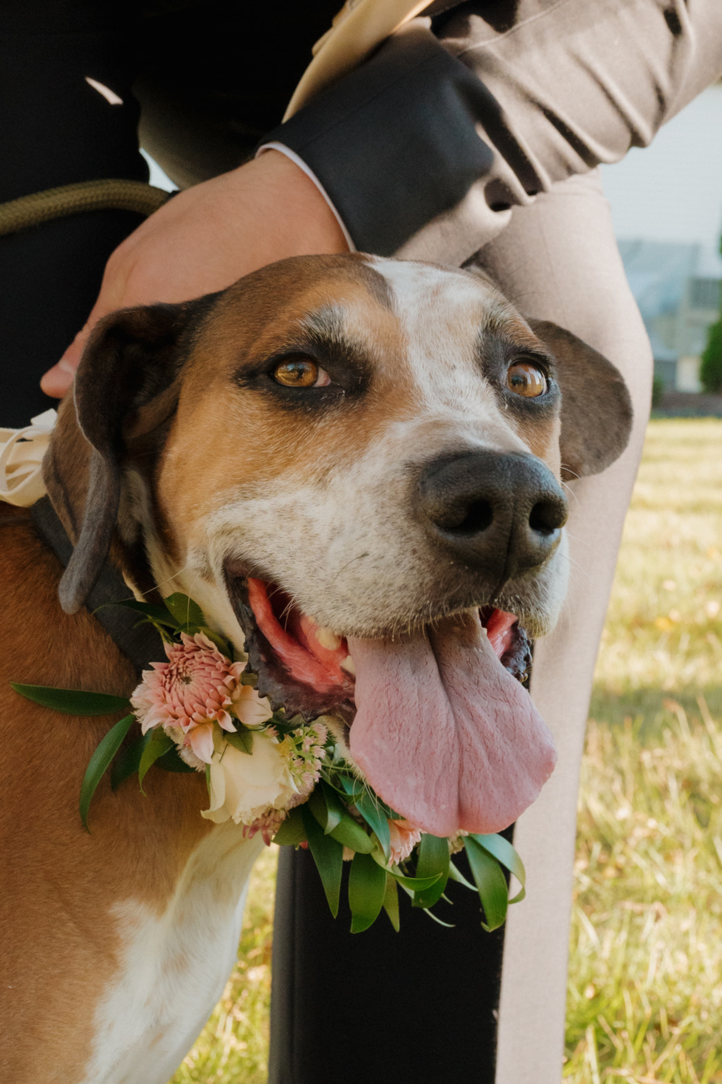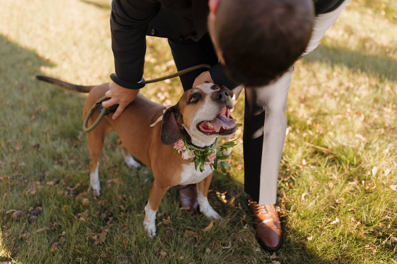 Above all, the couple wanted their wedding to be an event where guests felt comfortable and had fun. This intention especially shined through during the reception, which featured a welcome drink lounge, cocktail hour catering, and many delicious dining and snack options. Hannah and Nathan’s beloved dog, Zeke, was also honored with a custom mule, printed napkins, and even made an in-pet appearance for an outdoor photo op, floral collar and all!