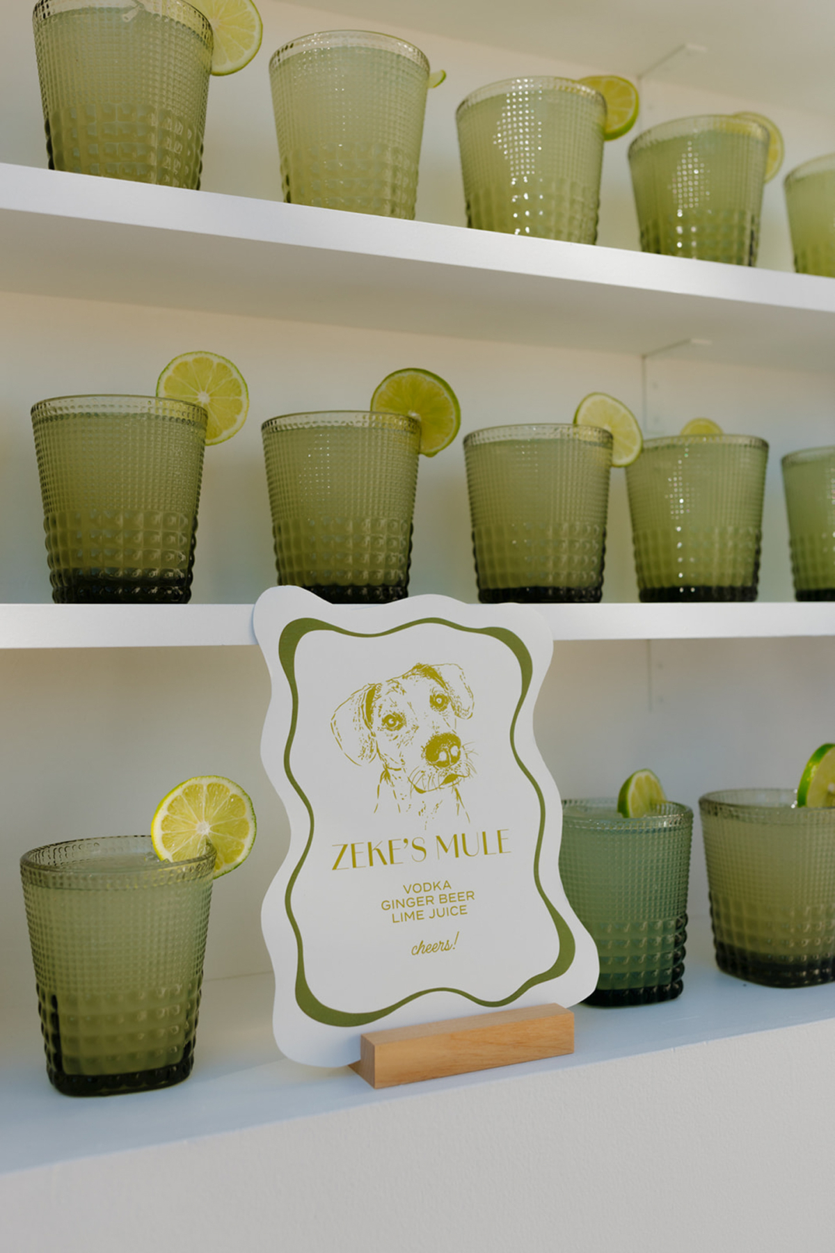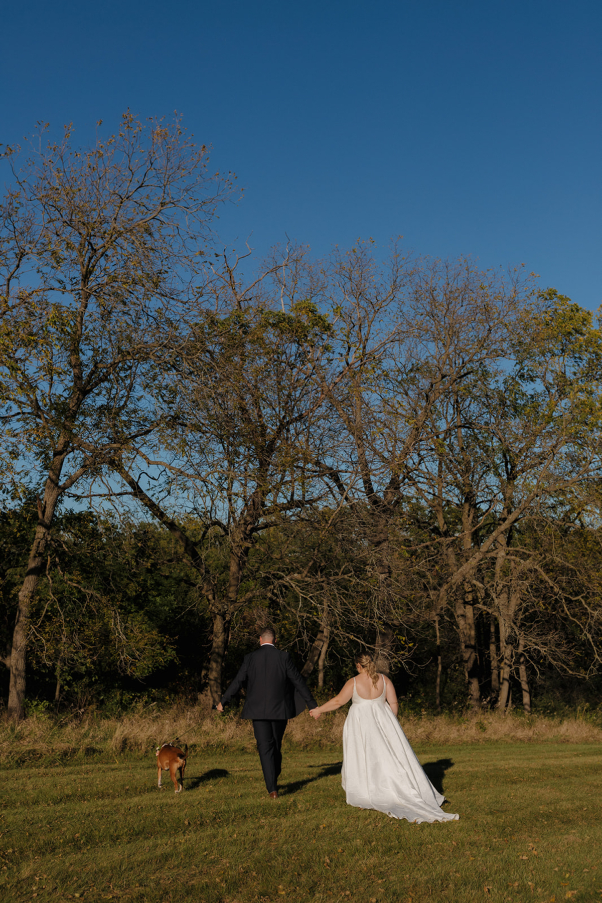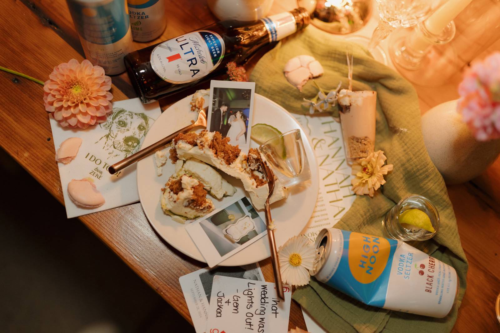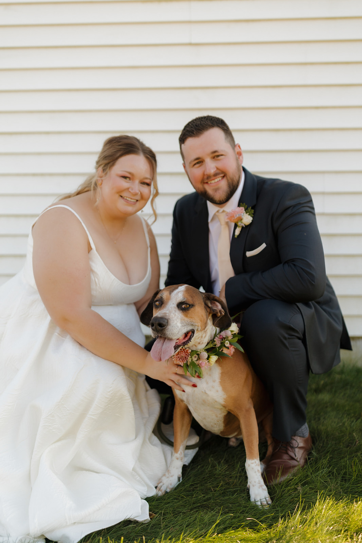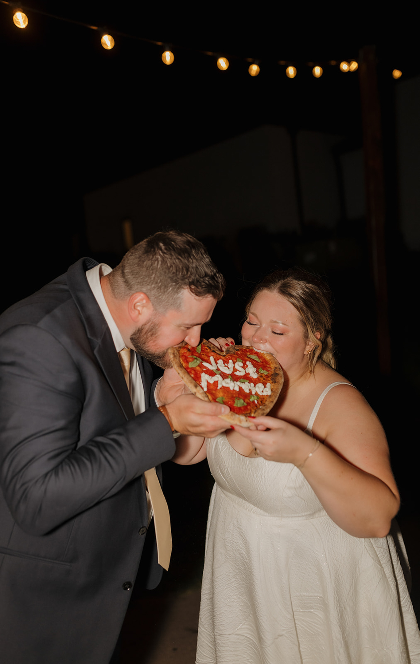 Above all, the couple wanted their wedding to be an event where guests felt comfortable and had fun. This intention especially shined through during the reception, which featured a welcome drink lounge, cocktail hour catering, and many delicious dining and snack options. Hannah and Nathan’s beloved dog, Zeke, was also honored with a custom mule, printed napkins, and even made an in-pet appearance for an outdoor photo op, floral collar and all!