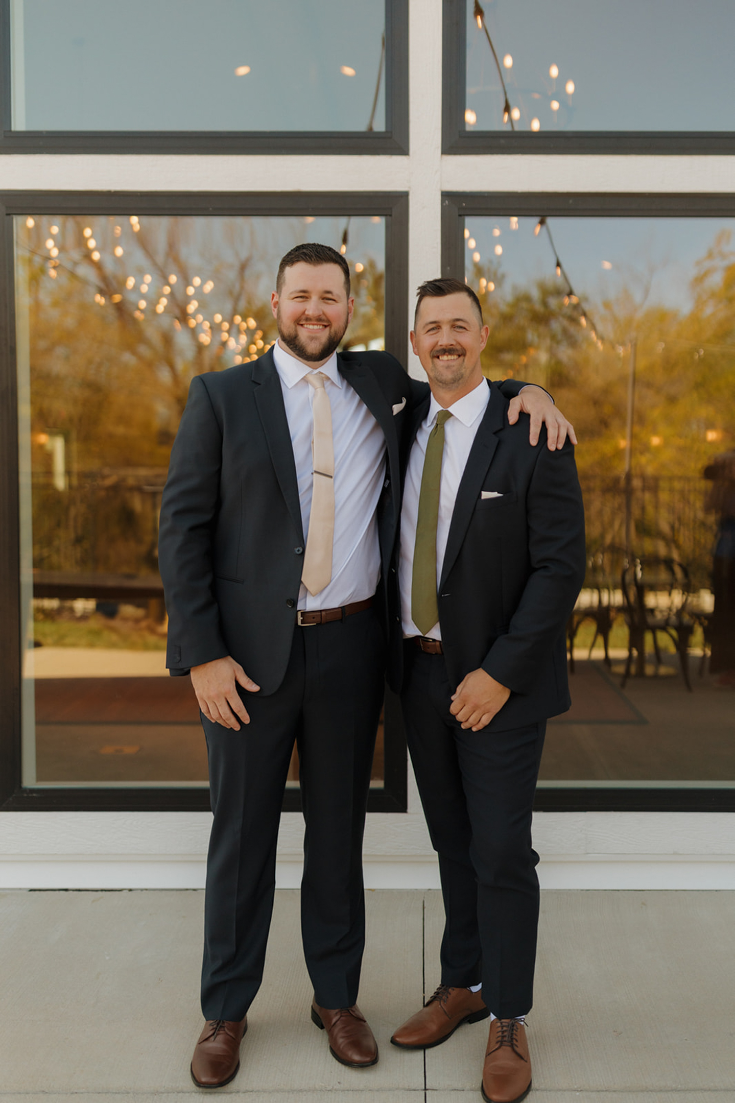 Nathan wore a sharp black suit from The Black Tux, a crisp white undershirt, brown shoes, and a matching satin tie and pocket square.