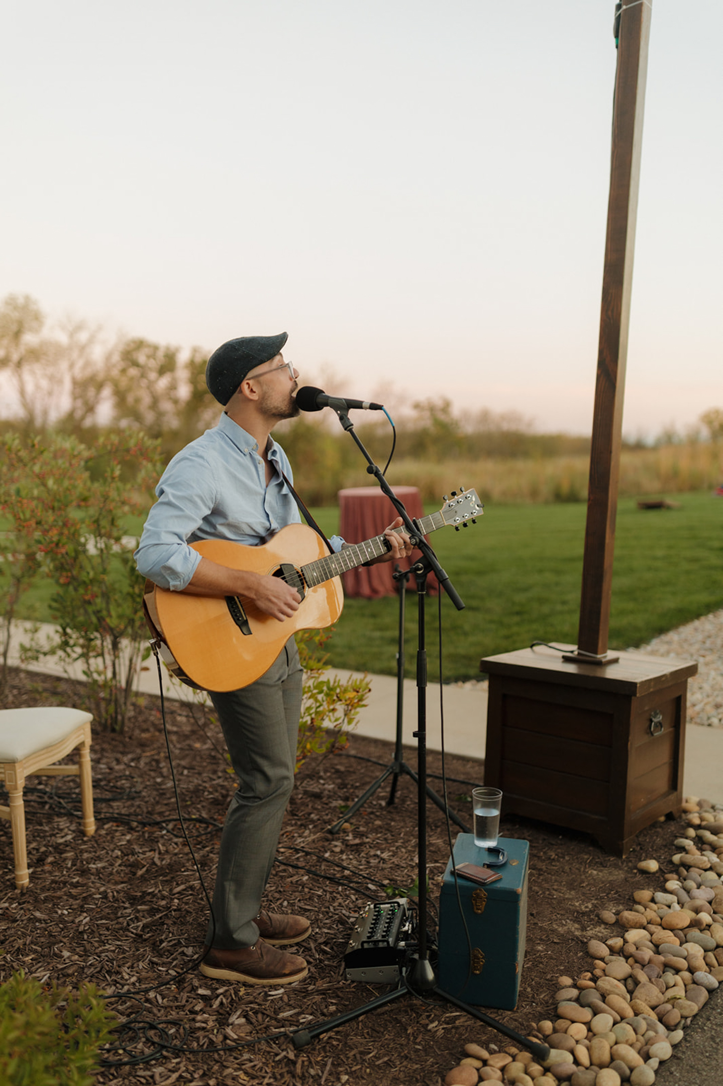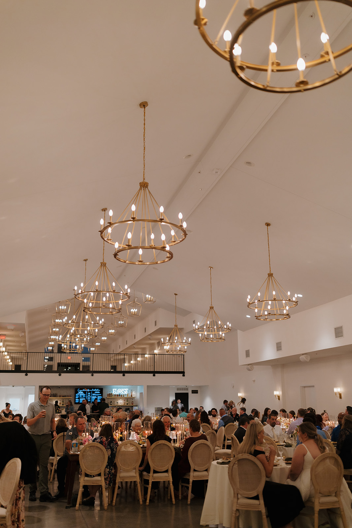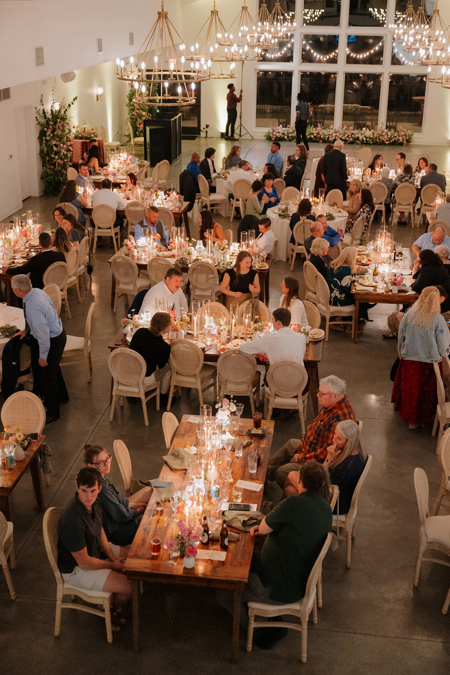 Inside, an escort table made by attaching printed pieces to various cutting boards, then propped on easels, helped guests find their seats. Both Event Essentials and Velvet Rentals helped shape the atmosphere of the celebration. The reception was beautifully arranged and decorated, with warm candlelight and lamps adding another layer of warmth as the sun set and the string lights turned on.