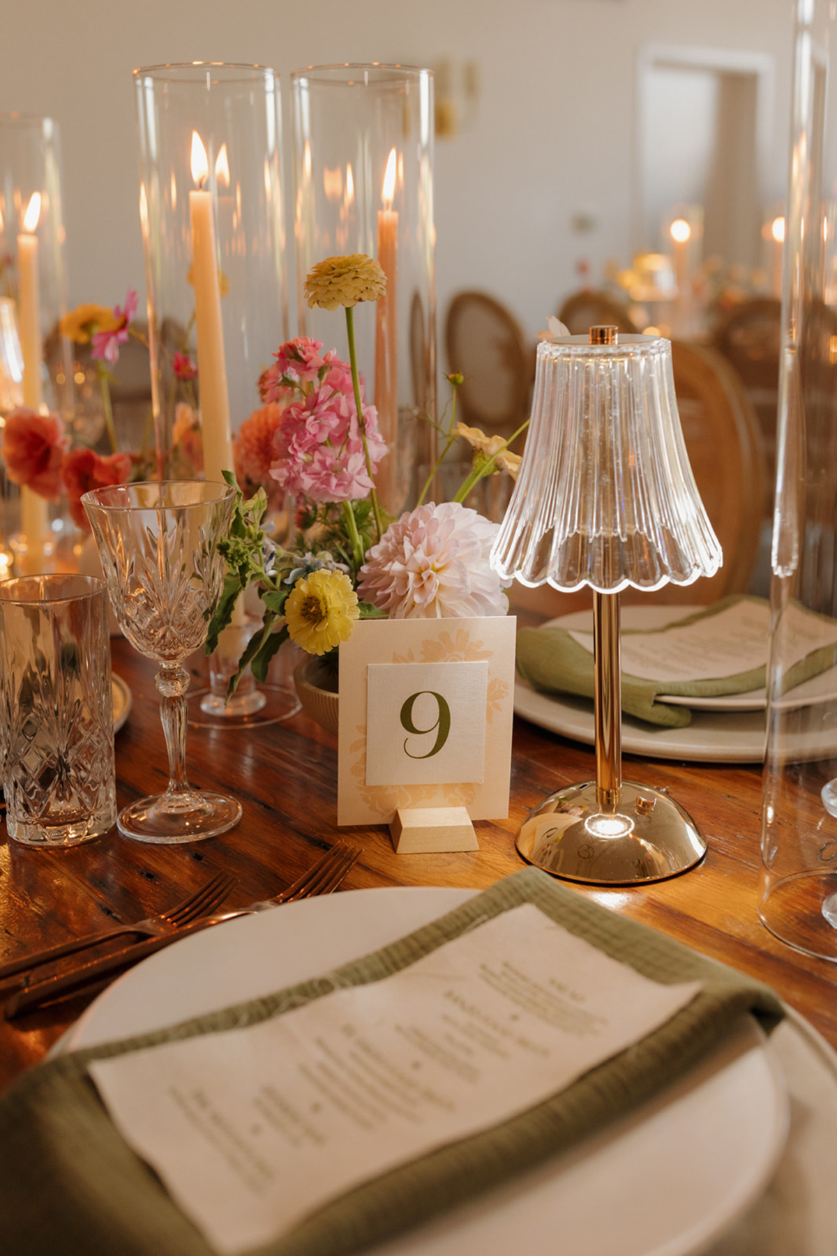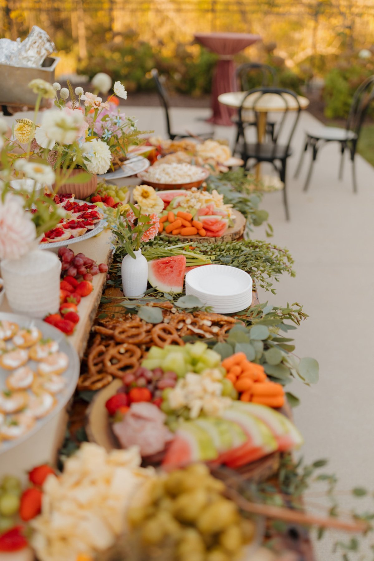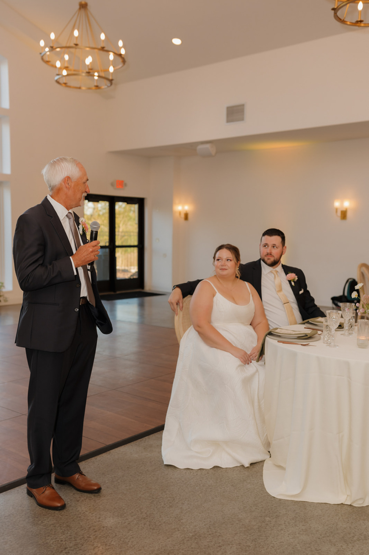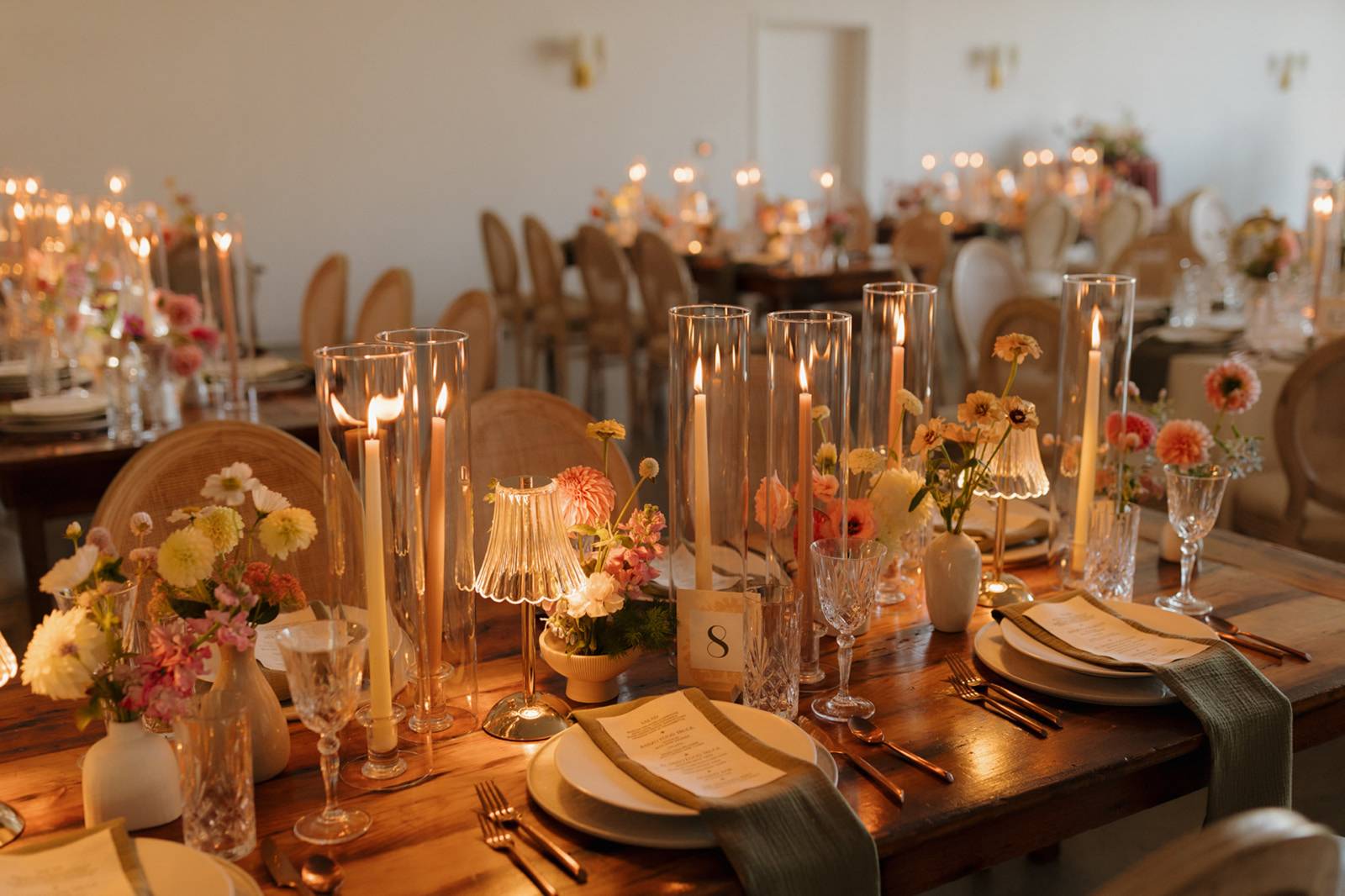 Inside, an escort table made by attaching printed pieces to various cutting boards, then propped on easels, helped guests find their seats. Both Event Essentials and Velvet Rentals helped shape the atmosphere of the celebration. The reception was beautifully arranged and decorated, with warm candlelight and lamps adding another layer of warmth as the sun set and the string lights turned on.
