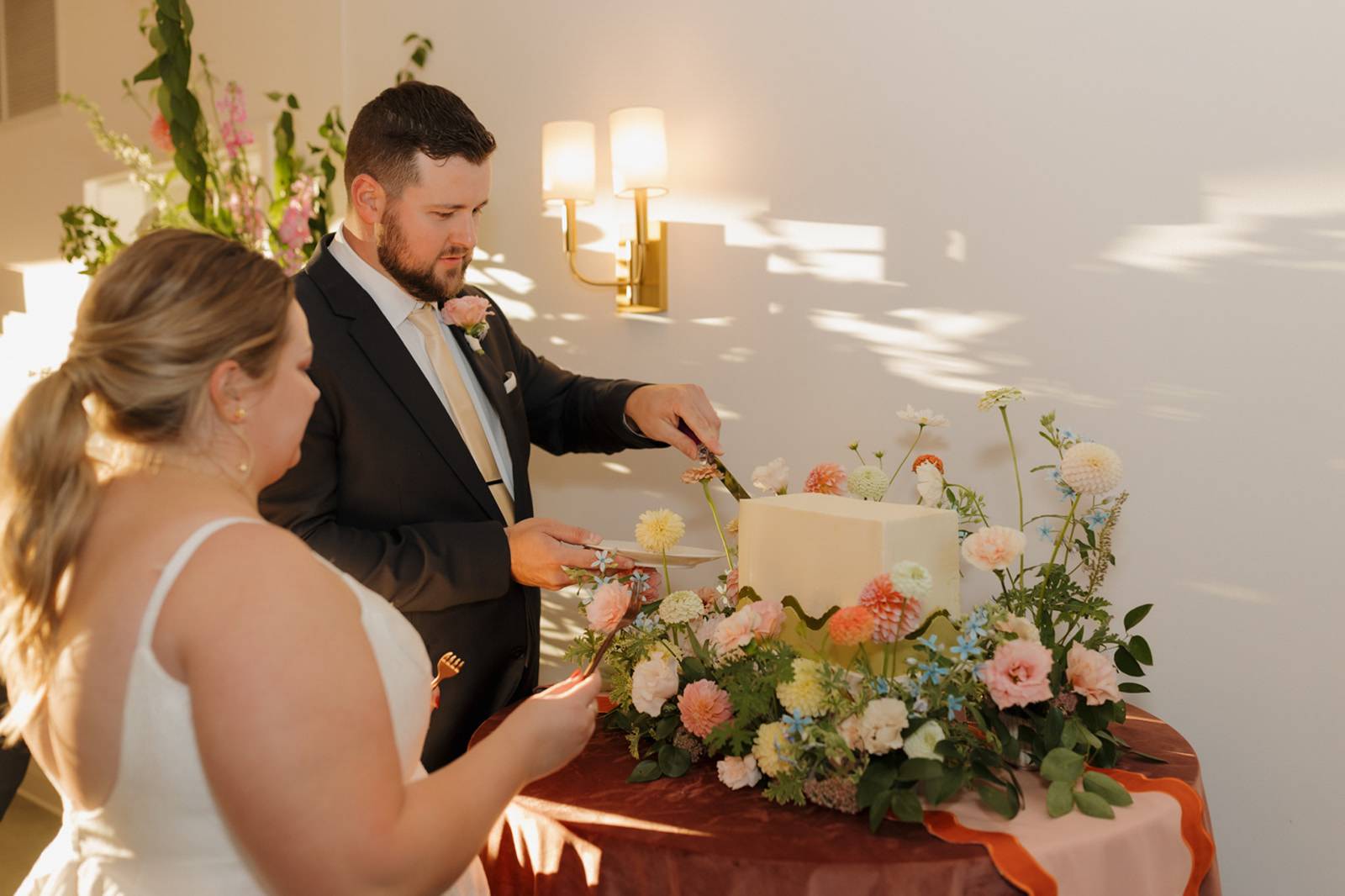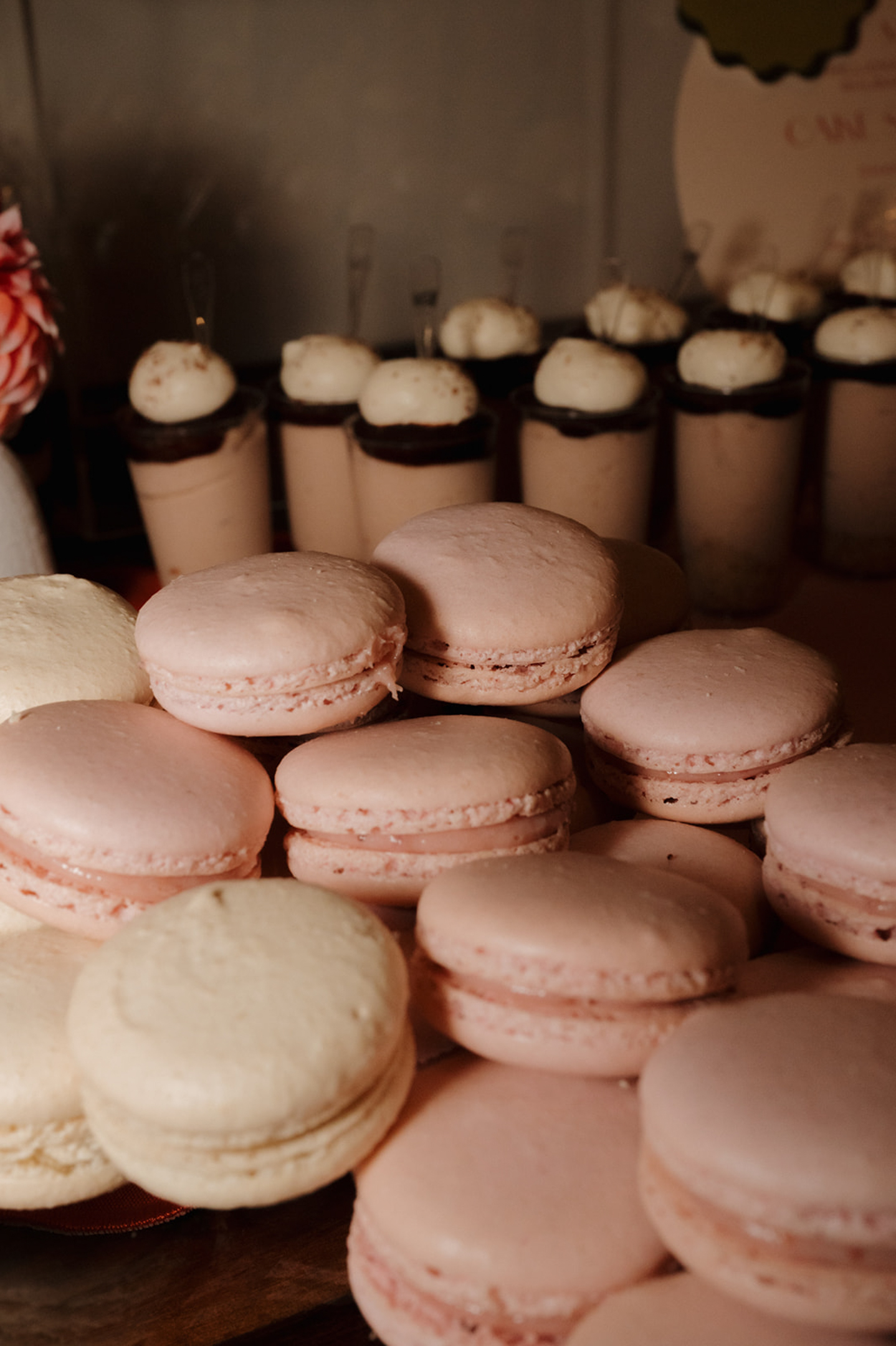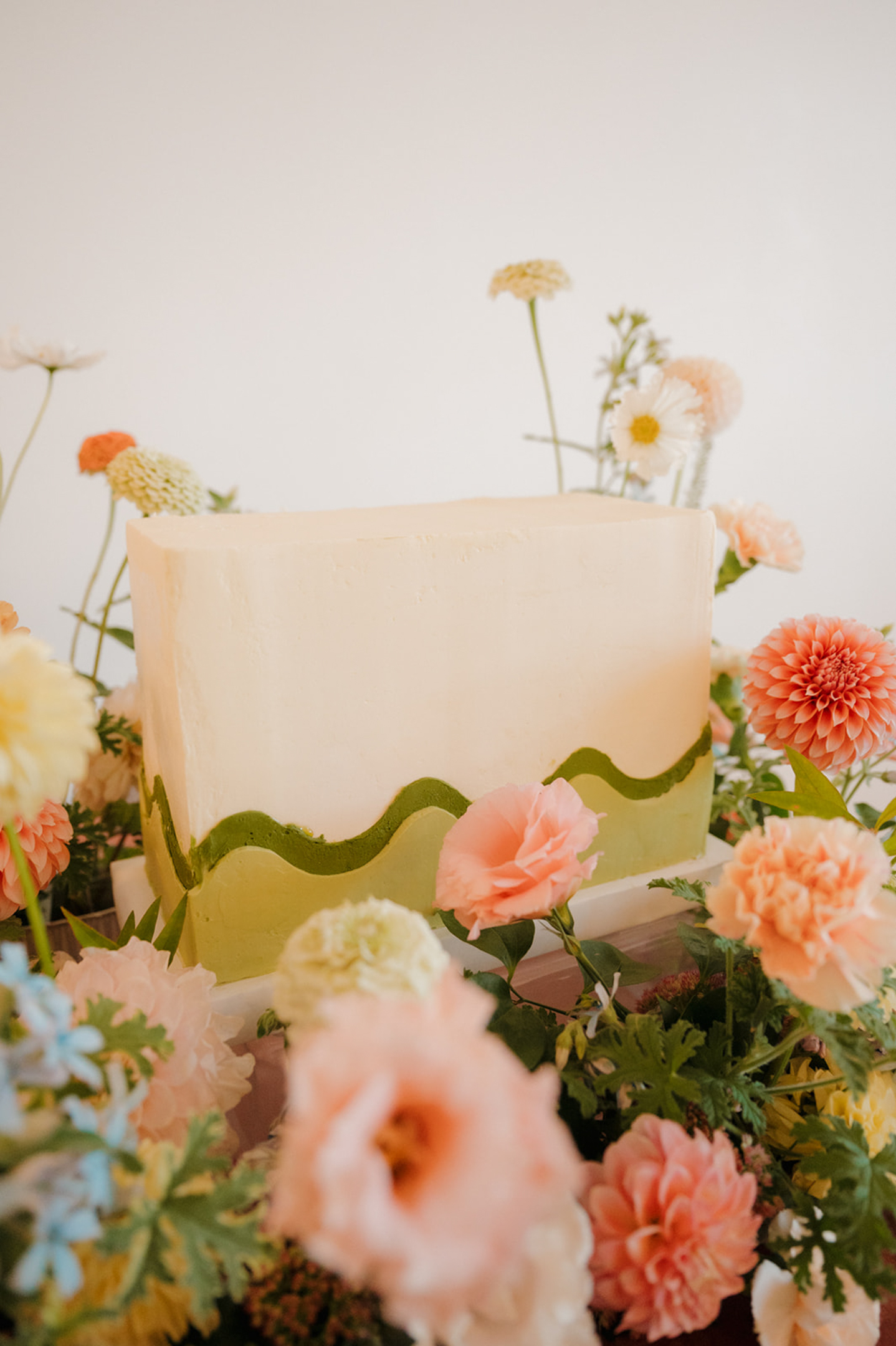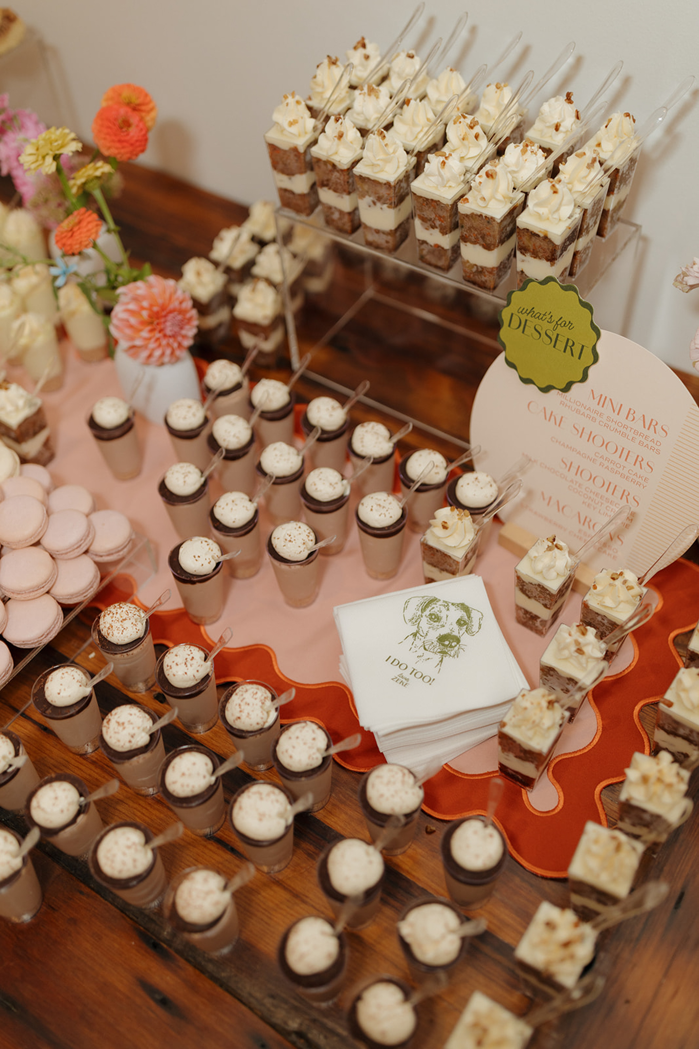 The Baked Lab designed a striking rectangular wedding cake with a funky, two-tone wave design. Other delicious desserts included cake cups and macaroons.
